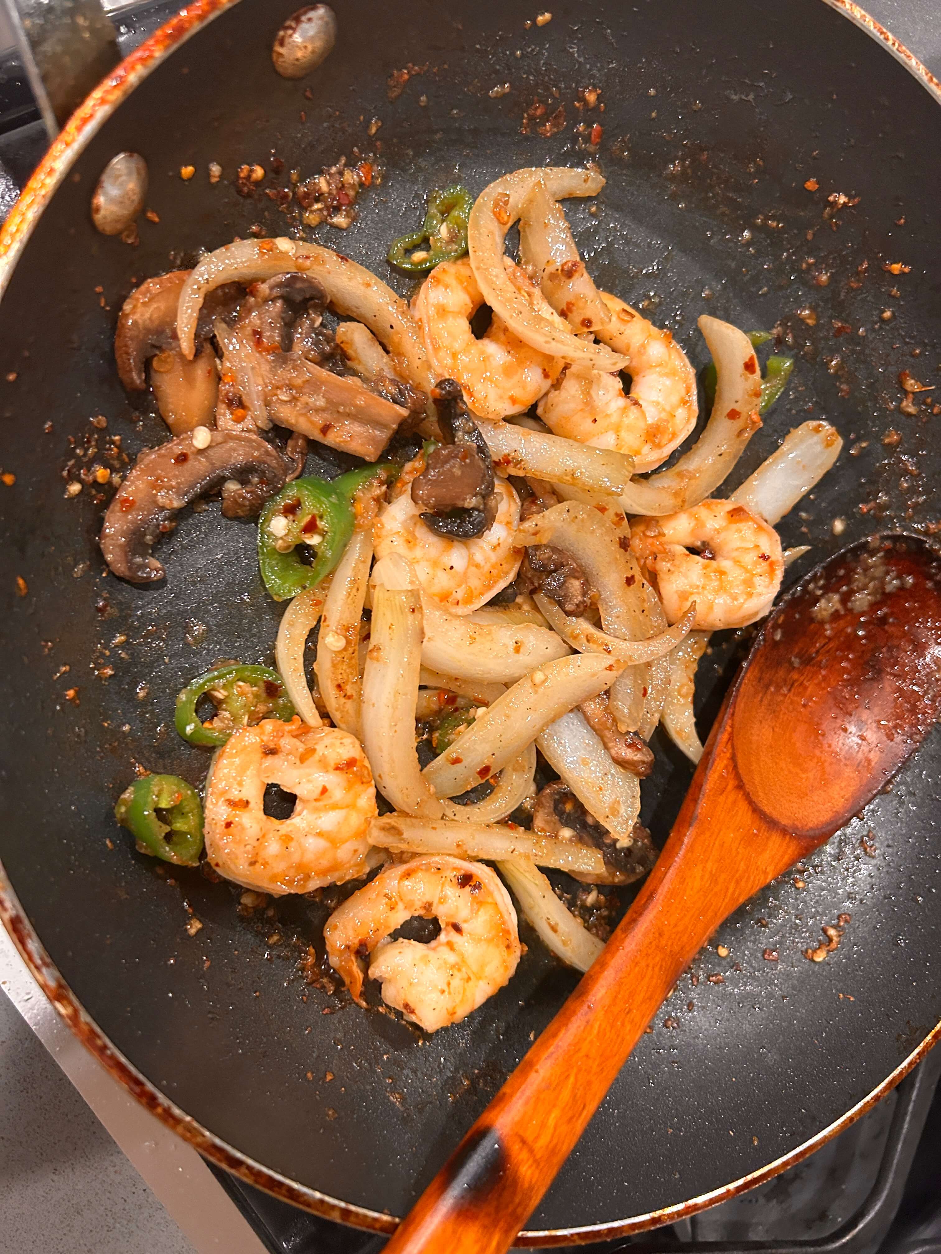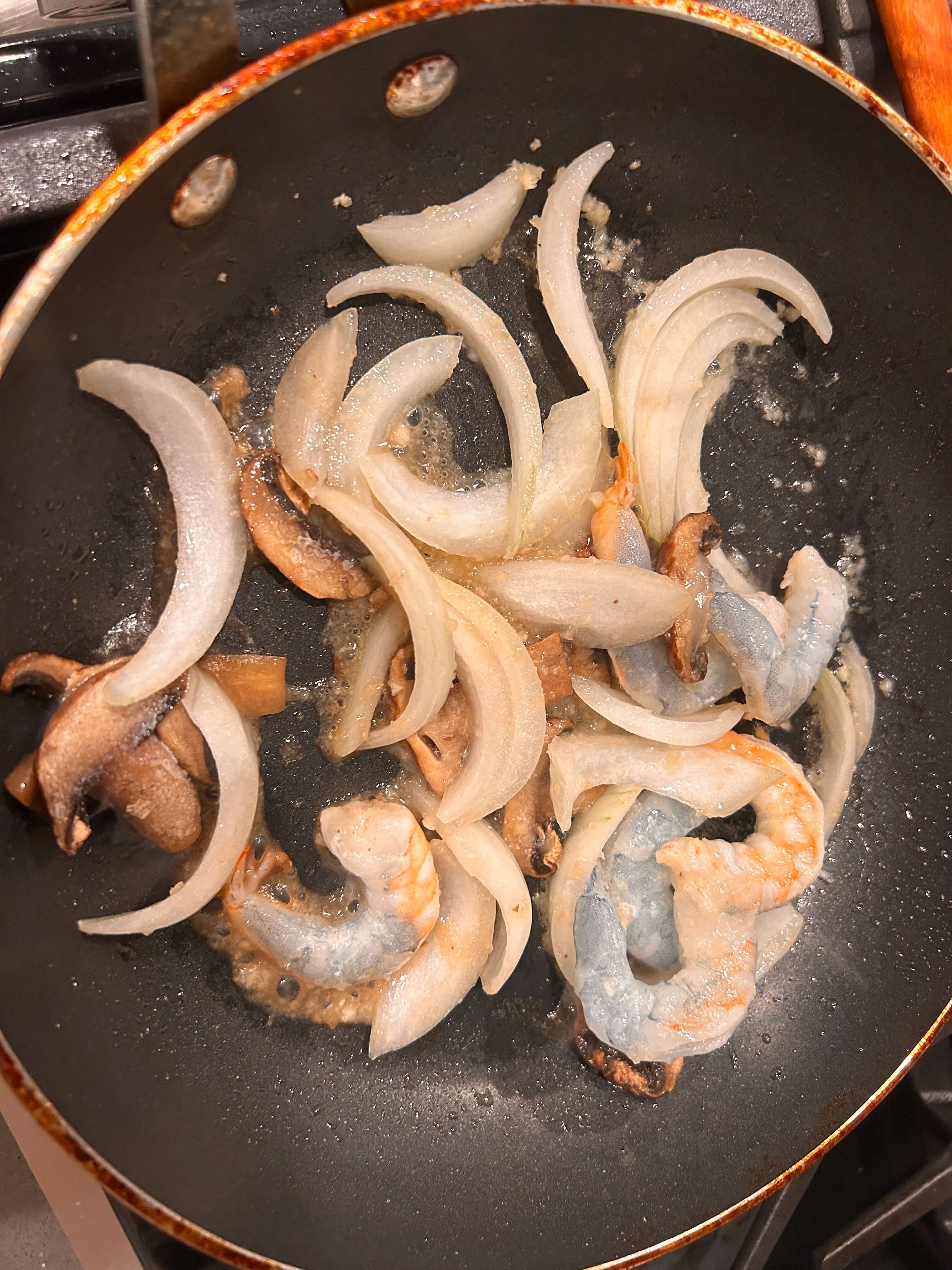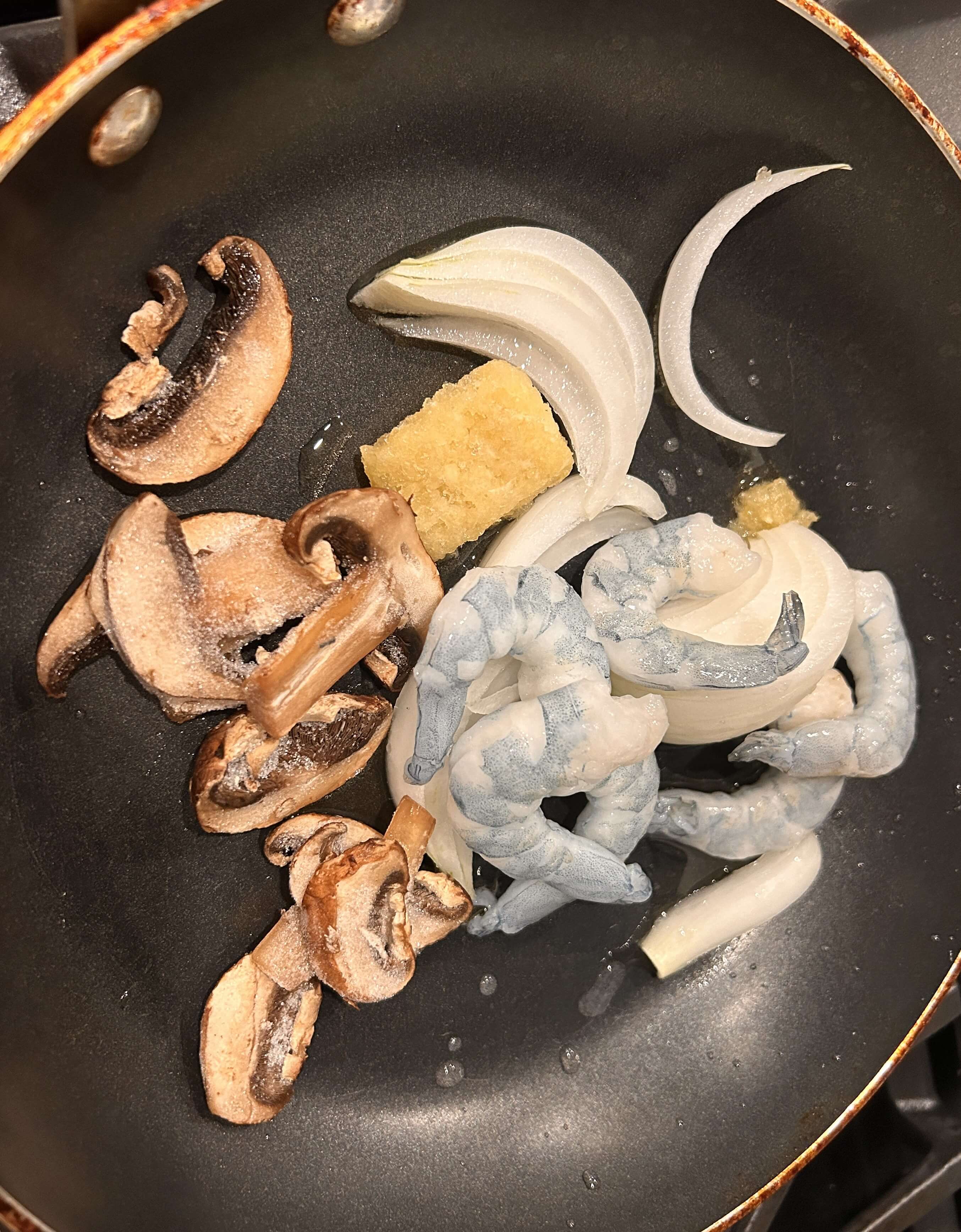 2. 팬에 기름을 두르고 버섯, 양파, 다진 마늘, 새우를 넣어 잘 볶아줍니다.