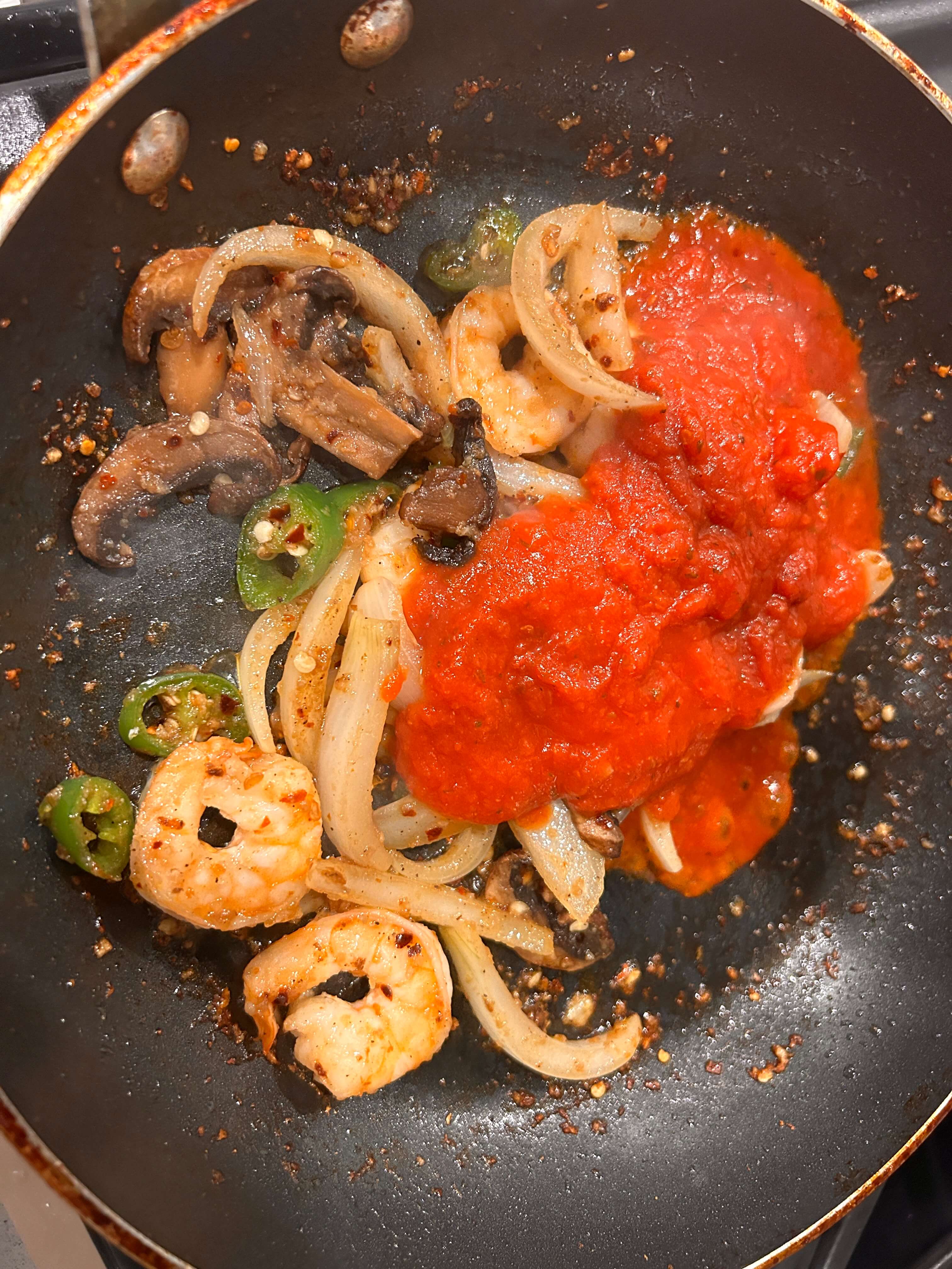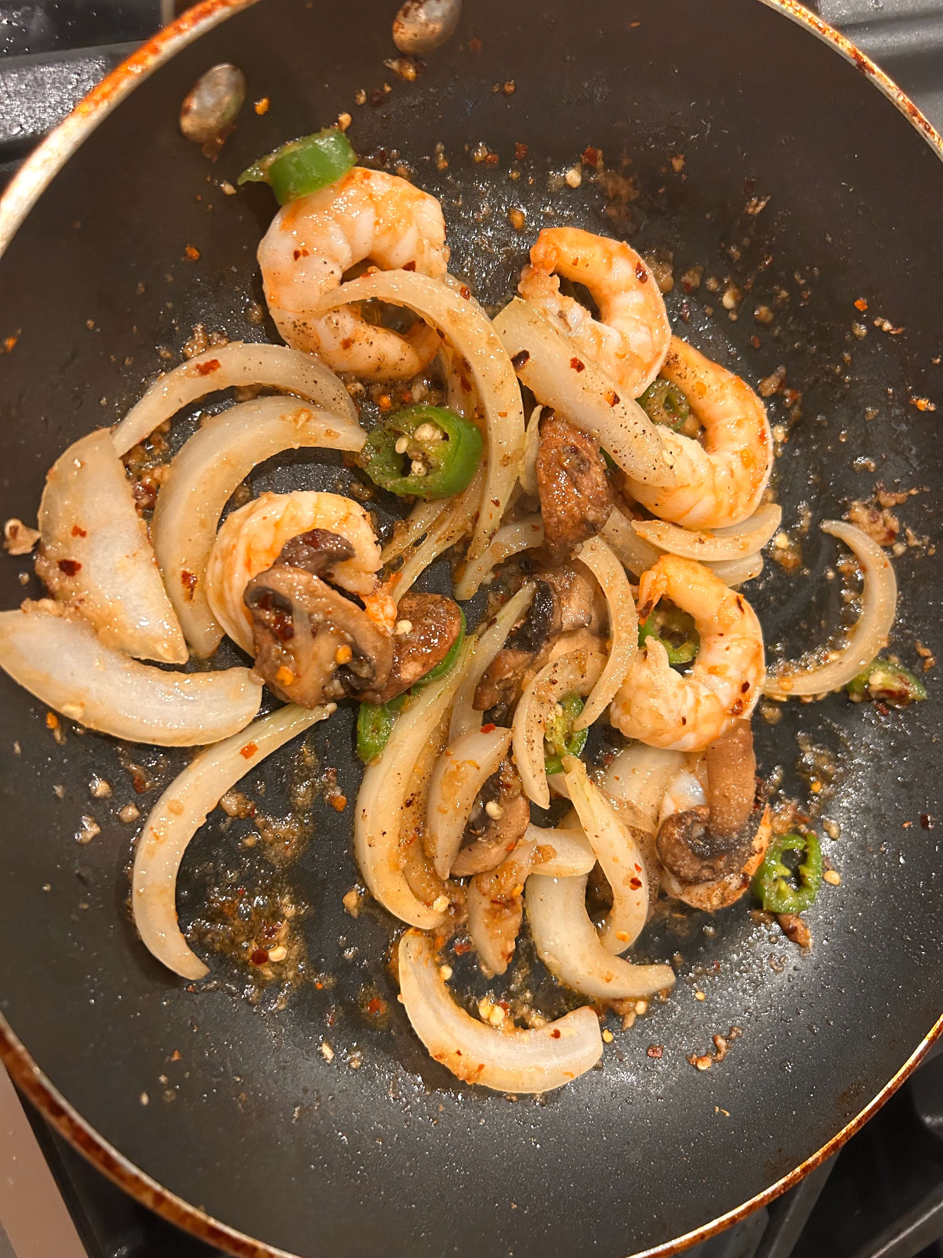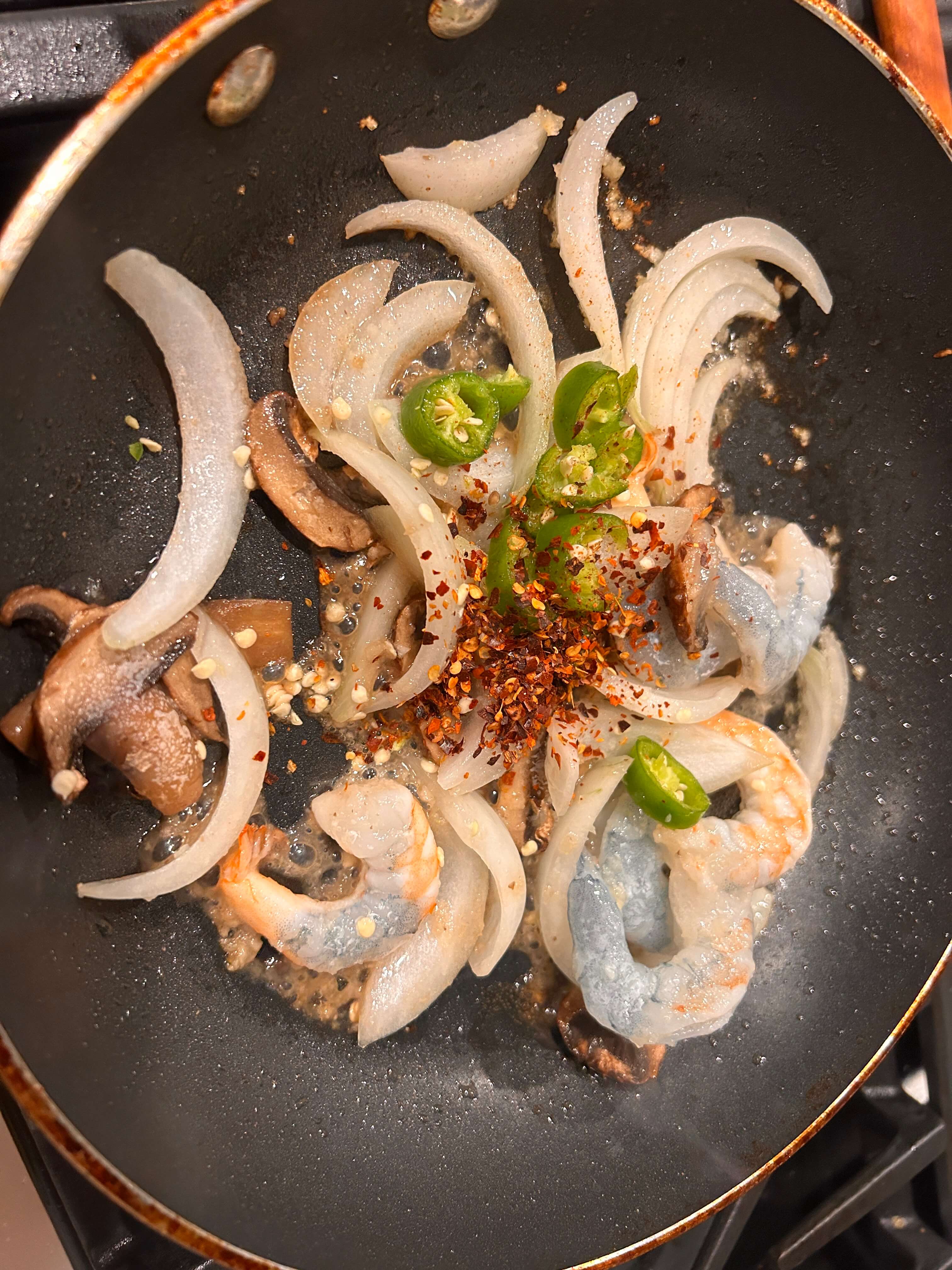 2. 팬에 기름을 두르고 버섯, 양파, 다진 마늘, 새우를 넣어 잘 볶아줍니다.