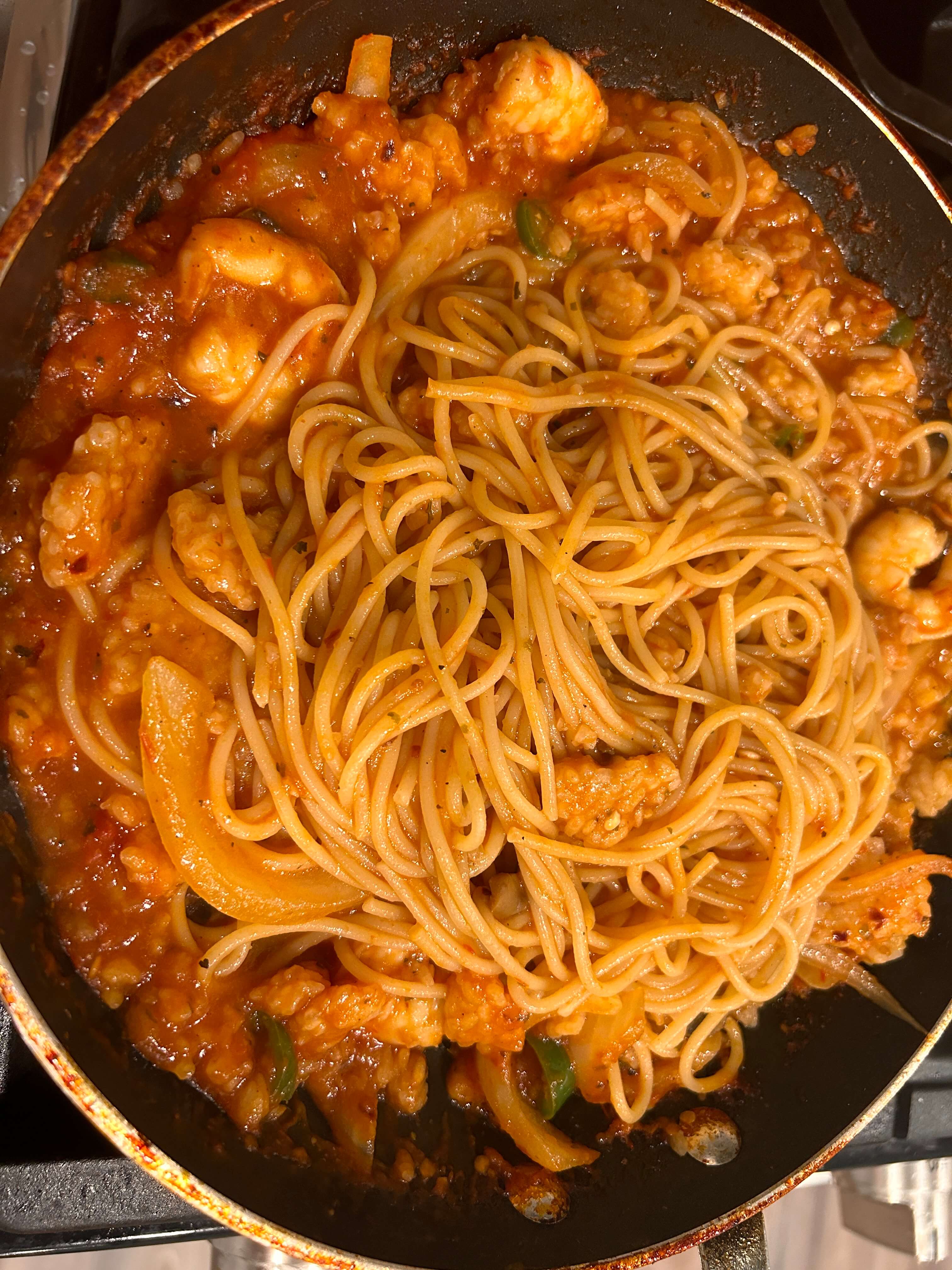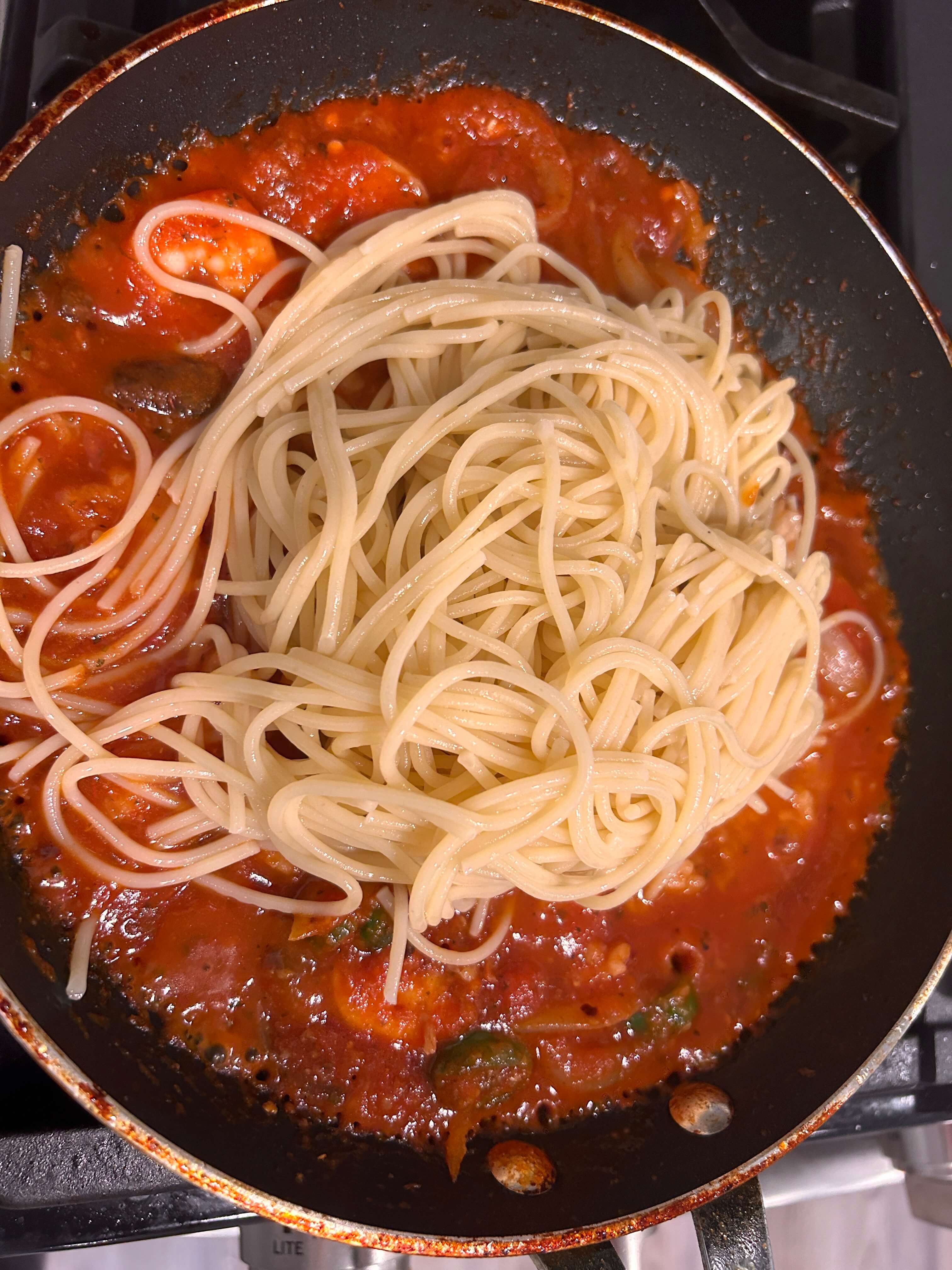 8. 파스타면을 넣어 한번 더 볶아줍니다.