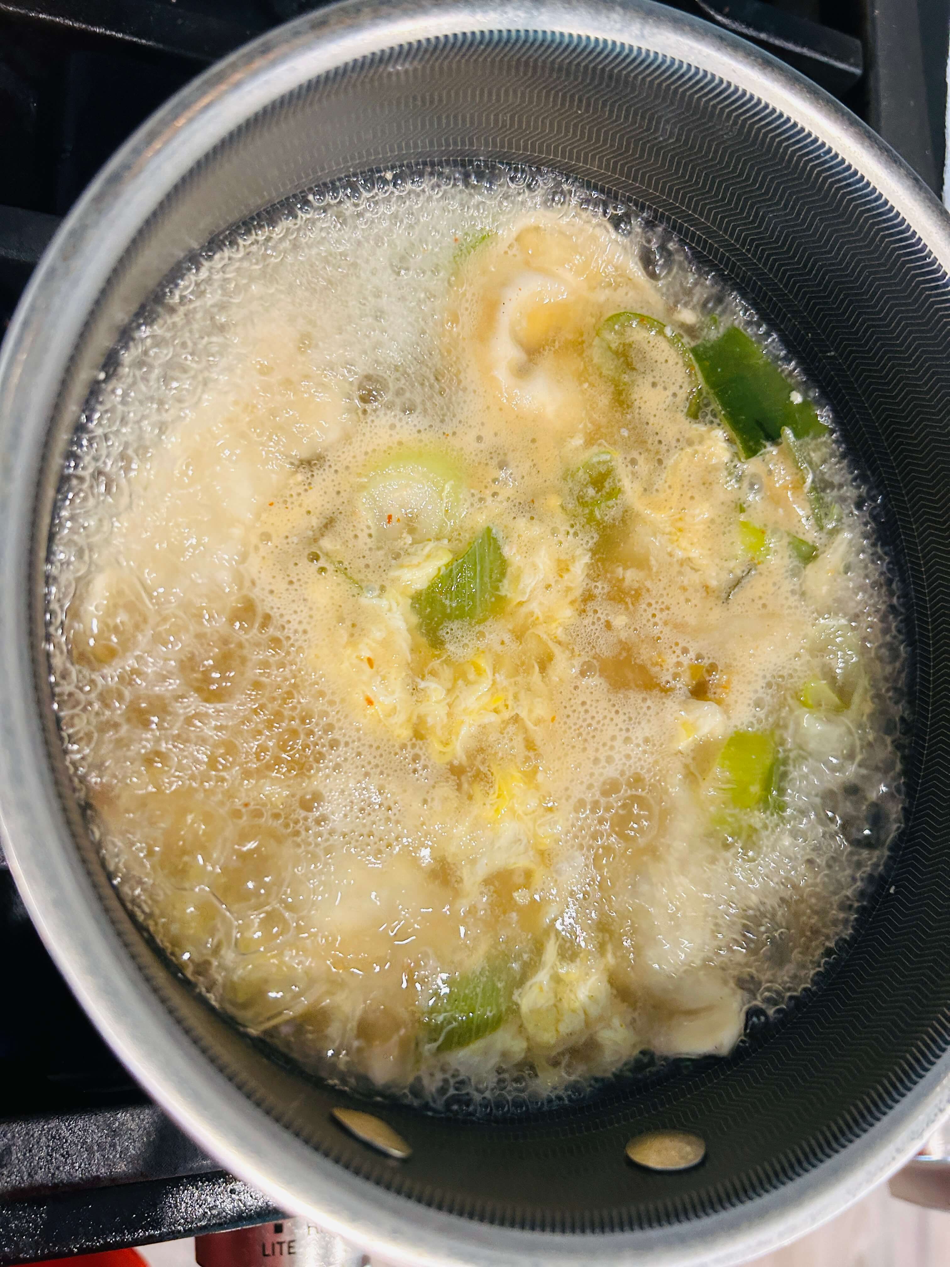 6. 만두가 어느 정도 익을 때쯤에 푼 계란을 끓고 있는 냄비에 넣어 끓여줍니다.