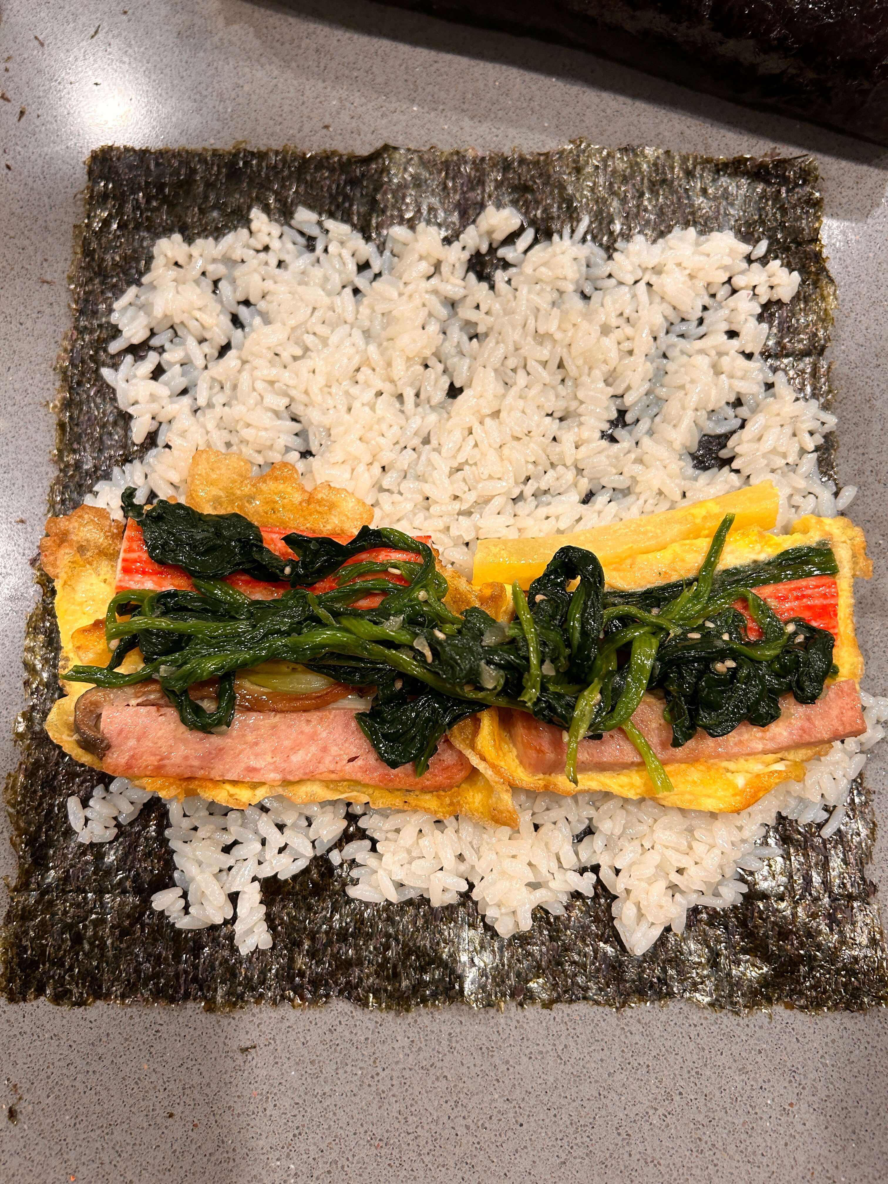 4. 단무지와 시금치를 넣고 잘 싸줍니다.
