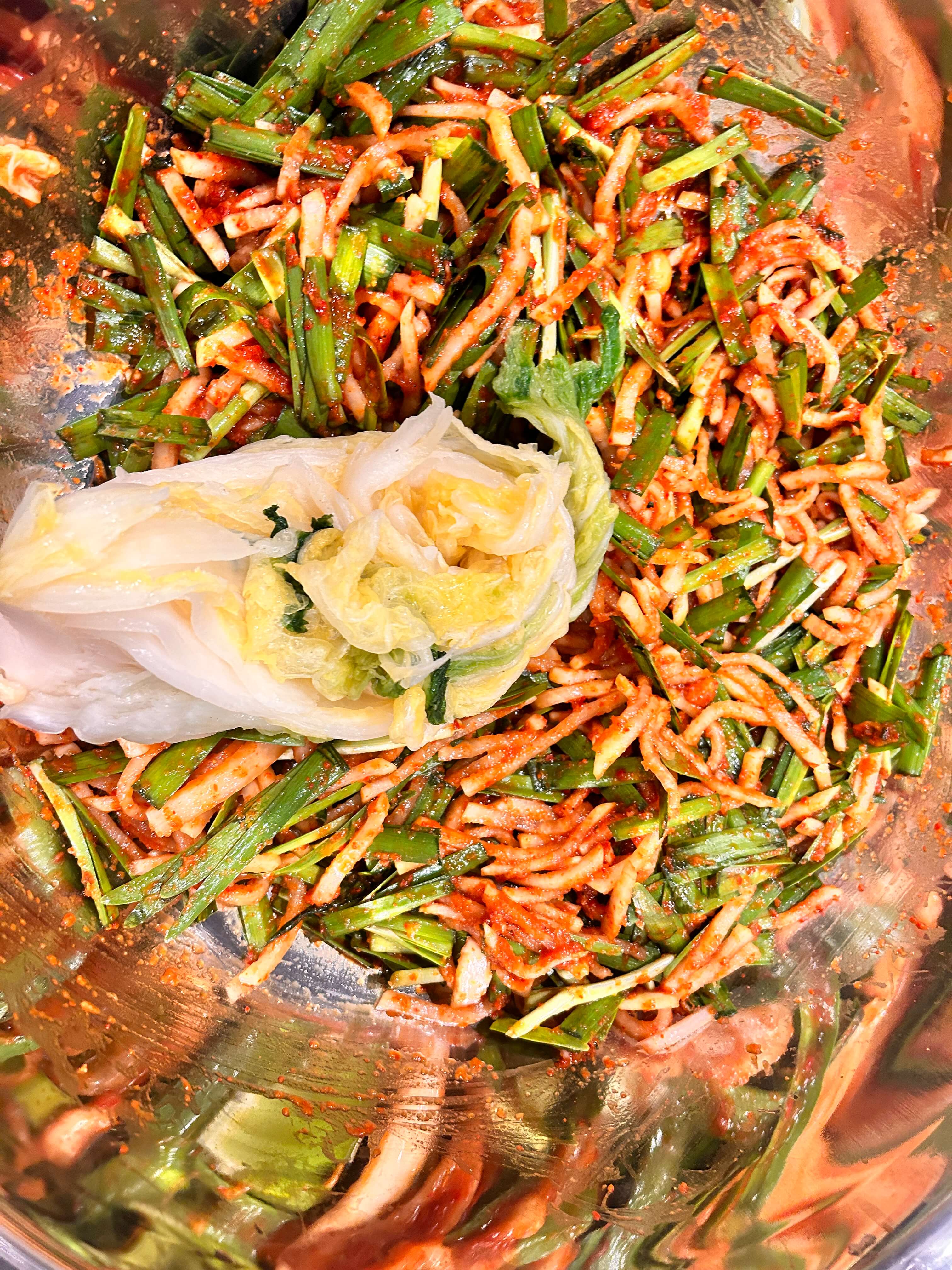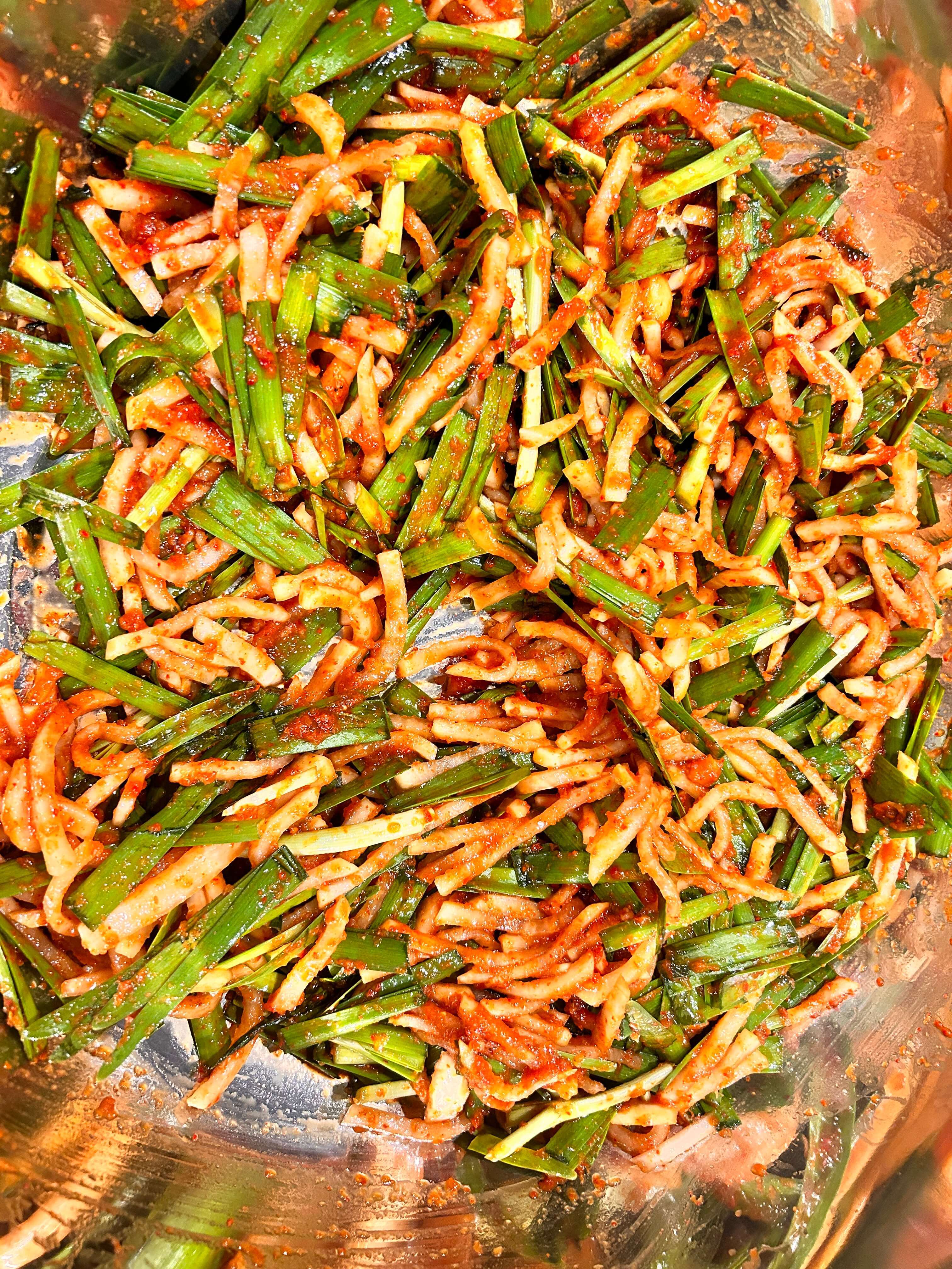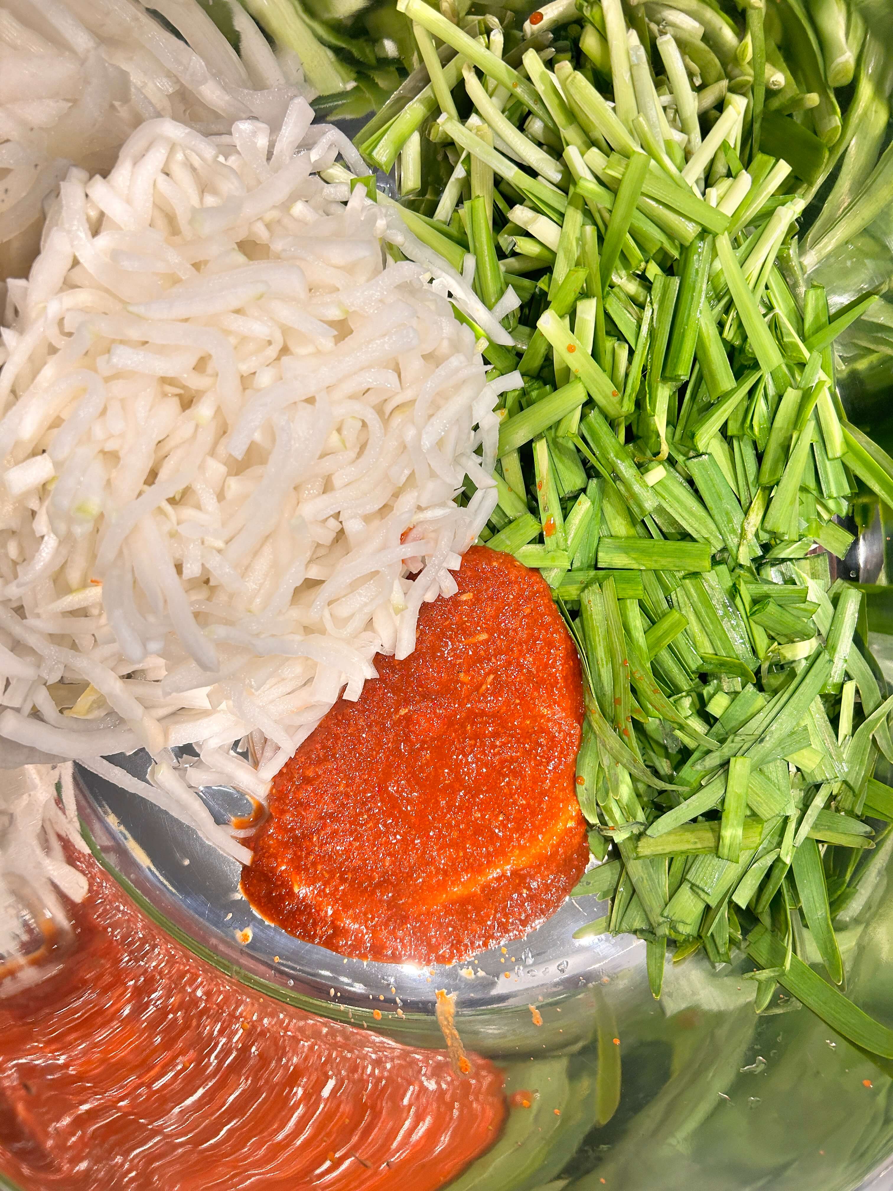 10. 부추와 무를 통에 넣어준 뒤, 양념장을 넣어 잘 버무려 김치 속재료로 만들어 줍니다.