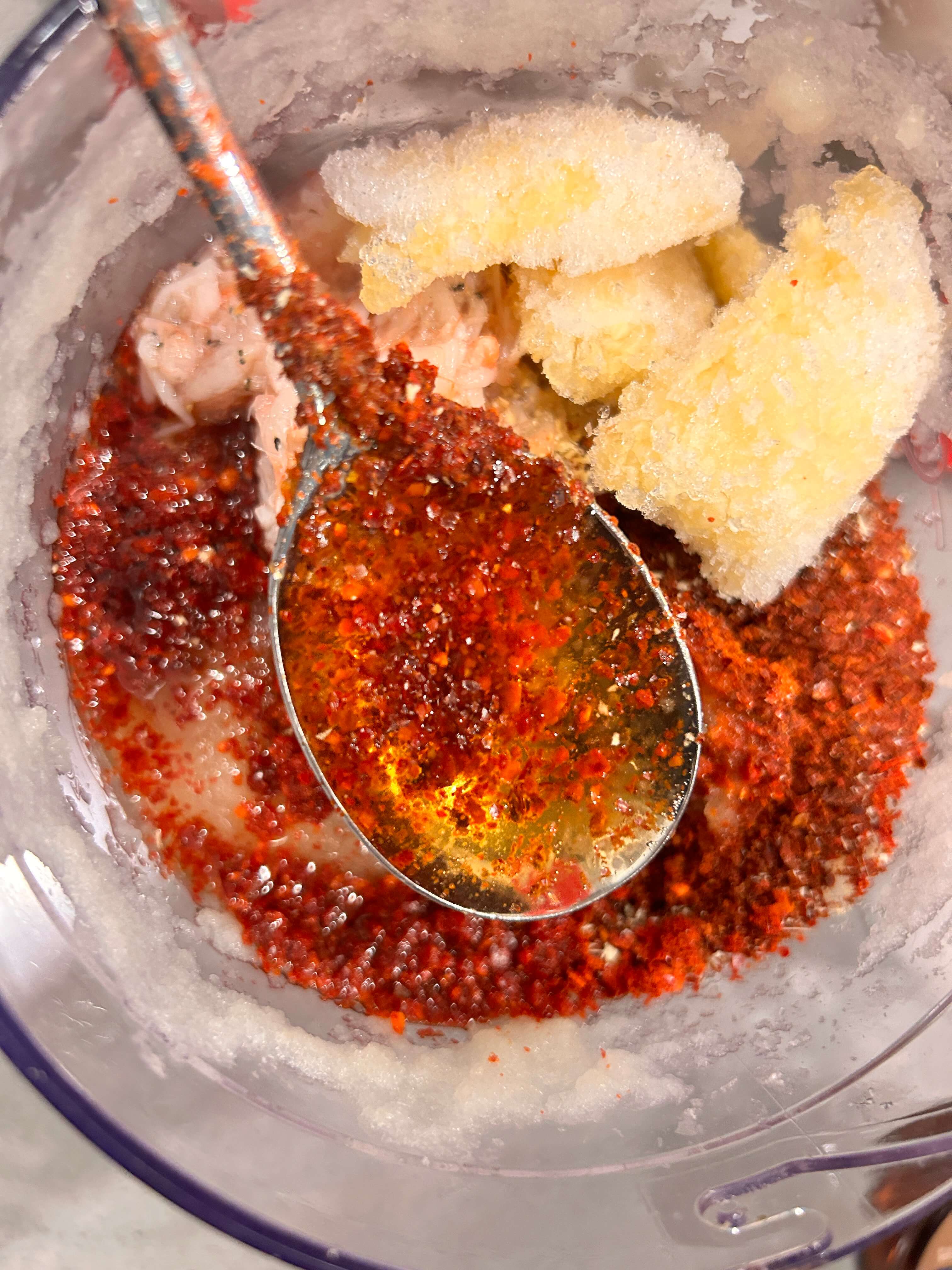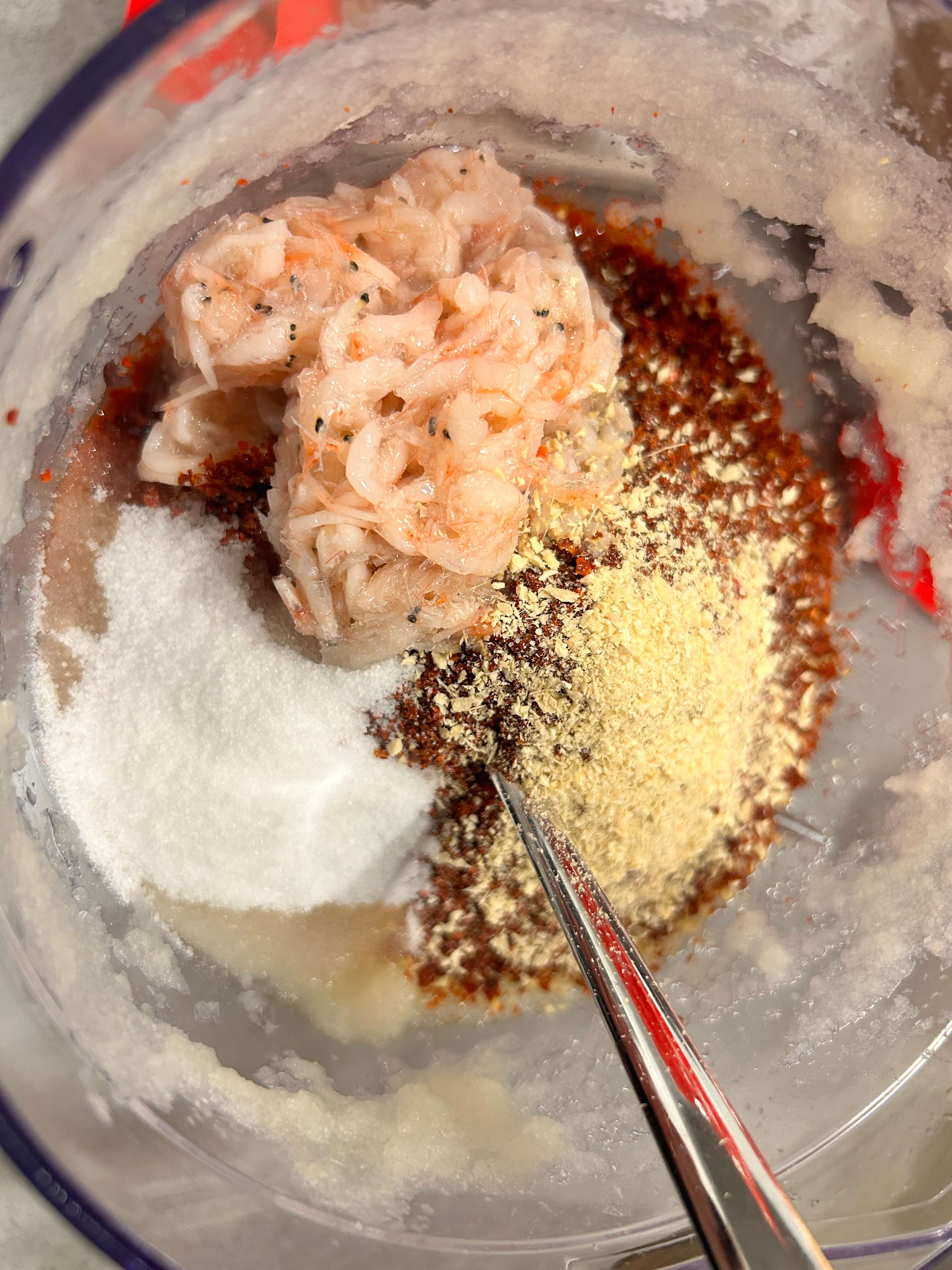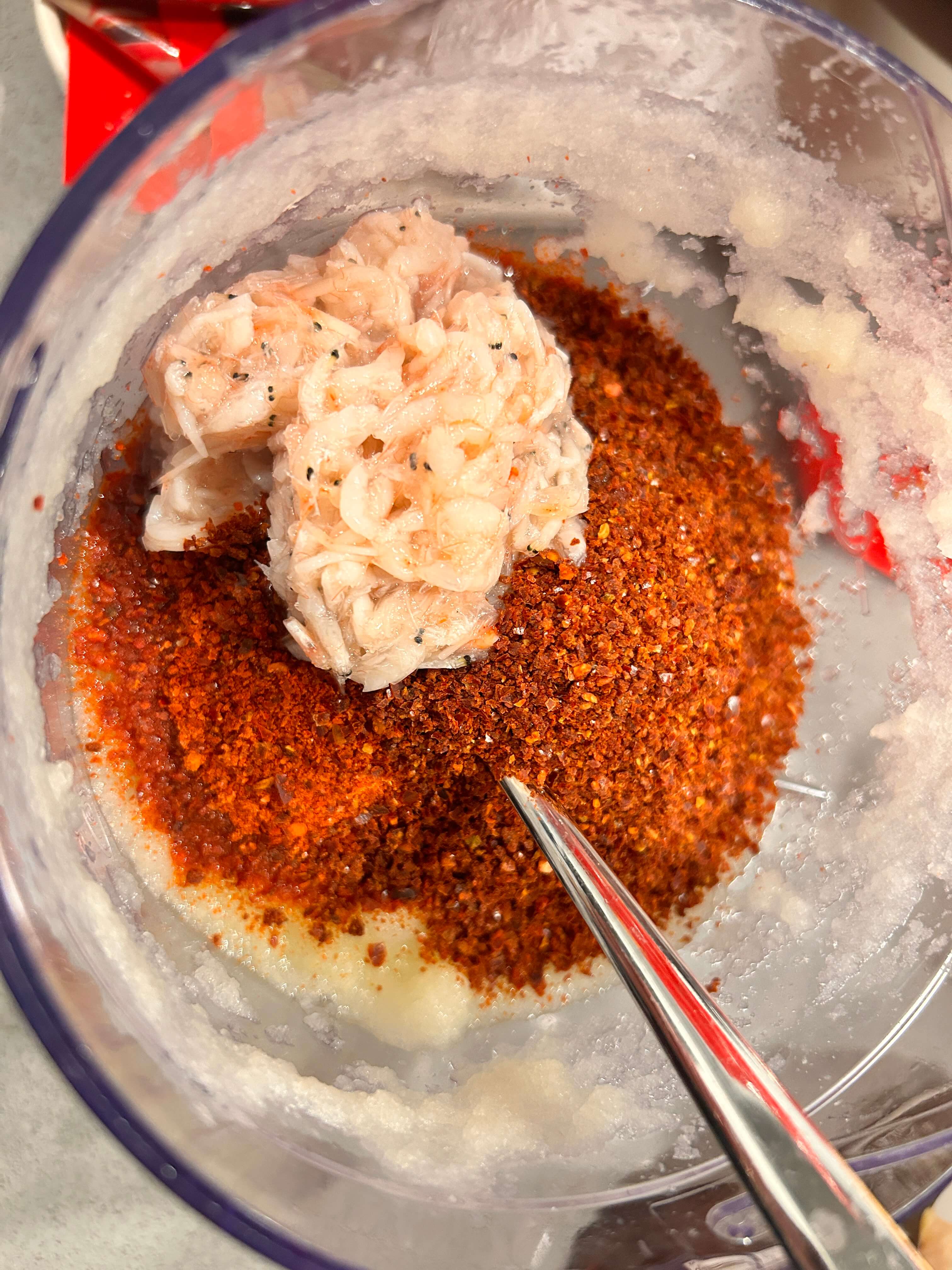 6. 고춧가루 8, 새우젓 2, 생강가루 1을 사과와 양파를 간 곳에 넣어줍니다.