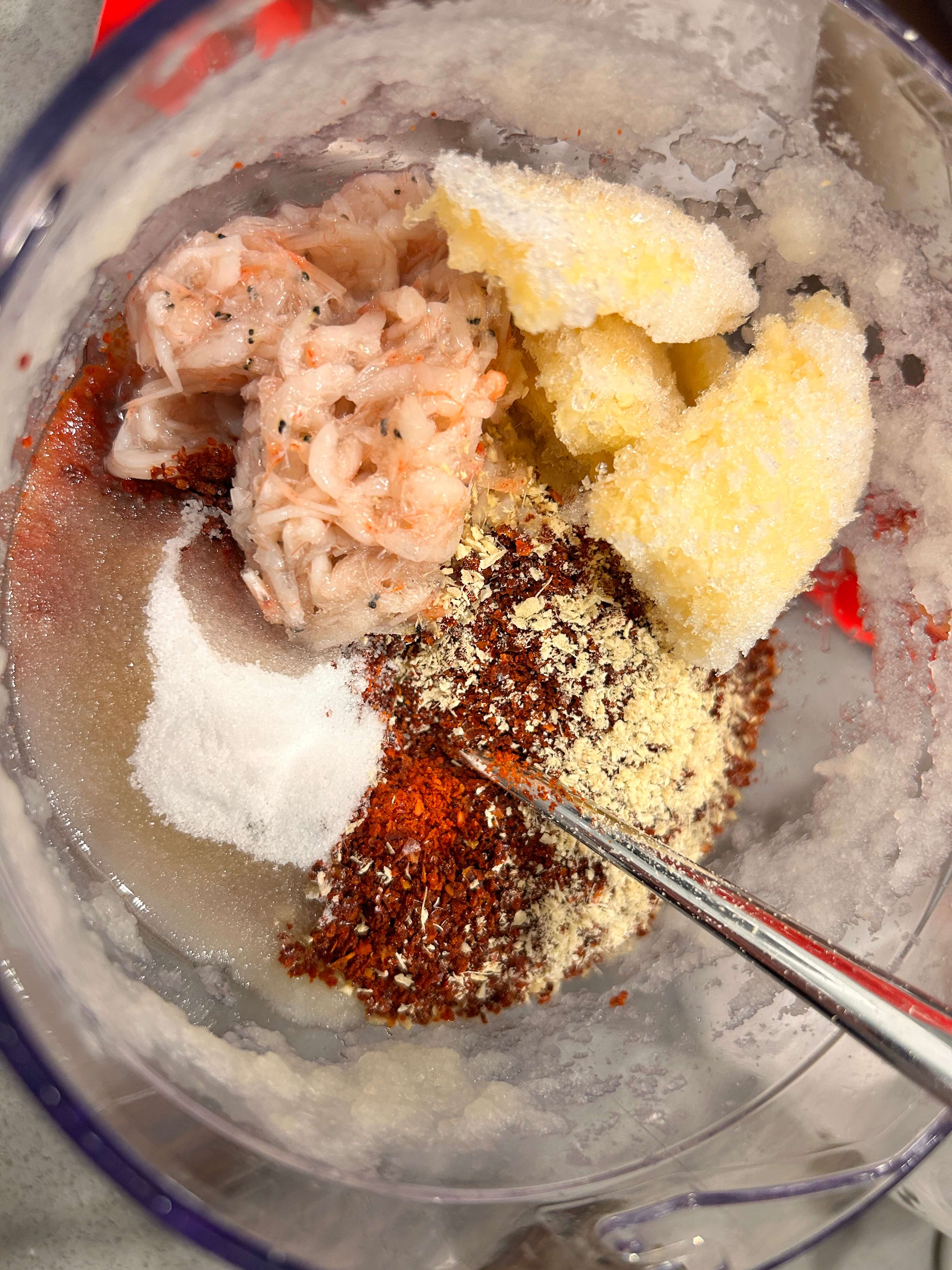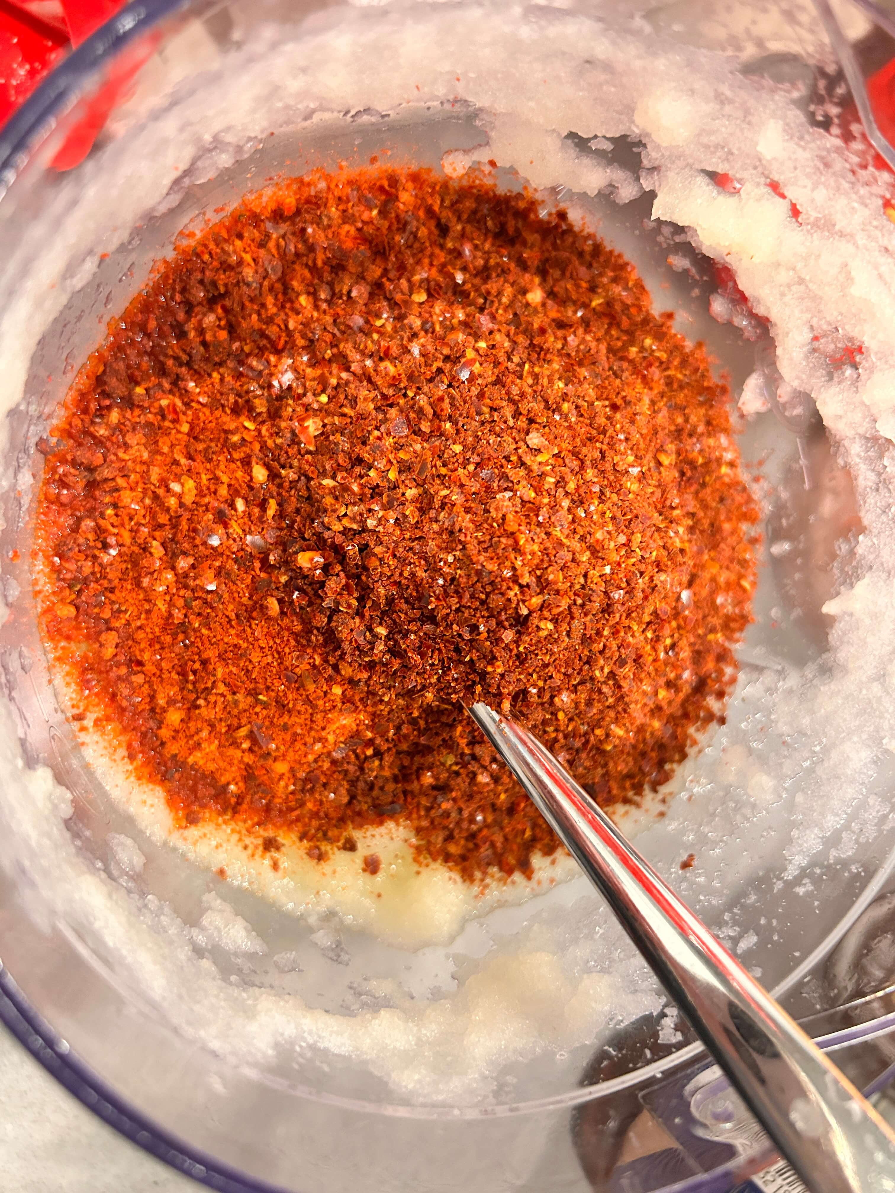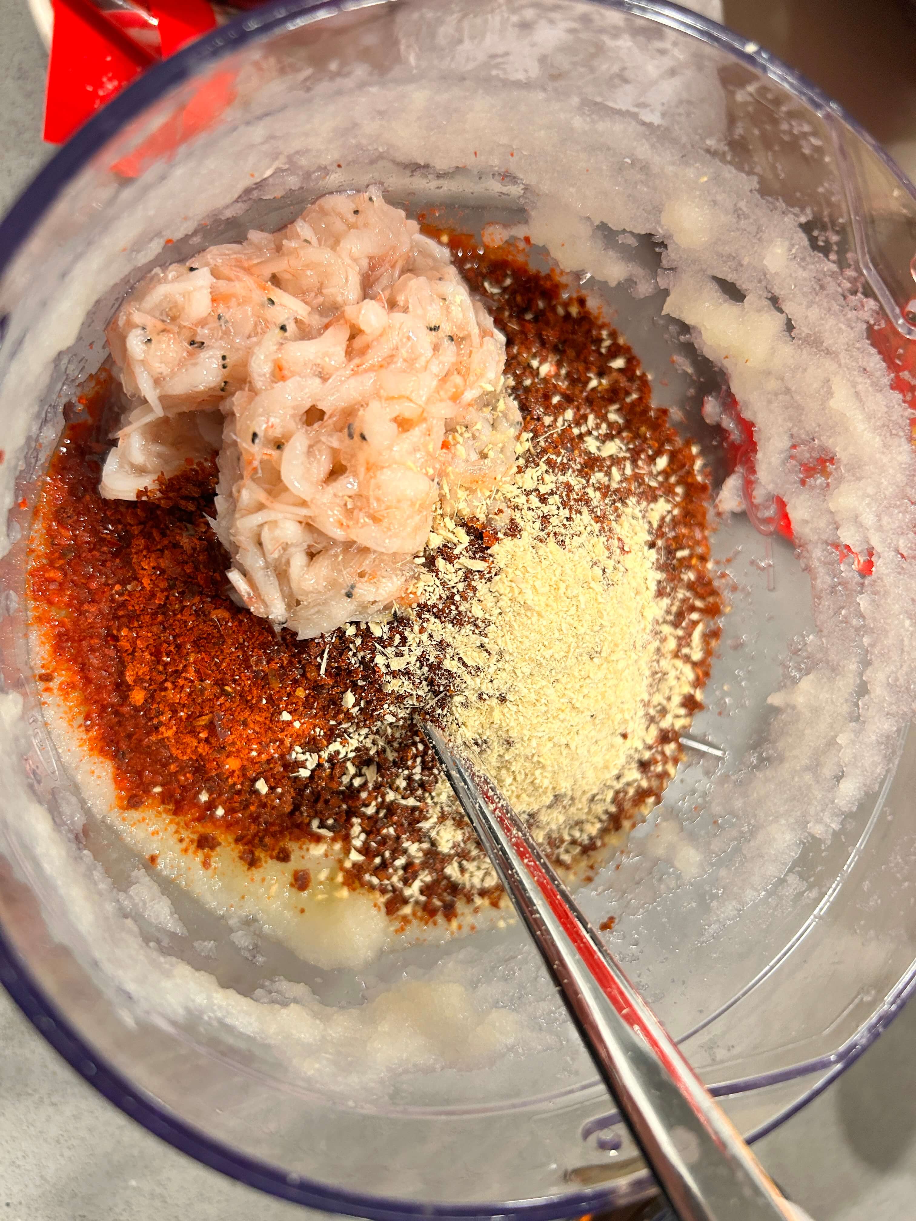 6. 고춧가루 8, 새우젓 2, 생강가루 1을 사과와 양파를 간 곳에 넣어줍니다.