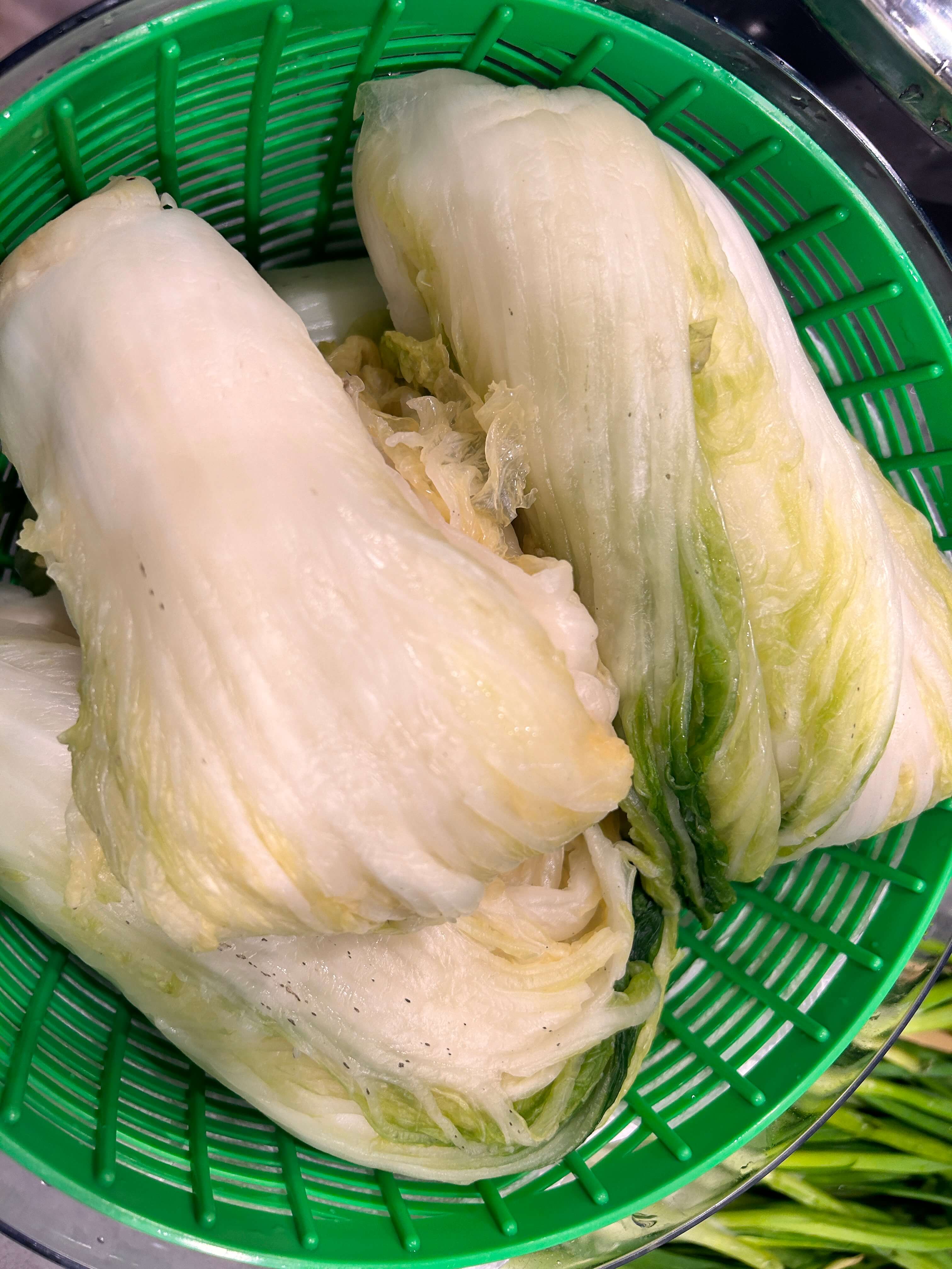 2. 절인 배추는 물에 여러 번 씻어 물기를 제거해 줍니다.
