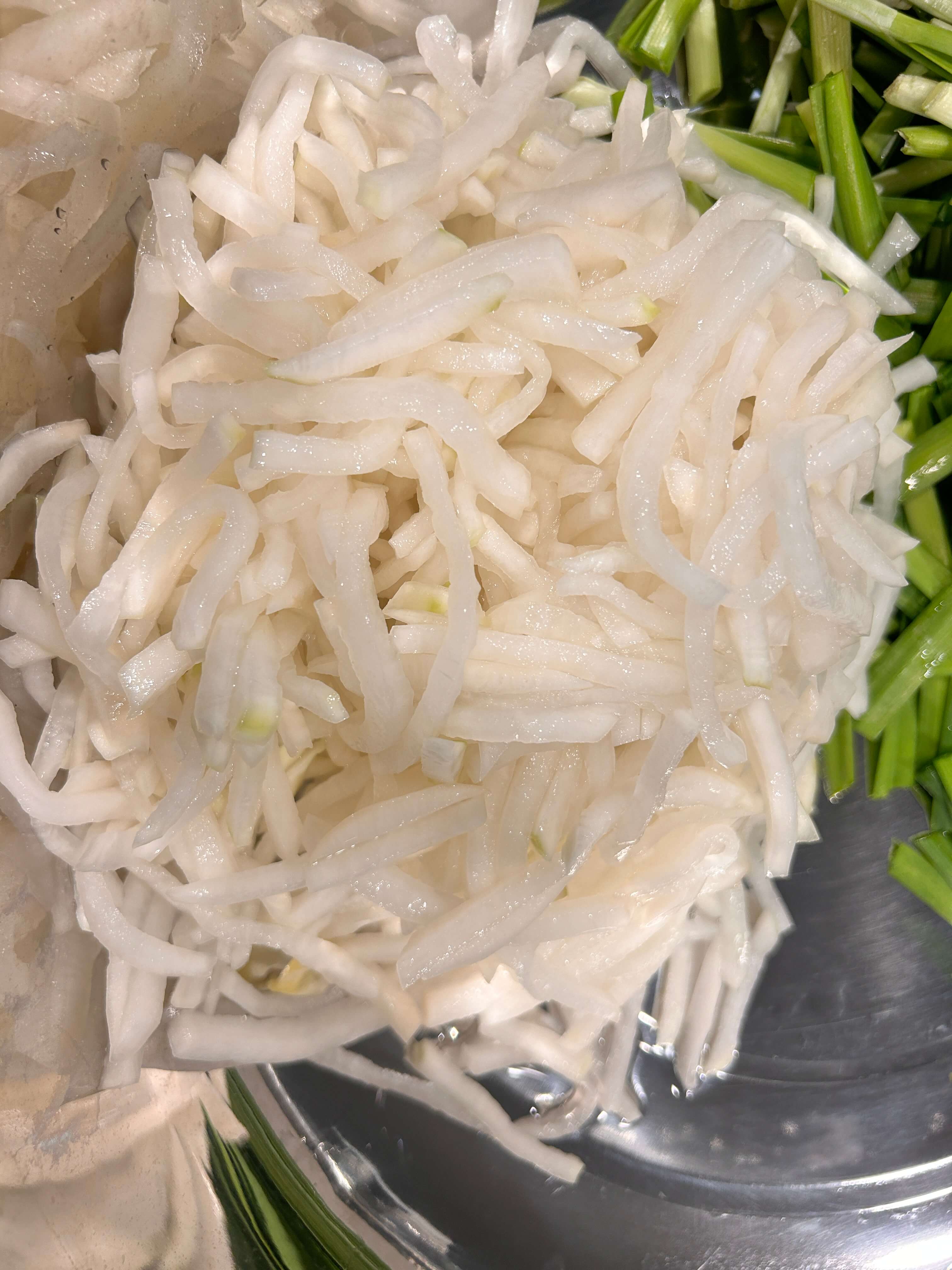3. 무는 얇게 썰어 소금에 1시간 정도 절인 뒤, 물기를 제거해 준비해 줍니다.
