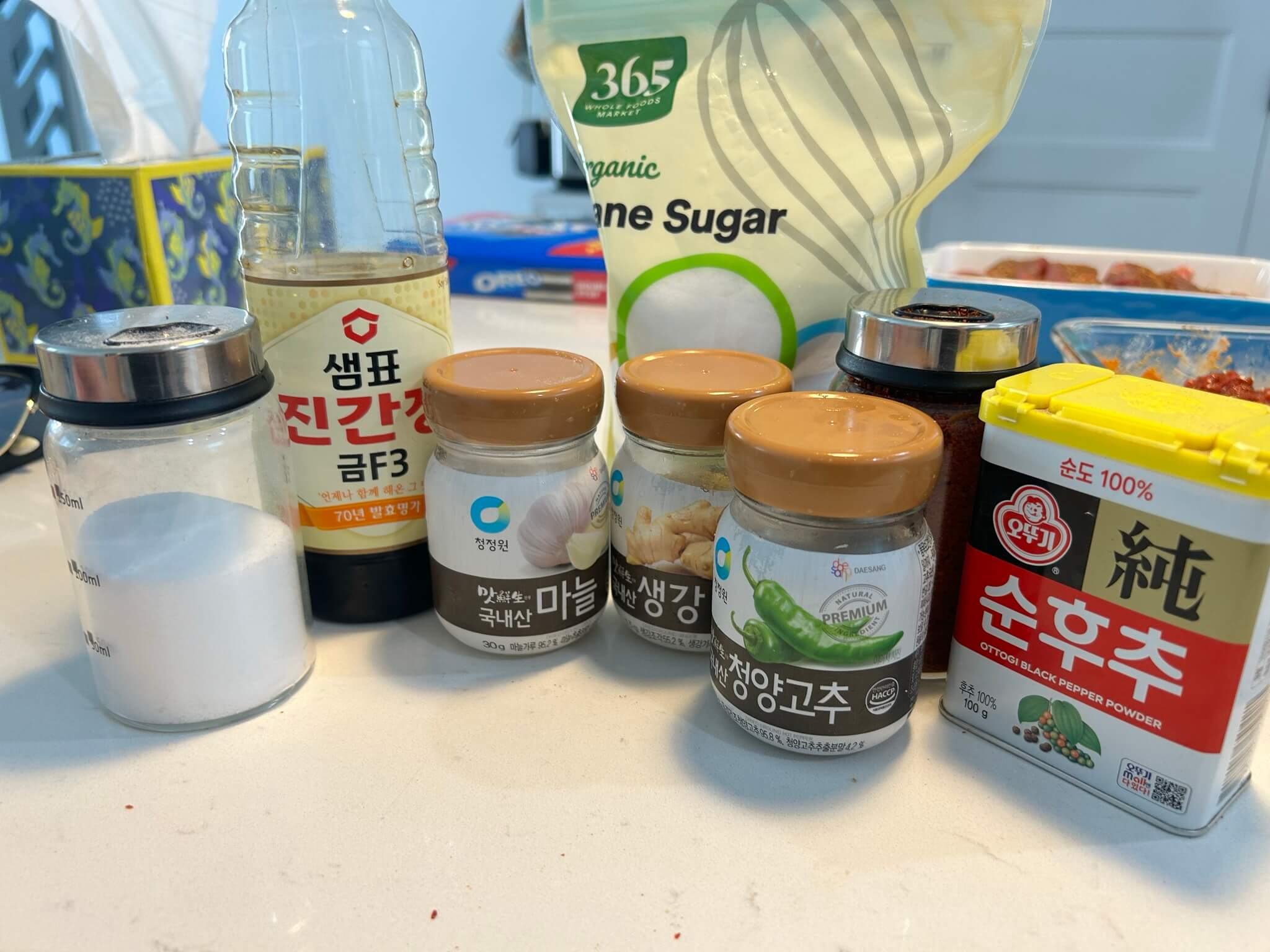 고기양에 따라 양은 달라지겠지만, 비율은 다음처럼 해주시면 됩니다. (간장 : 설탕 : 고추가루 : 청량고추가루 : 마늘가루 : 생강가루 = 5 : 5 : 1 : 1 : 1 : 0.5 (숟갈) )