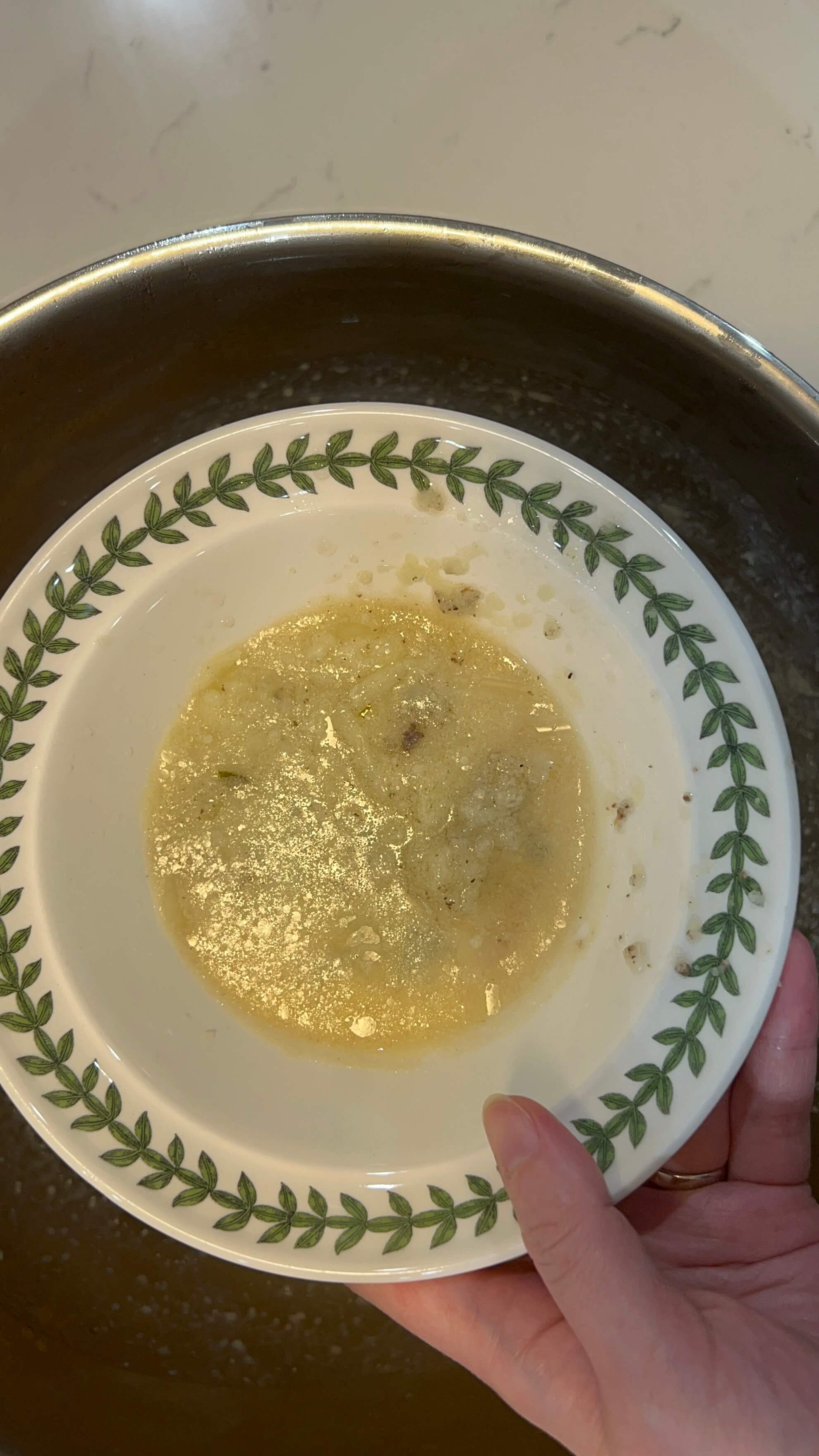 13. 육수는 따로 이렇게 볼에 담아서 기름을 제거하기 위해 냉동에 20분 정도 놔두었다가 위에 뜨는 기름을 제거해 줍니다.