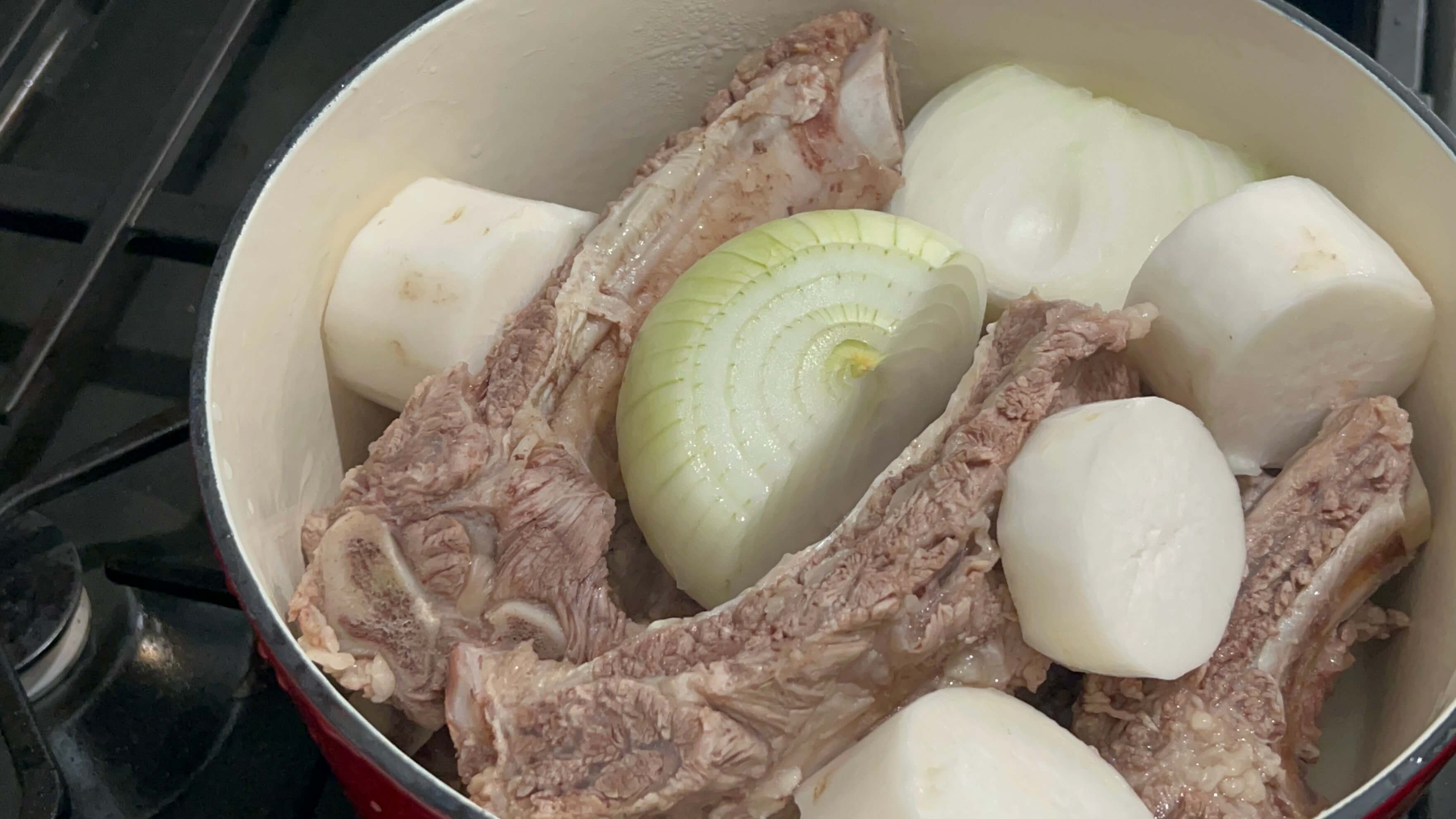8. 무와 양파를 통으로 넣어줍니다.