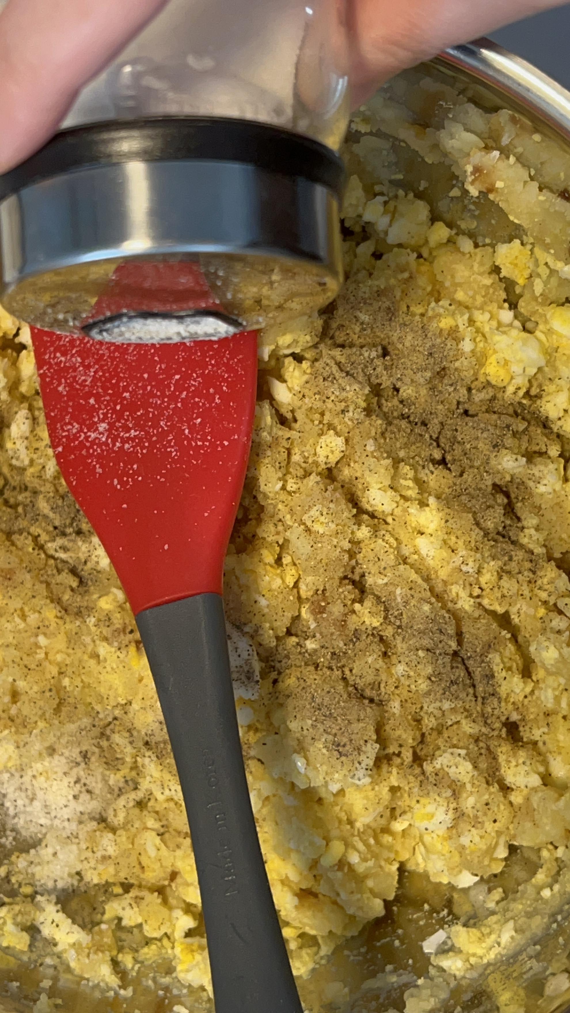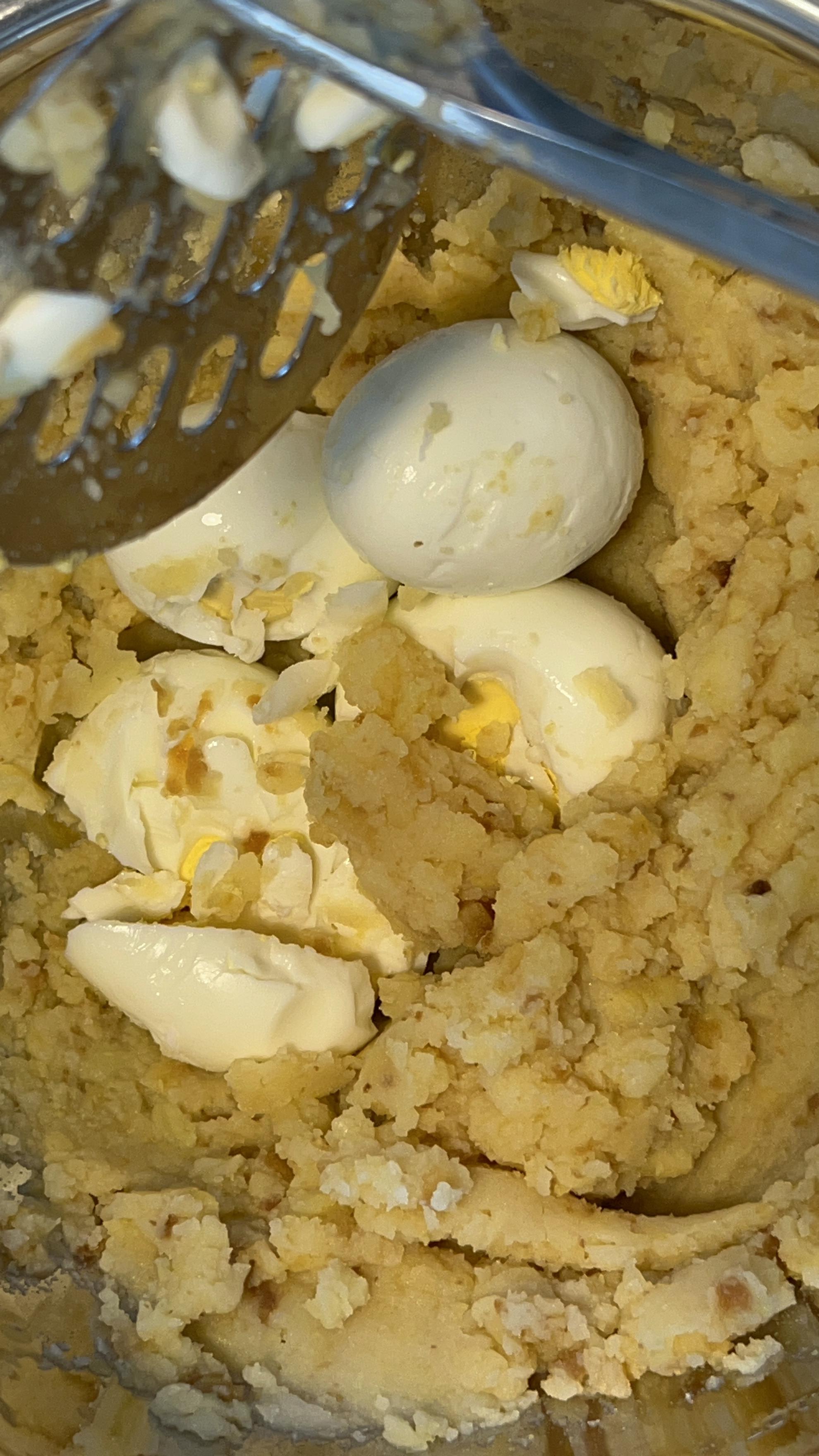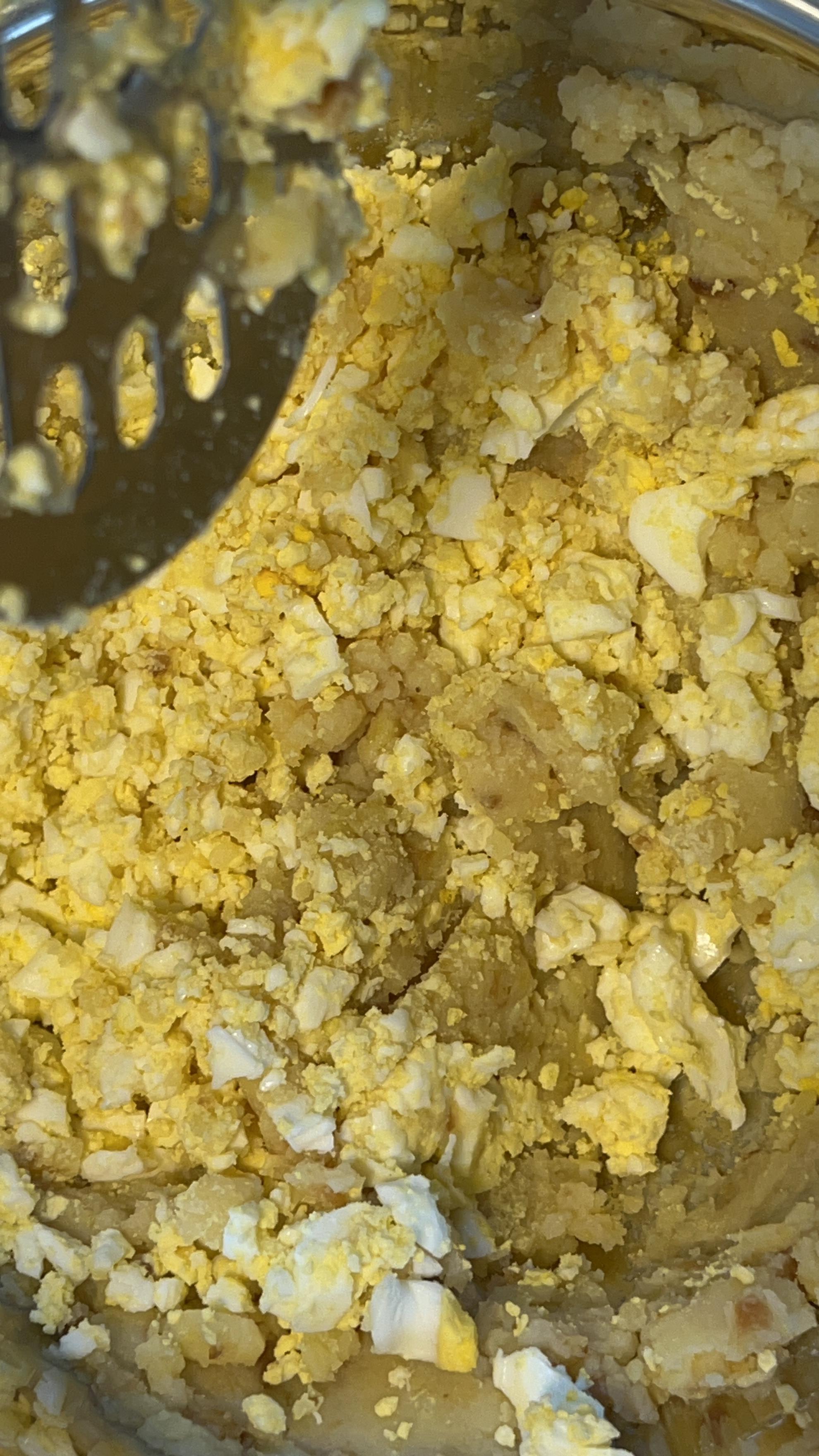 6. 감자가 어느정도 으깨졌을 때 계란을 넣어 같이 으깨줍니다.