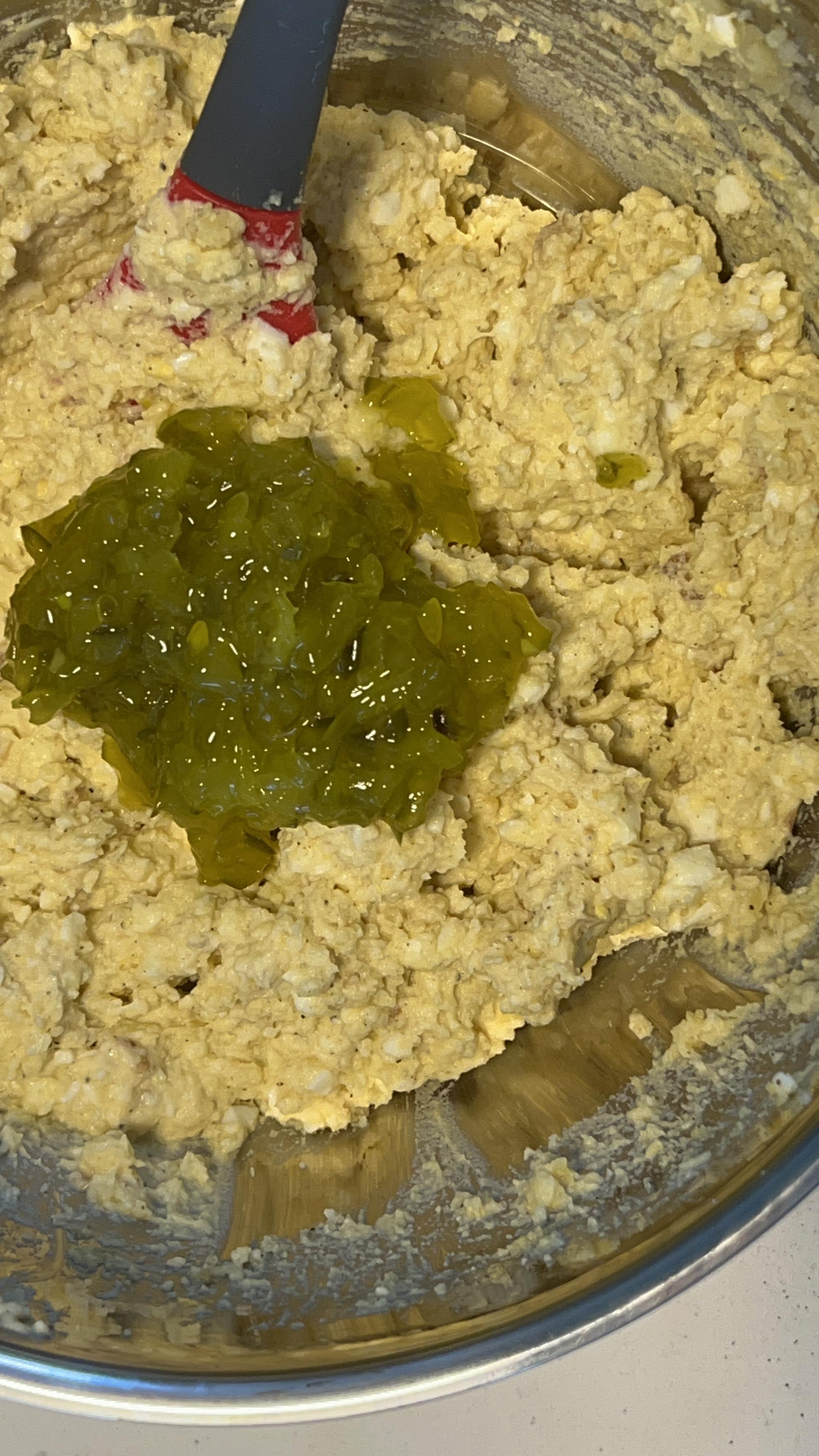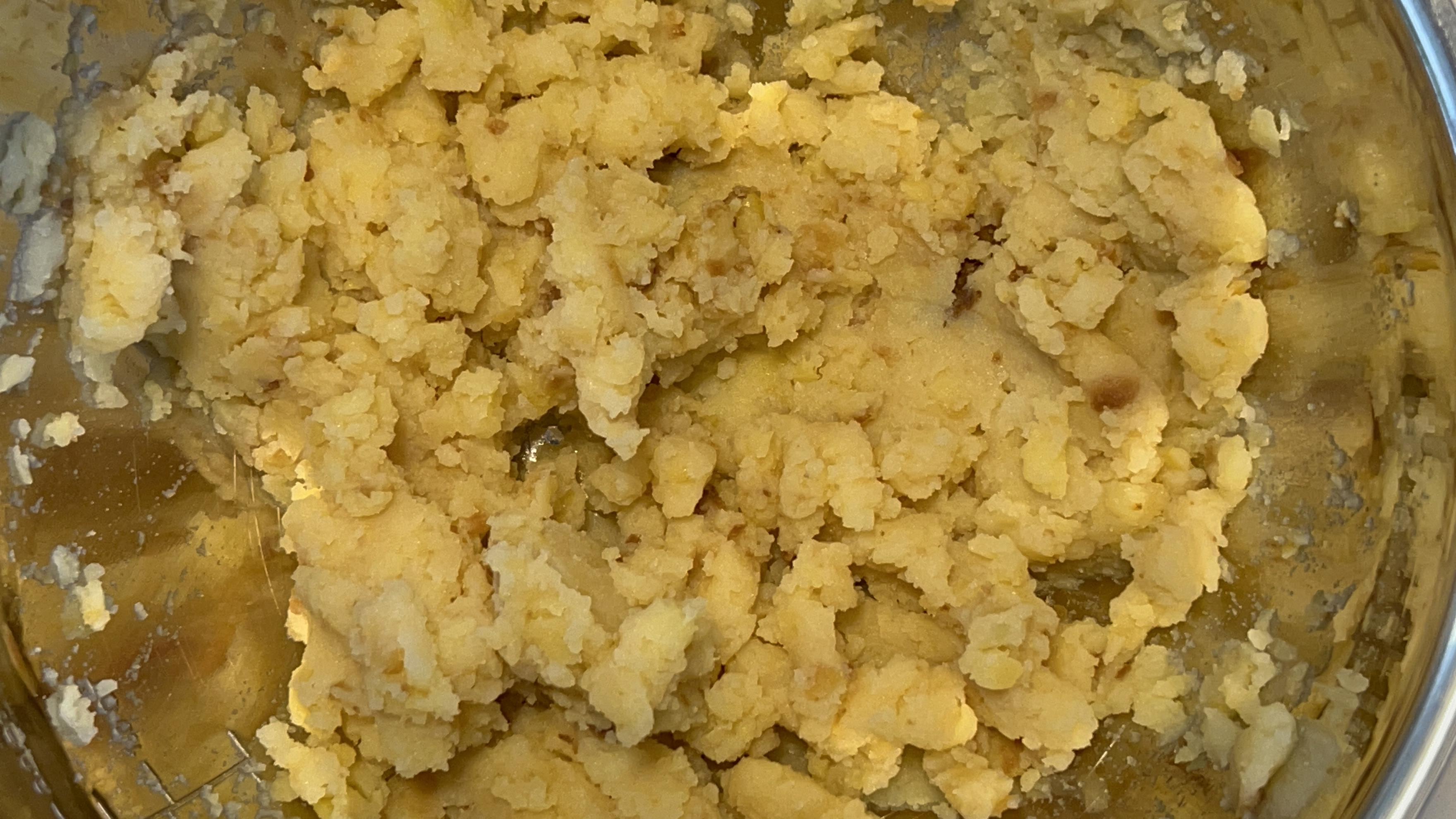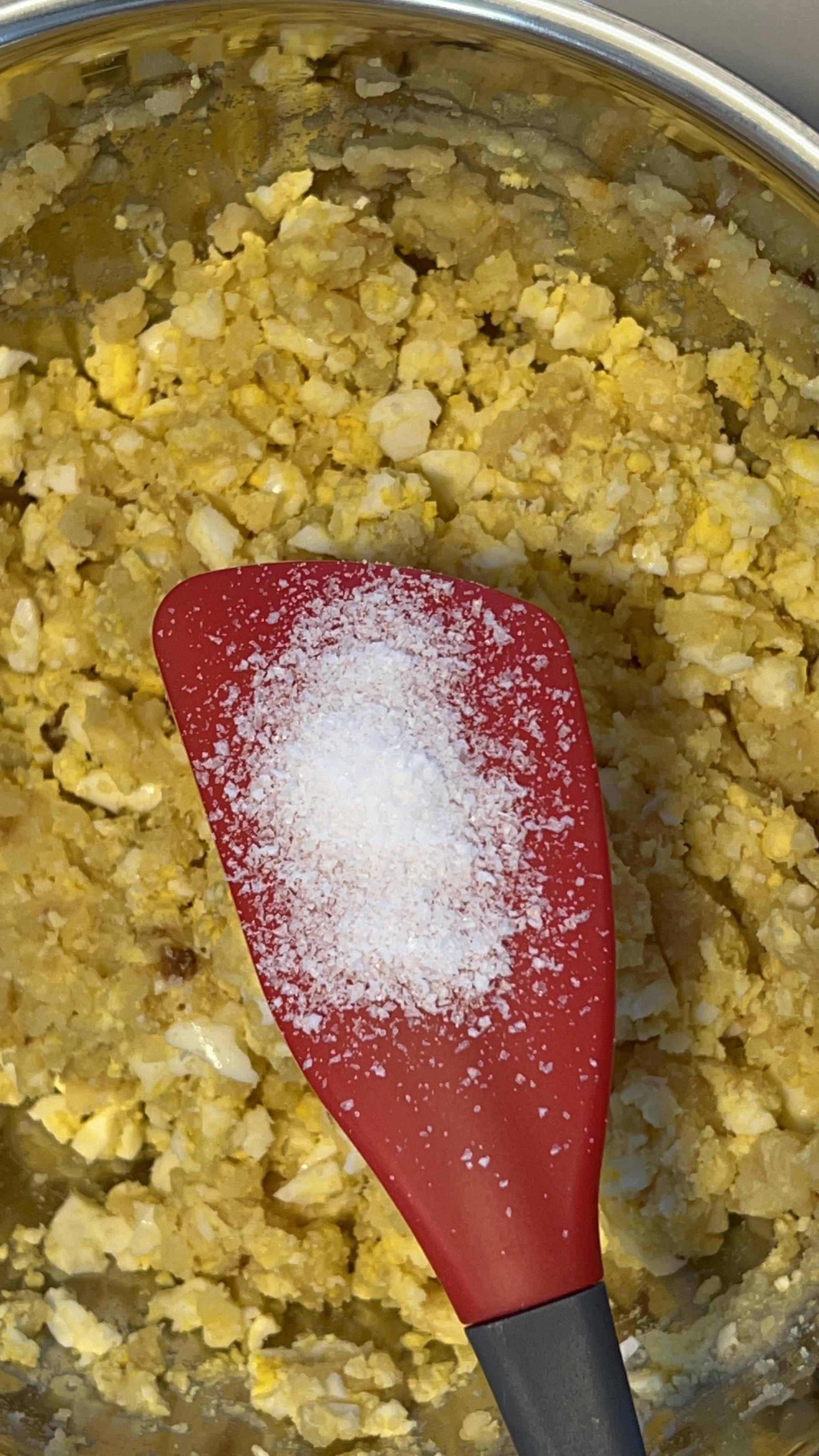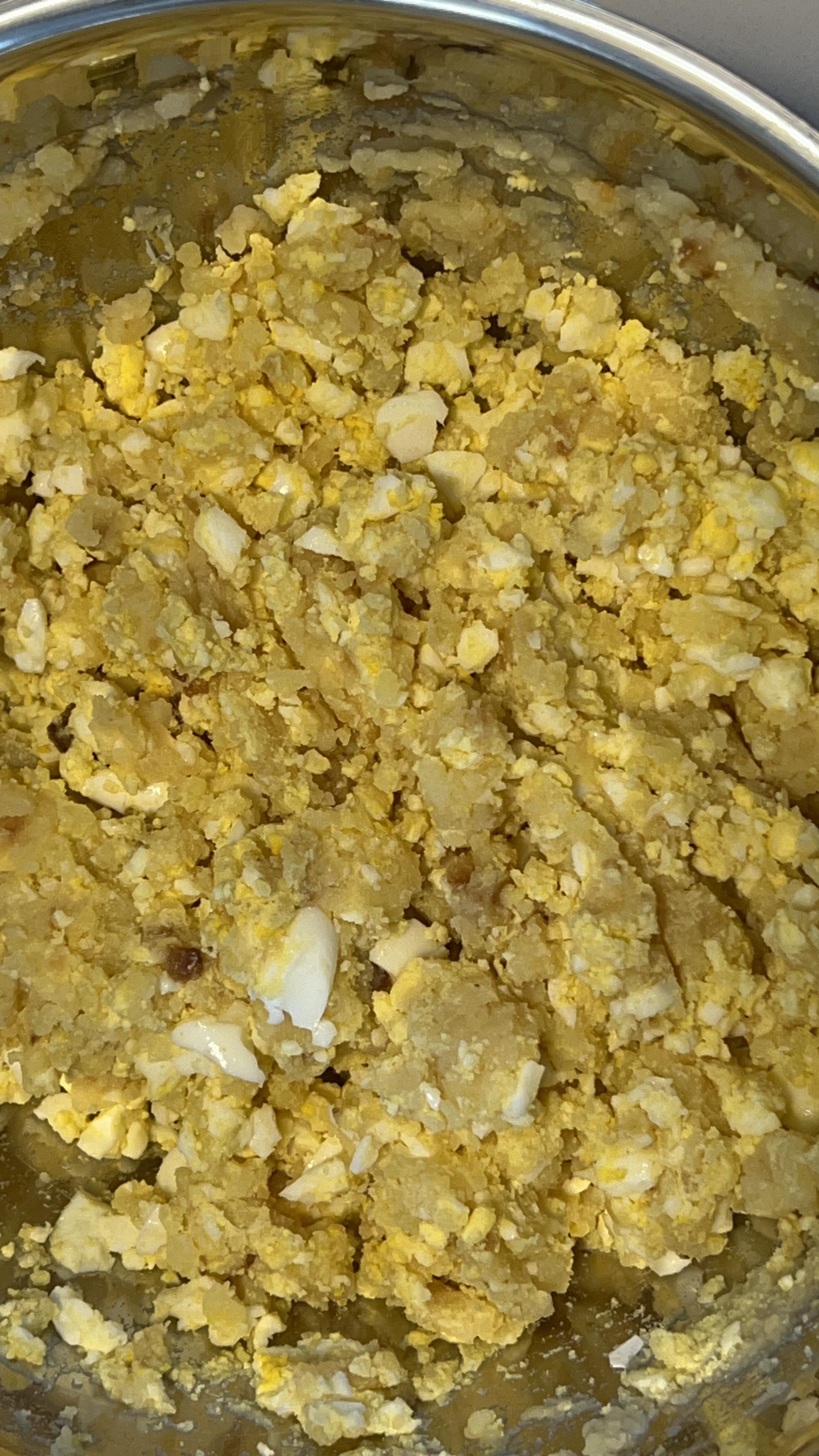 6. 감자가 어느정도 으깨졌을 때 계란을 넣어 같이 으깨줍니다.