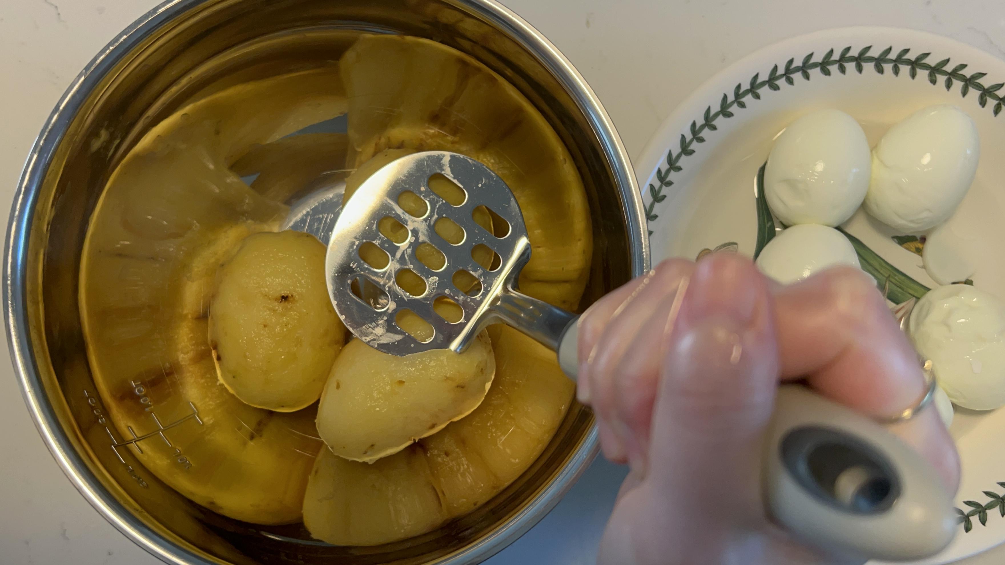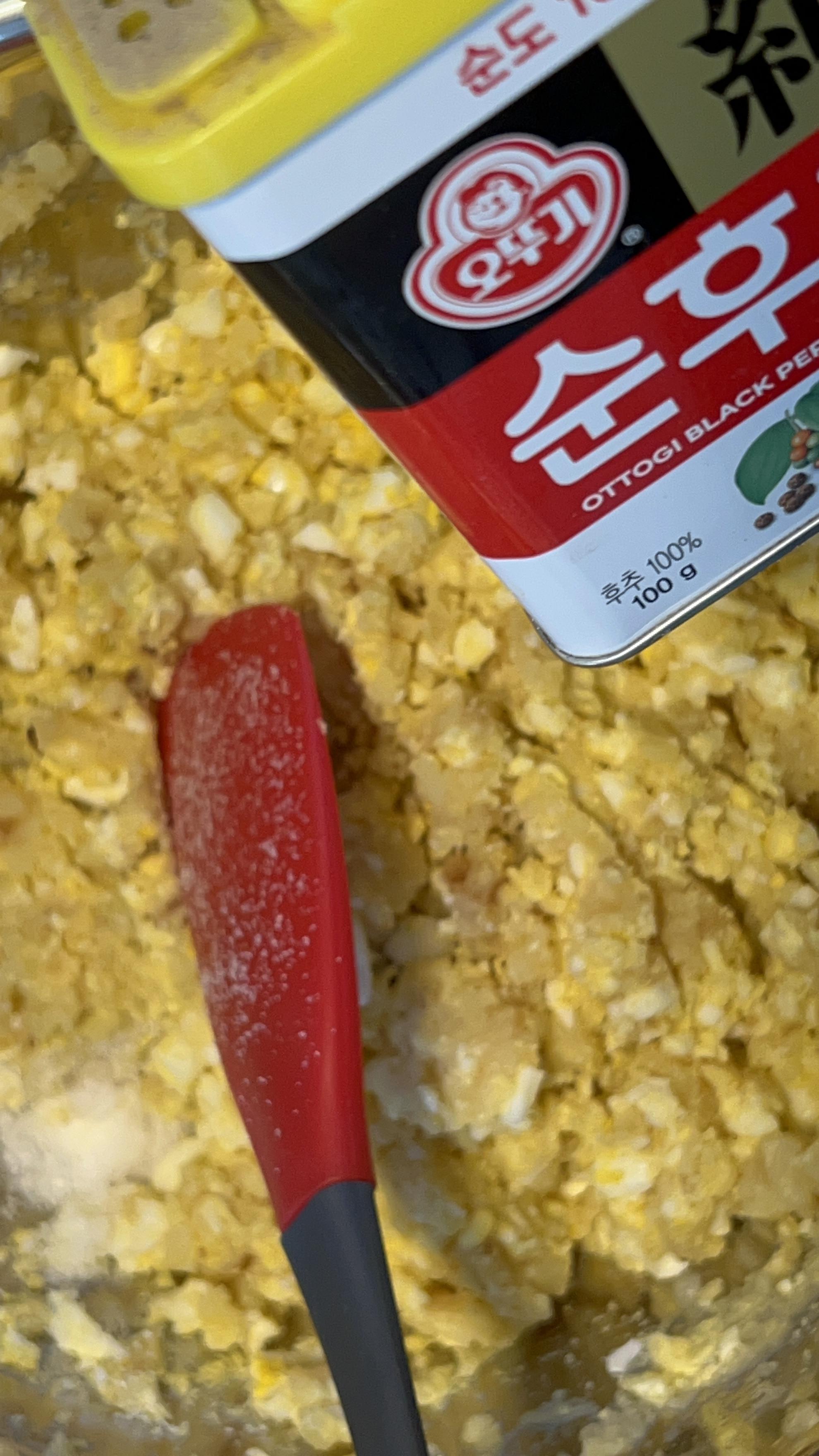 6. 감자가 어느 정도 으깨졌을 때 계란을 넣어 같이 으깨줍니다.