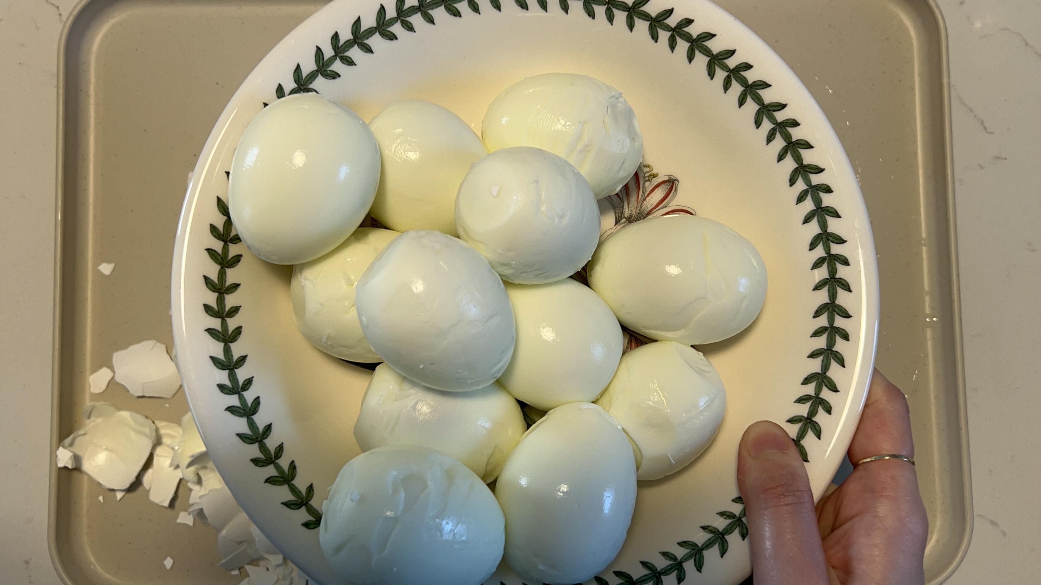 4. 삶아진 계란은 찬물에 여러 번 씻어서 껍질을 까서 준비해 줍니다.