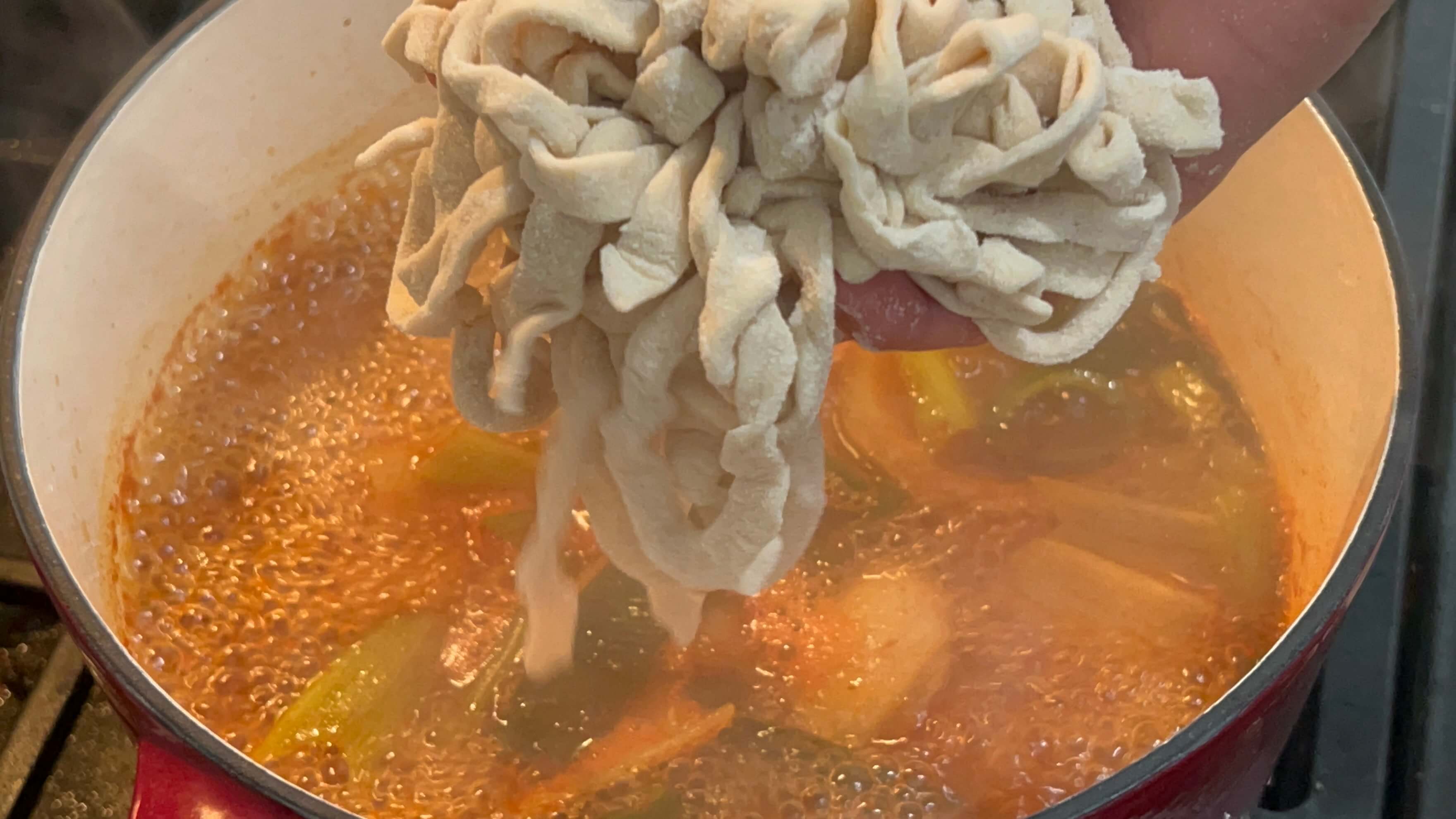 10. 팔팔 끓는 육수에 칼국수면을 넣어주고, 수제비를 떠 넣어줍니다.
