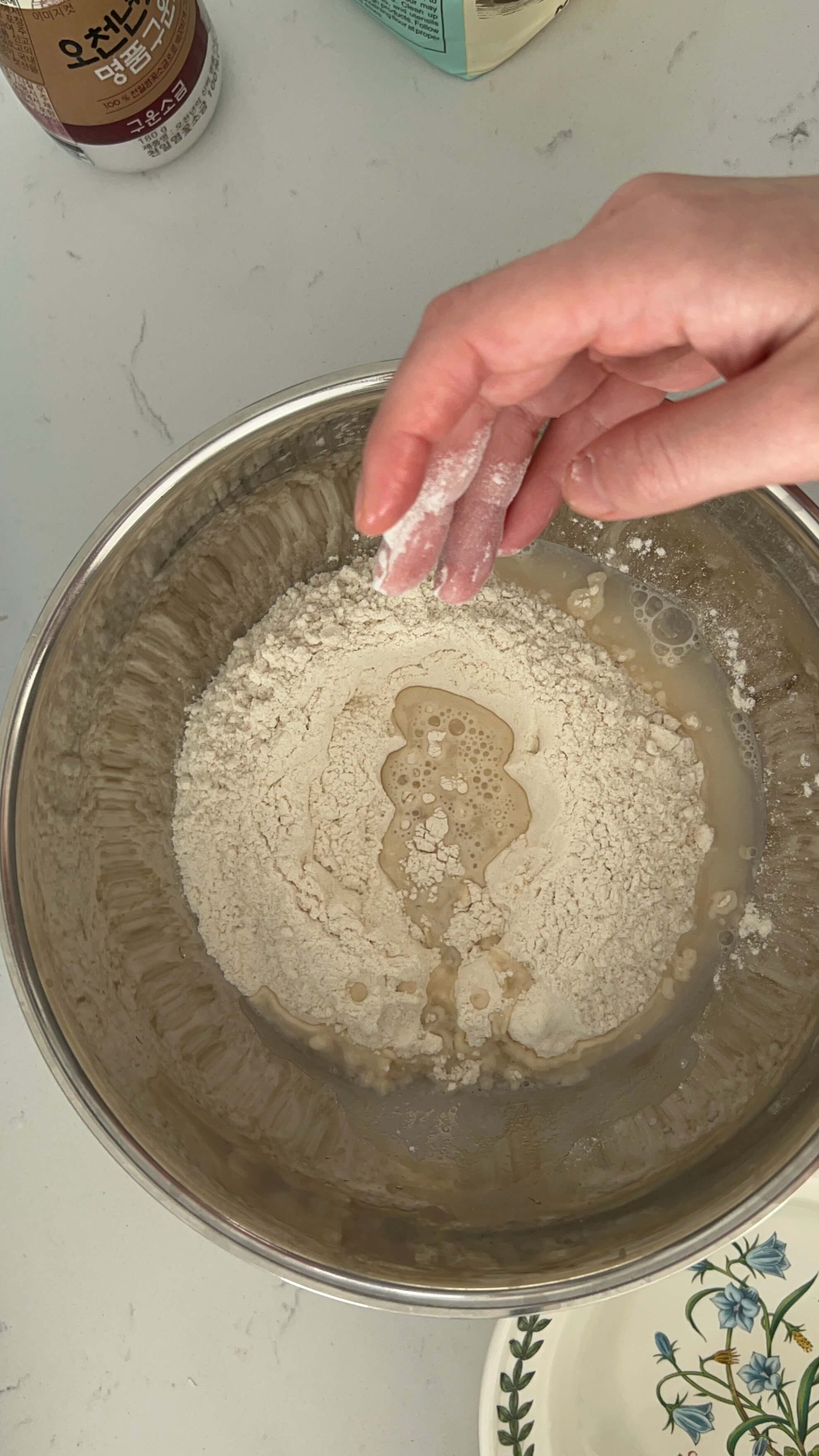 3. 밀가루반죽에 따뜻한 소금물을 조금씩 넣어가며 반죽해 줍니다.
