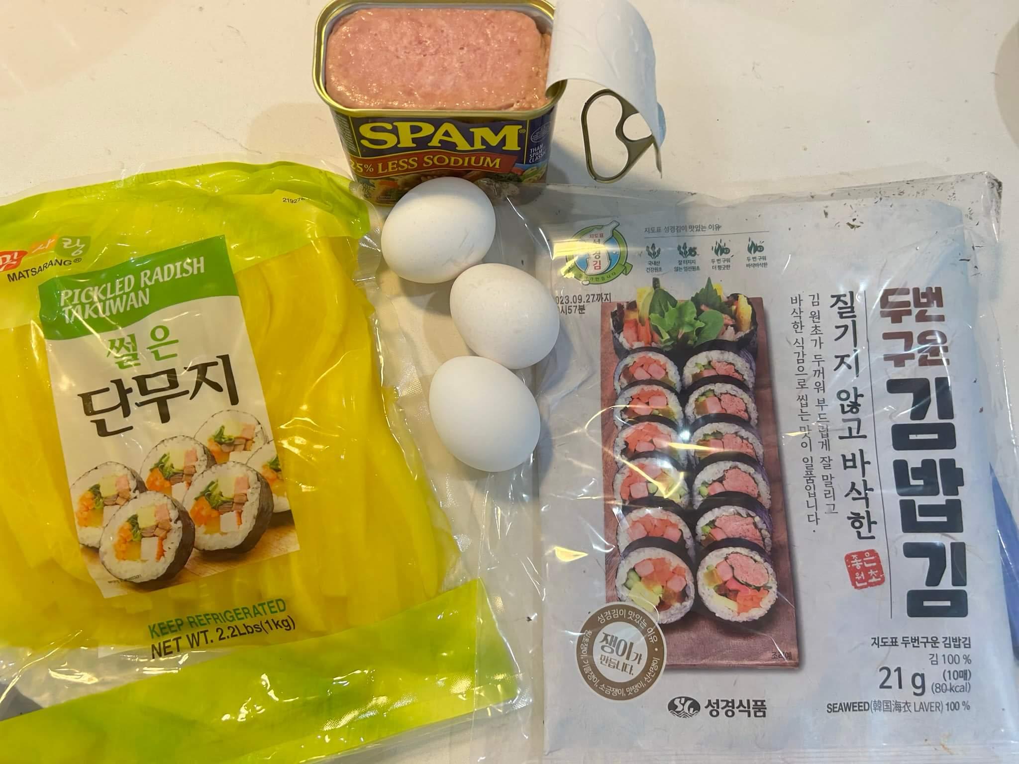 6. 단무지, 스팸, 계란, 양념밥, 김밥김 이렇게 모든 재료를 한 곳에 잘 정리해 줍니다.