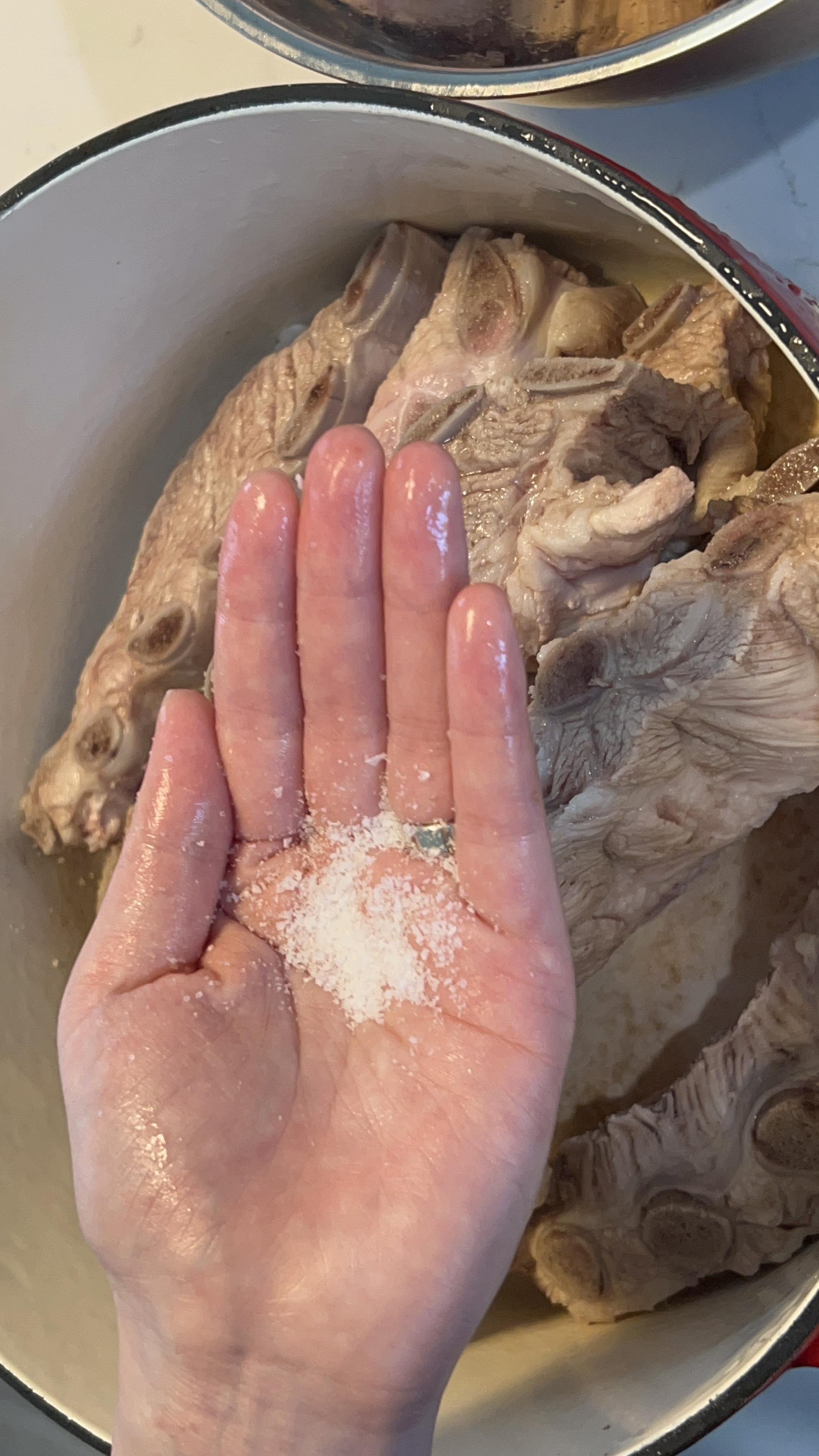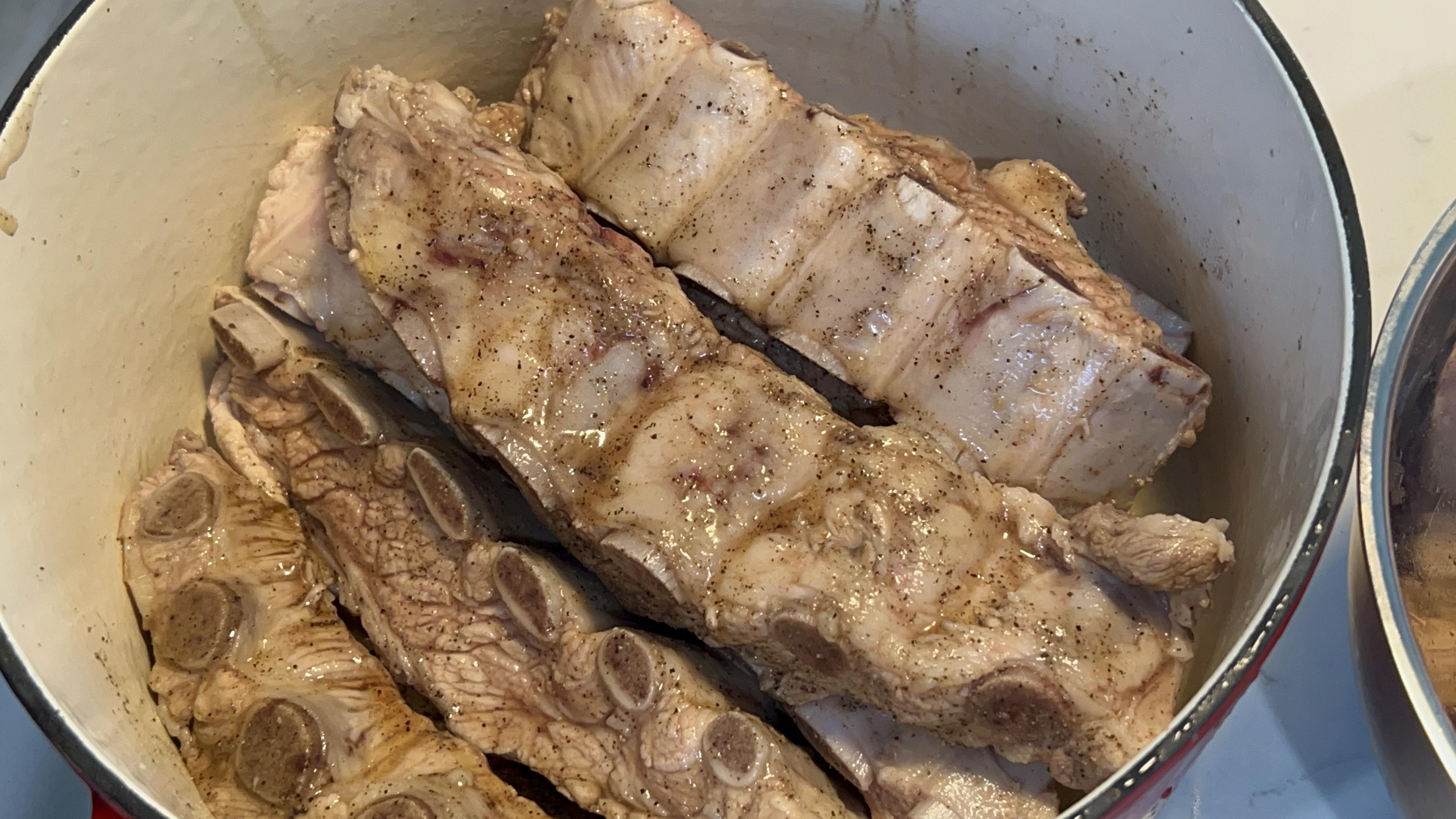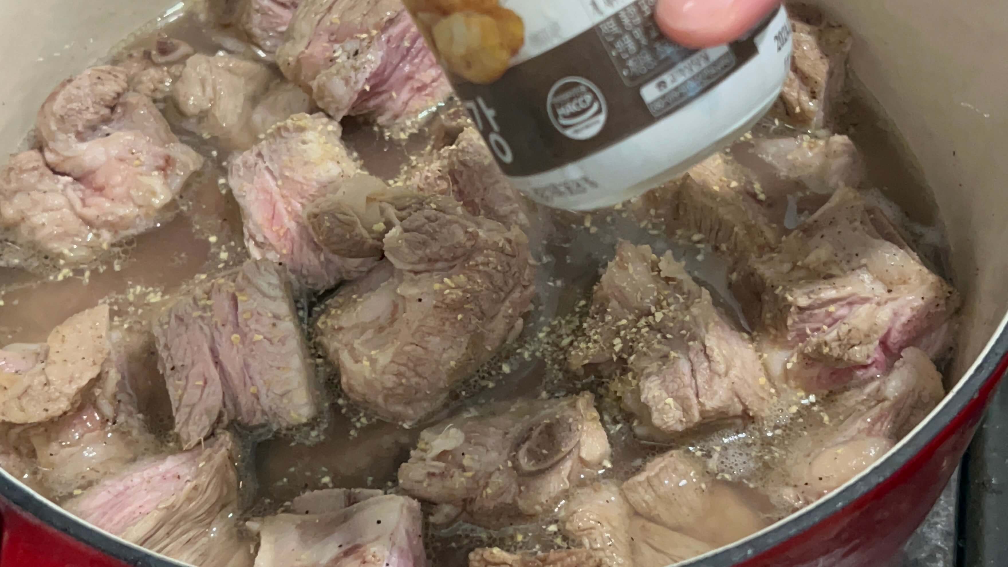 7. 등갈비를 냄비에 담아주고, 소금, 후추, 꿀을 넣고 한번 더 삶아줍니다.