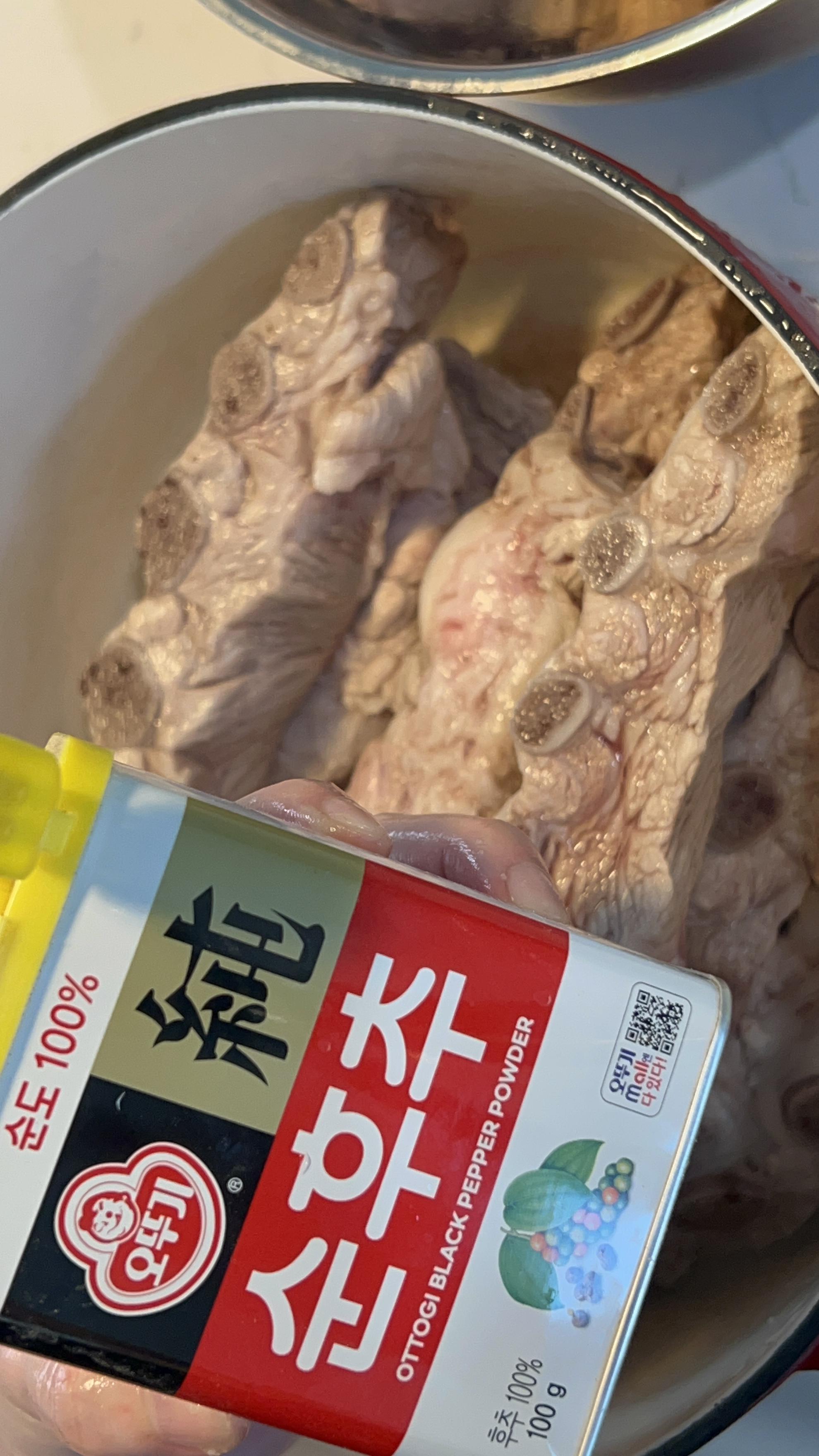 하루 동안 핏물제거를 해도, 뼛속 핏기가 아직 나오기 때문에 이렇게 두 번 삶아주는 게 좋습니다