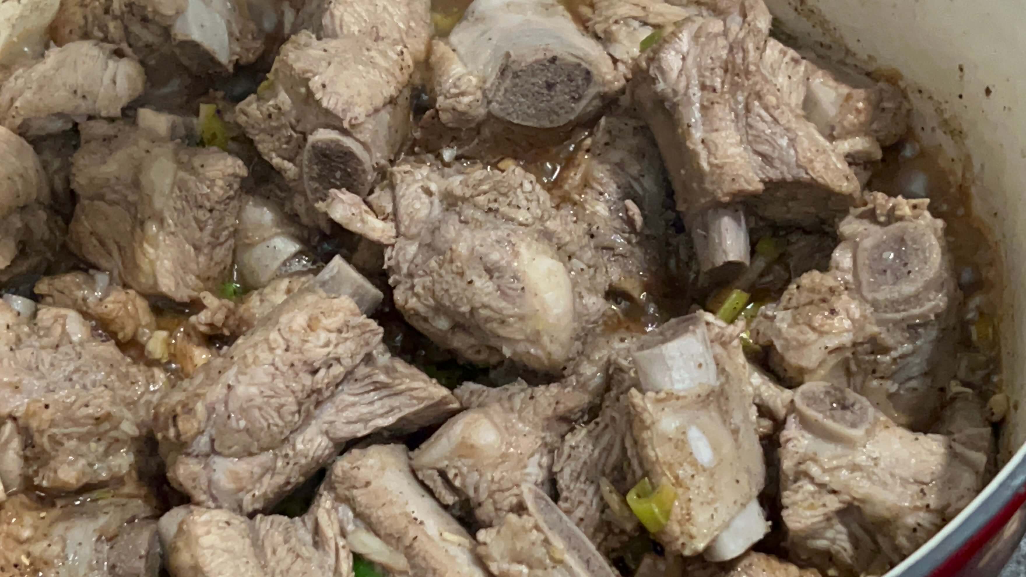 9. 냄비에 등갈비를 이제 조각조각 잘라준 뒤, 생강가루를 넣고 한번 더 끓여줍니다.