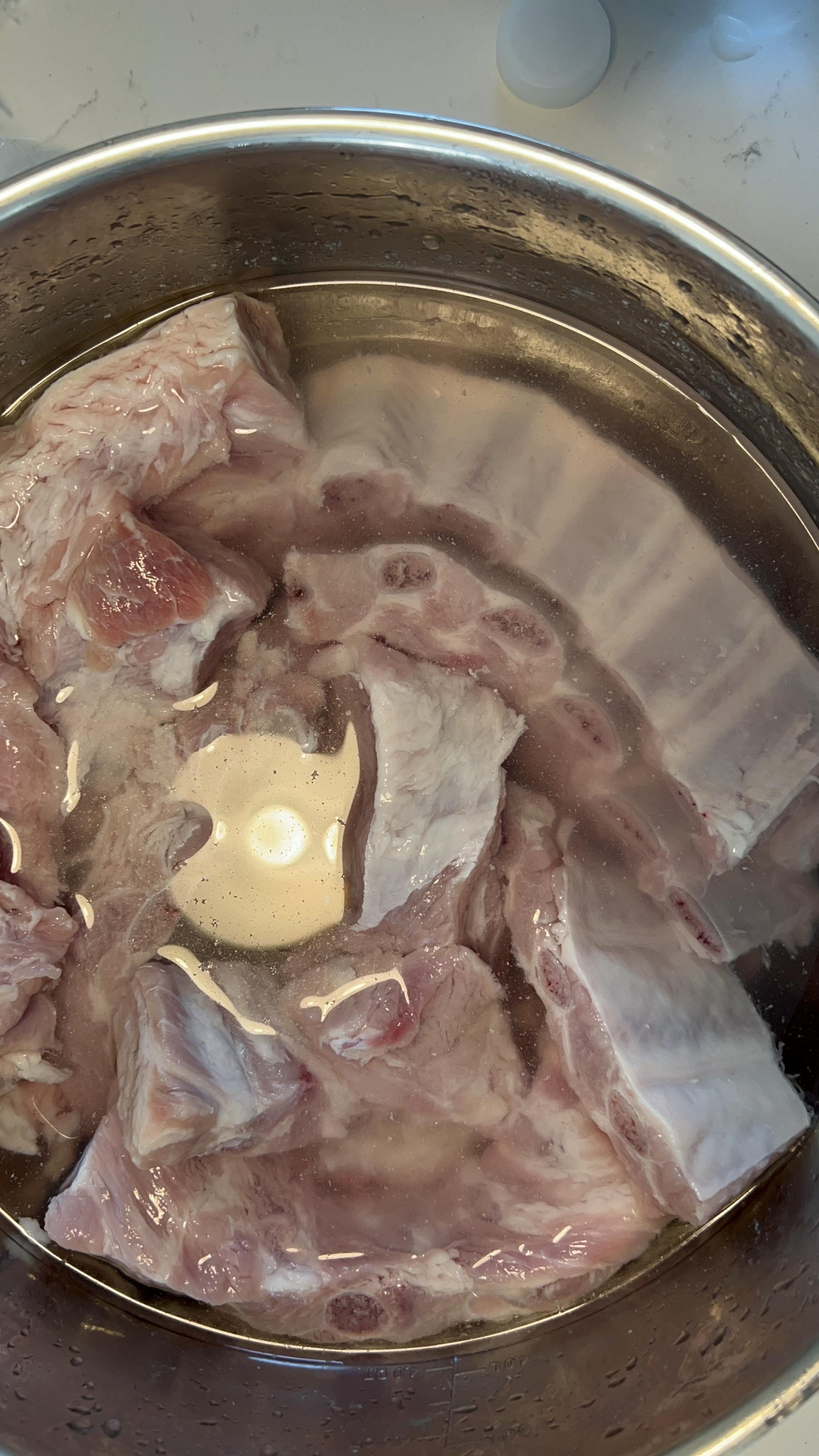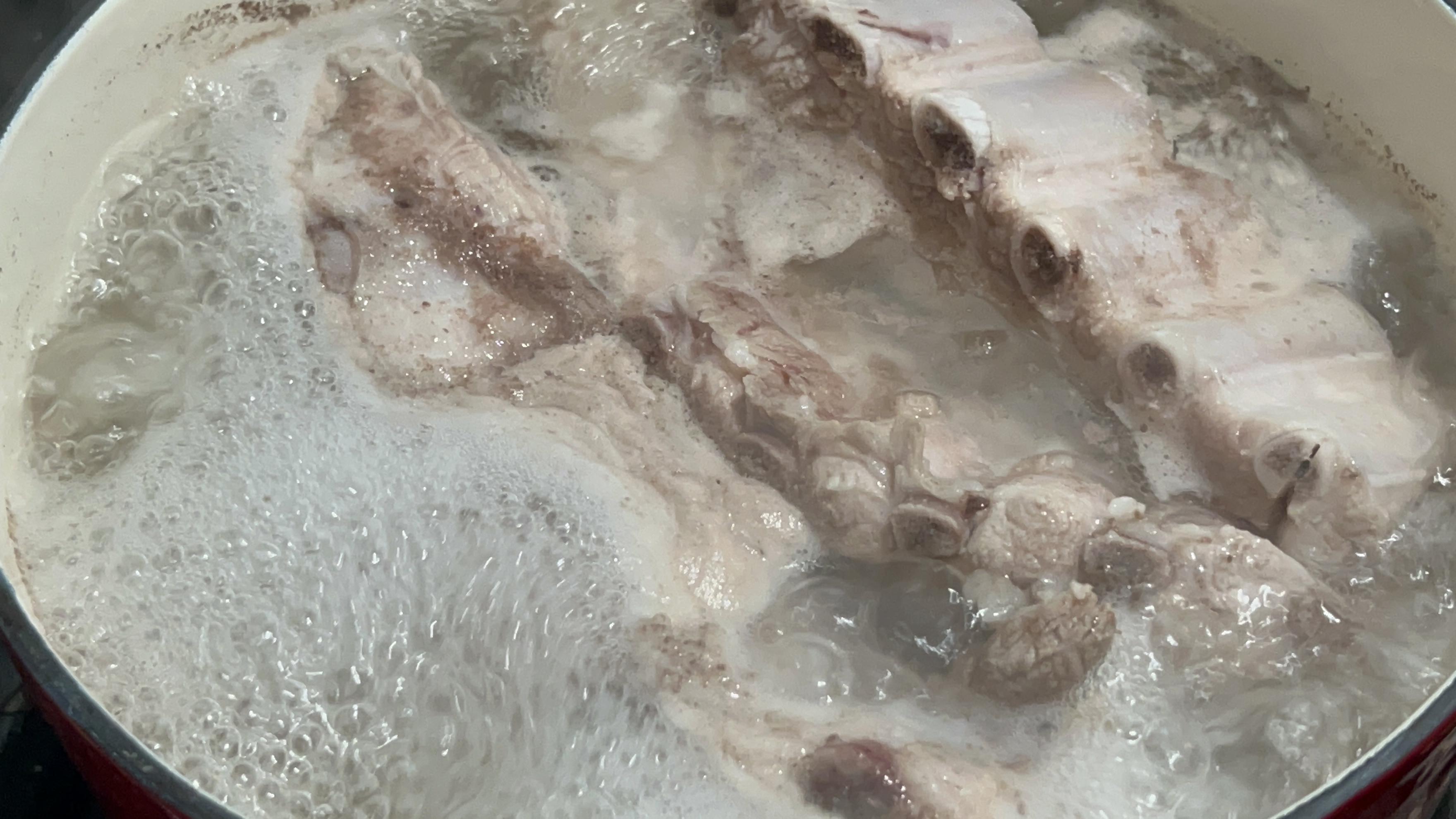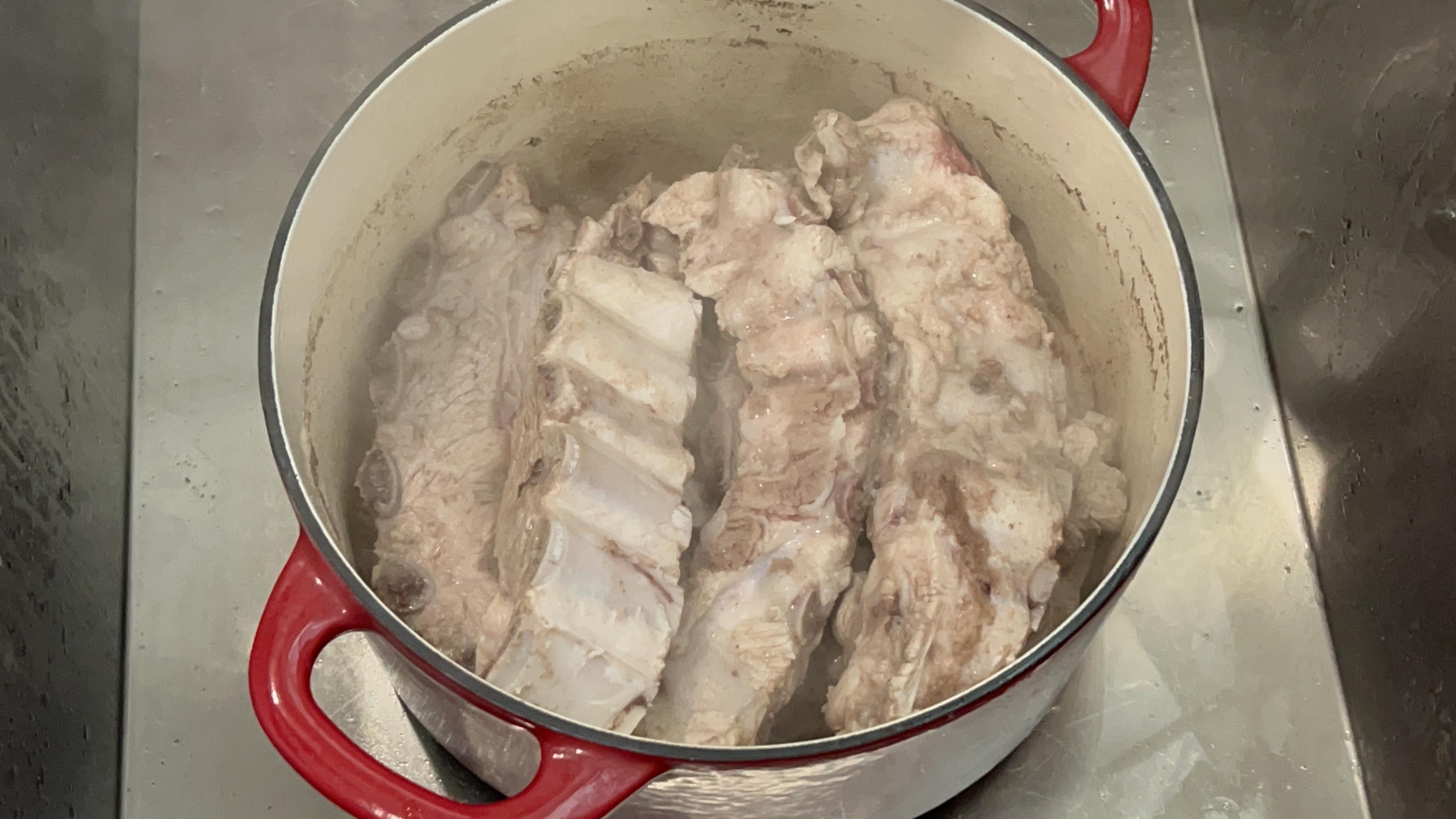 5. 등갈비를 큰 냄비에 담아 한번 끓여줍니다. 한 10~15분 정도 바르르 끓여줍니다.