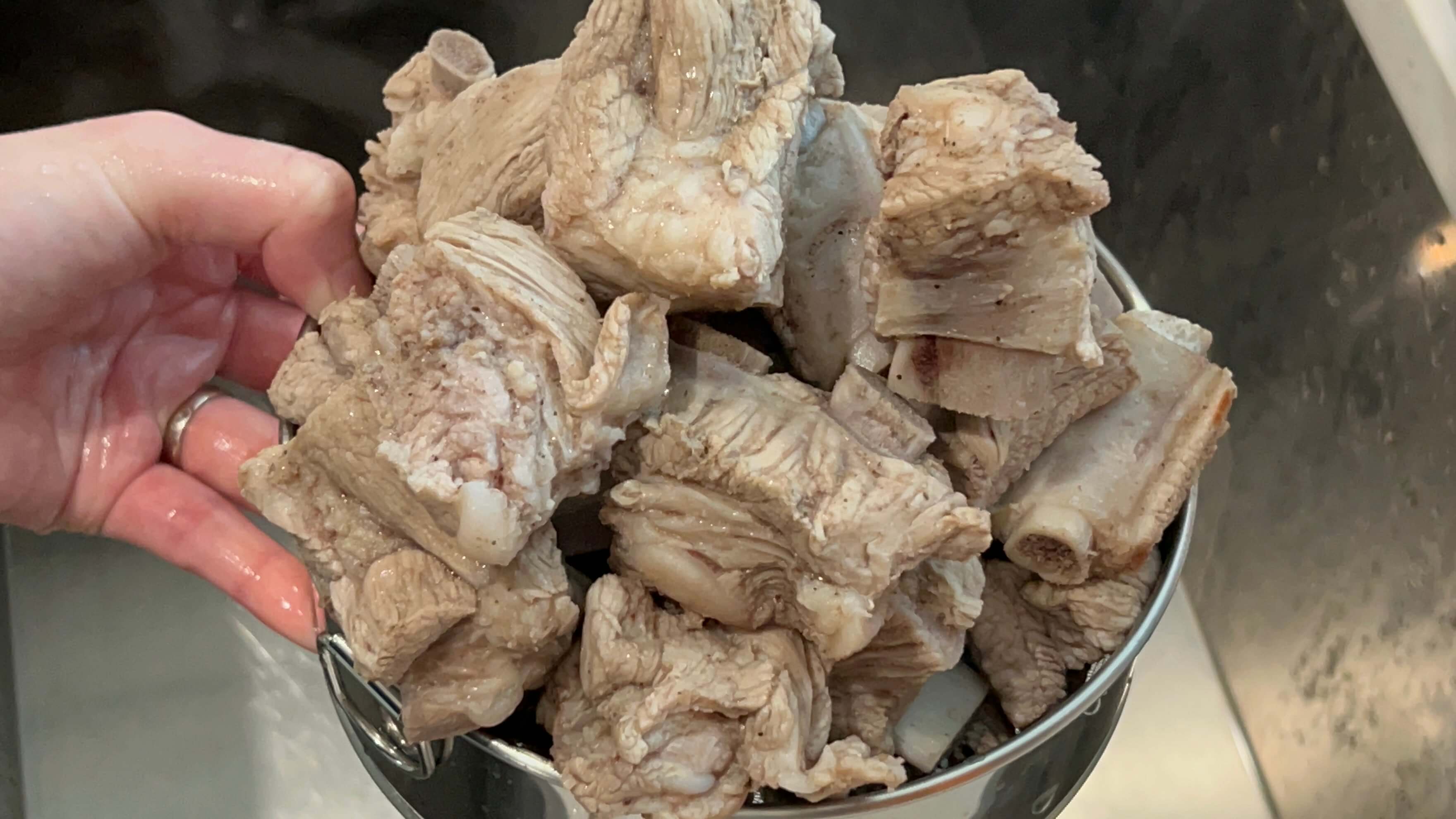 10. 끓은 물은 버려주고 이렇게 고기들을 씻어주면 등갈비 준비 완성입니다.