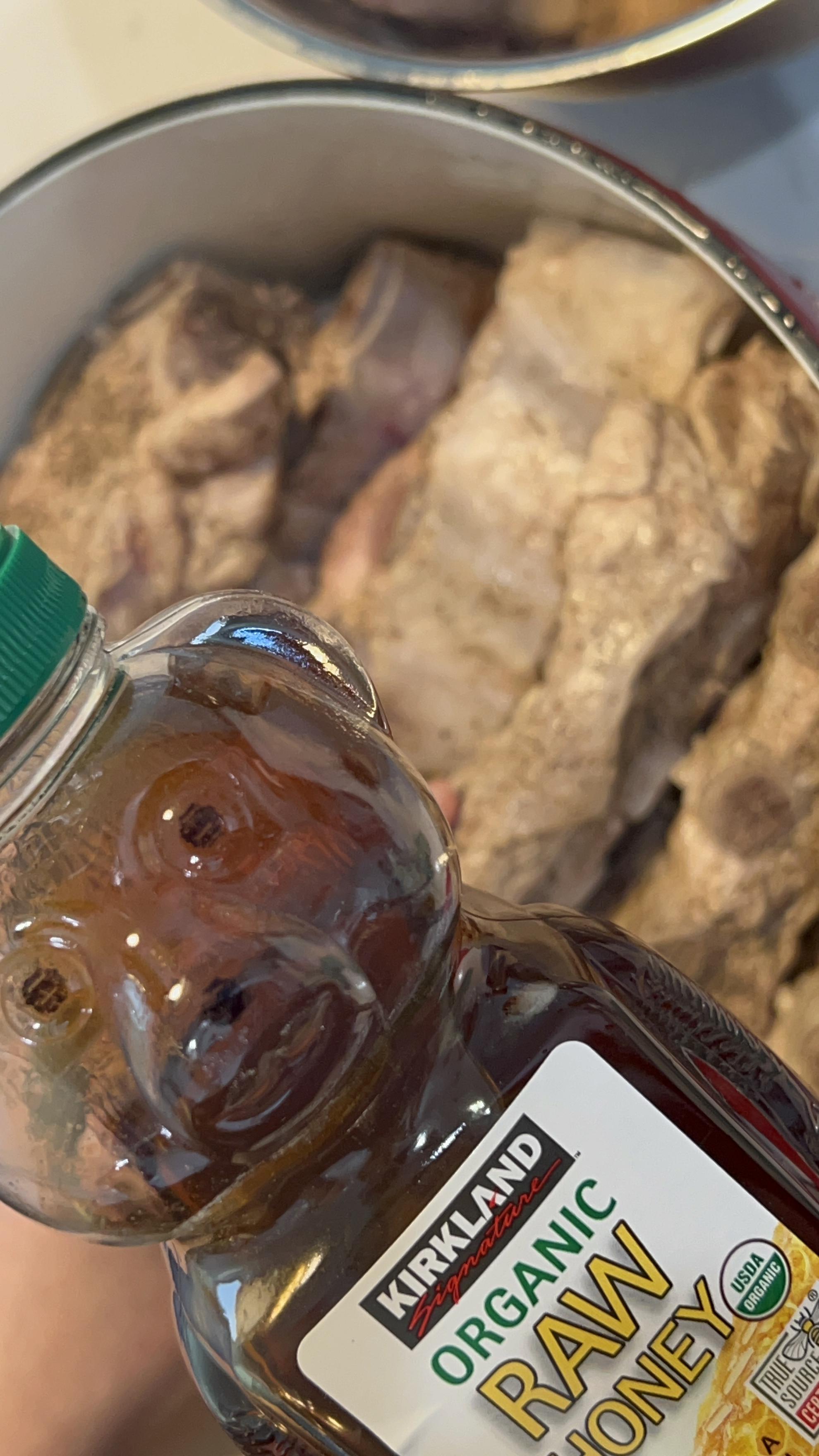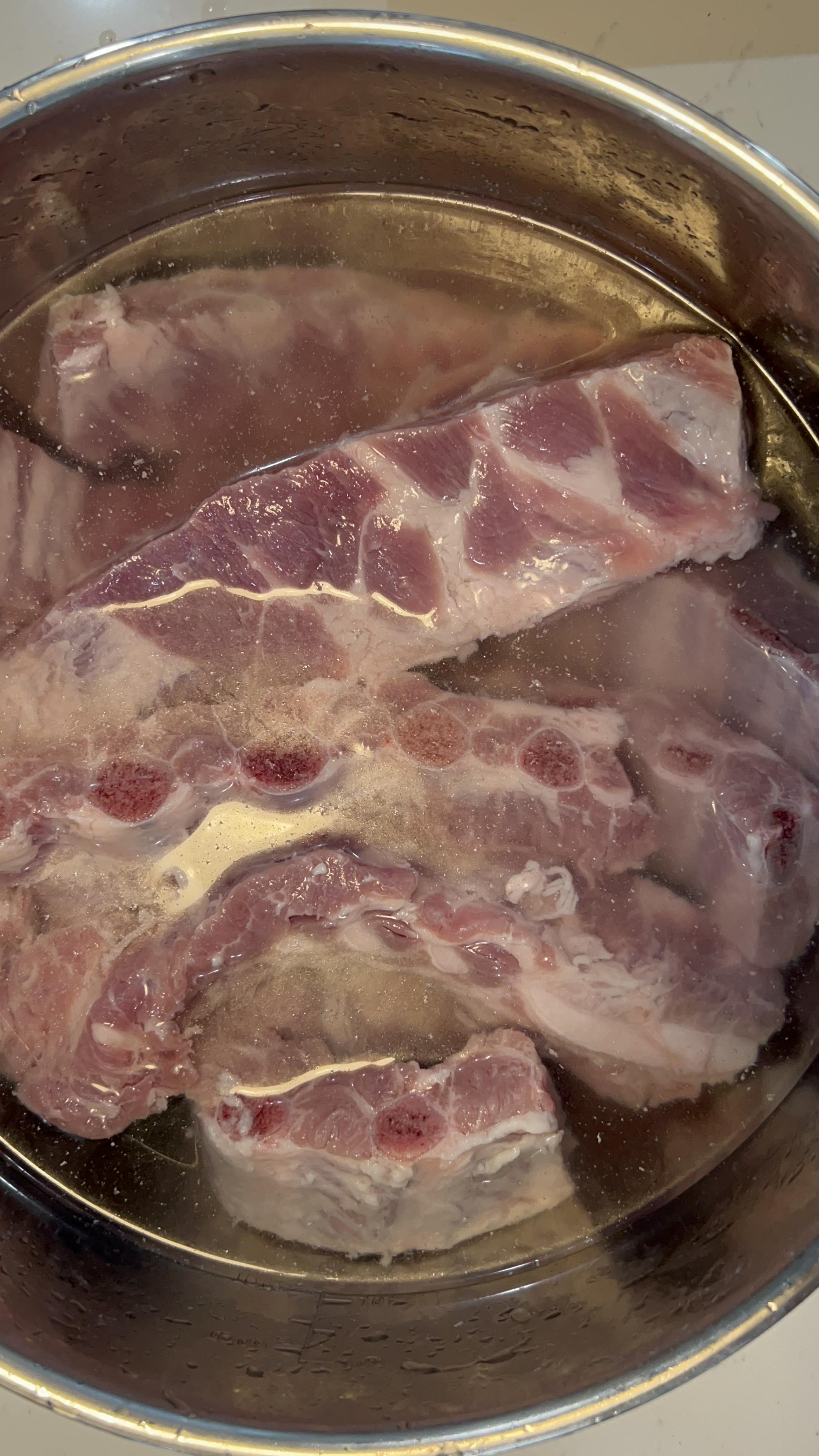 7. 등갈비를 냄비에 담아주고, 소금, 후추, 꿀을 넣고 한번 더 삶아줍니다.