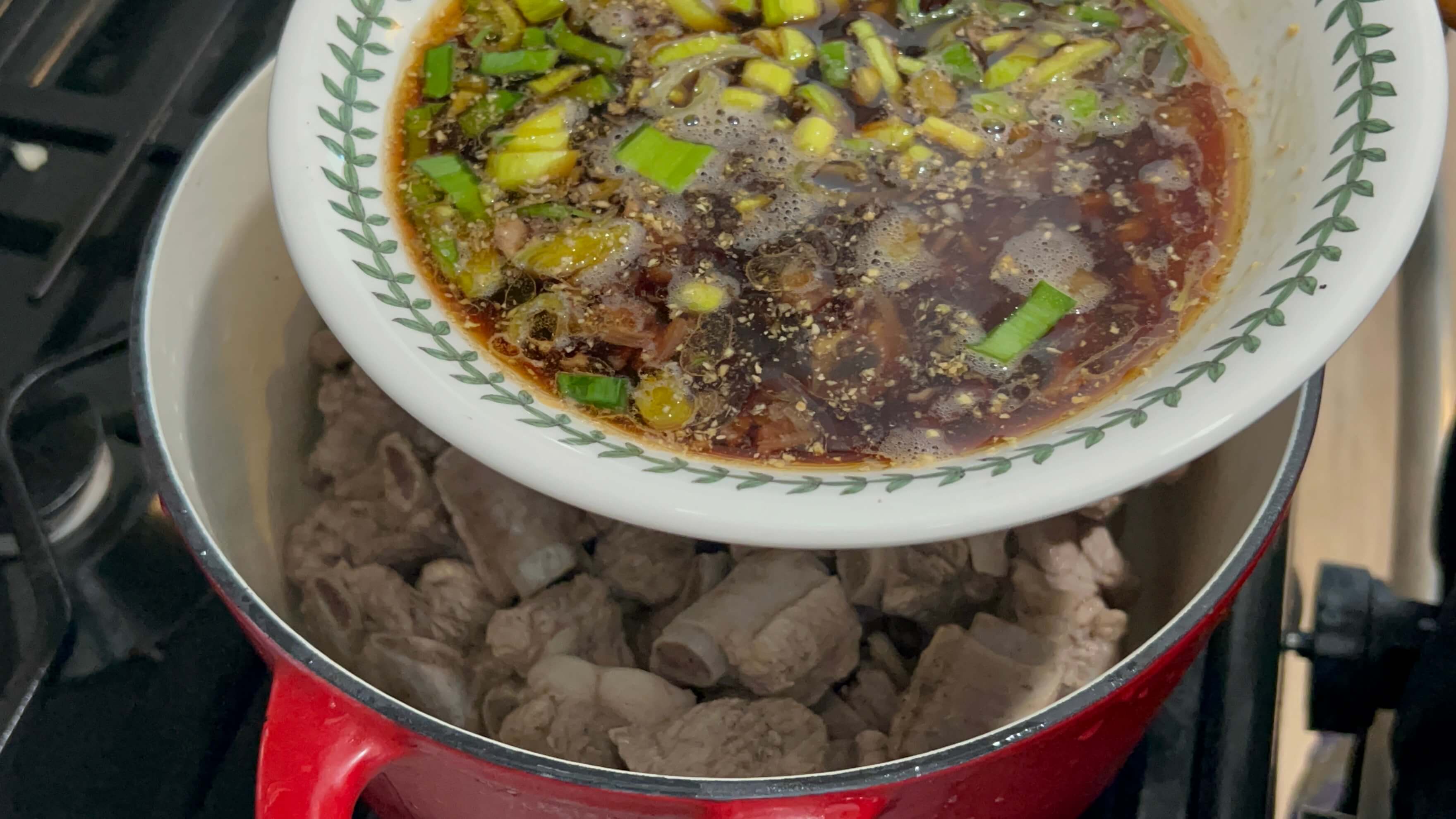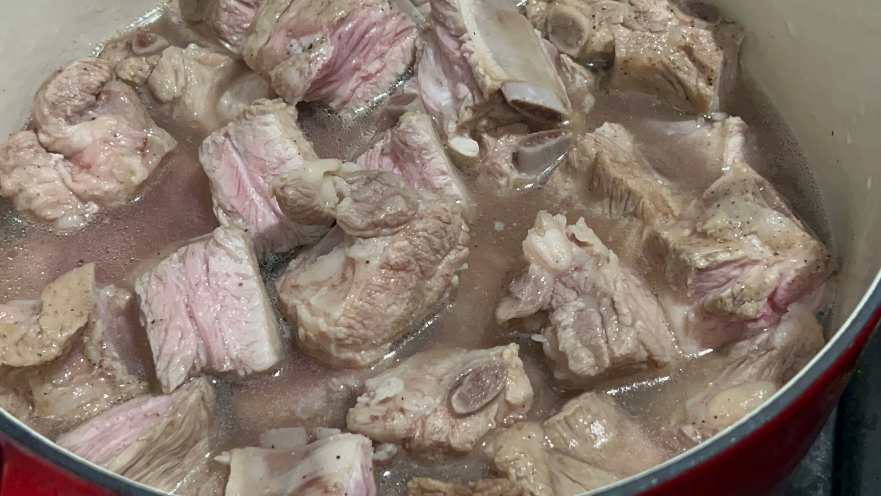9. 냄비에 등갈비를 이제 조각조각 잘라준 뒤, 생강가루를 넣고 한번 더 끓여줍니다.
