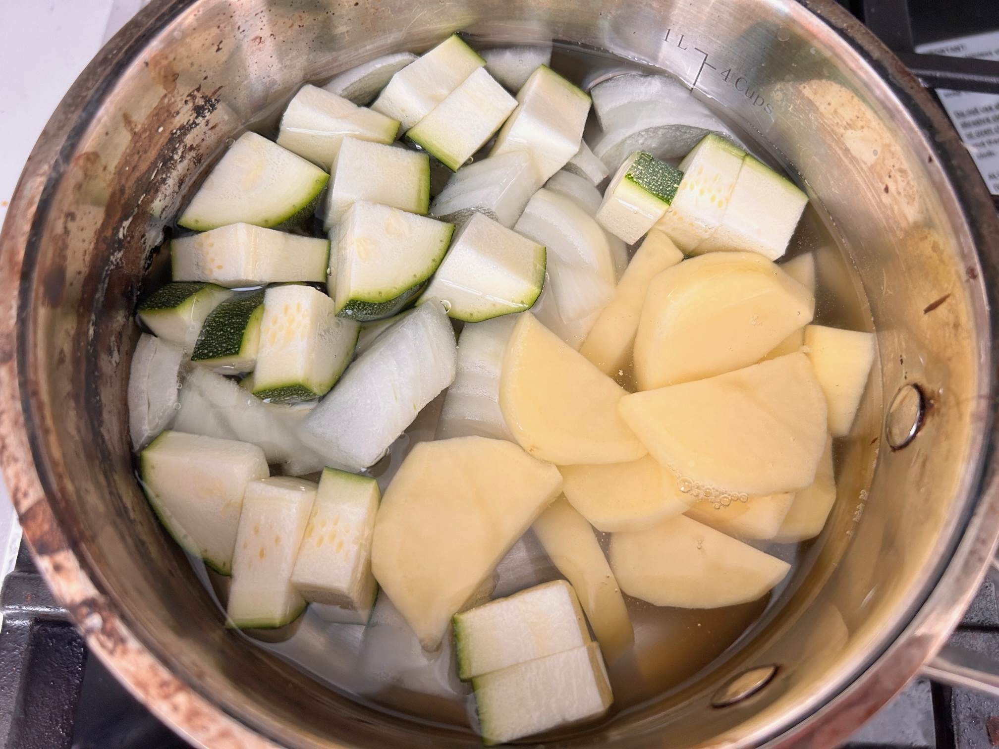 3. 냄비에 준비한 양파, 호박 감자를 넣어줍니다.