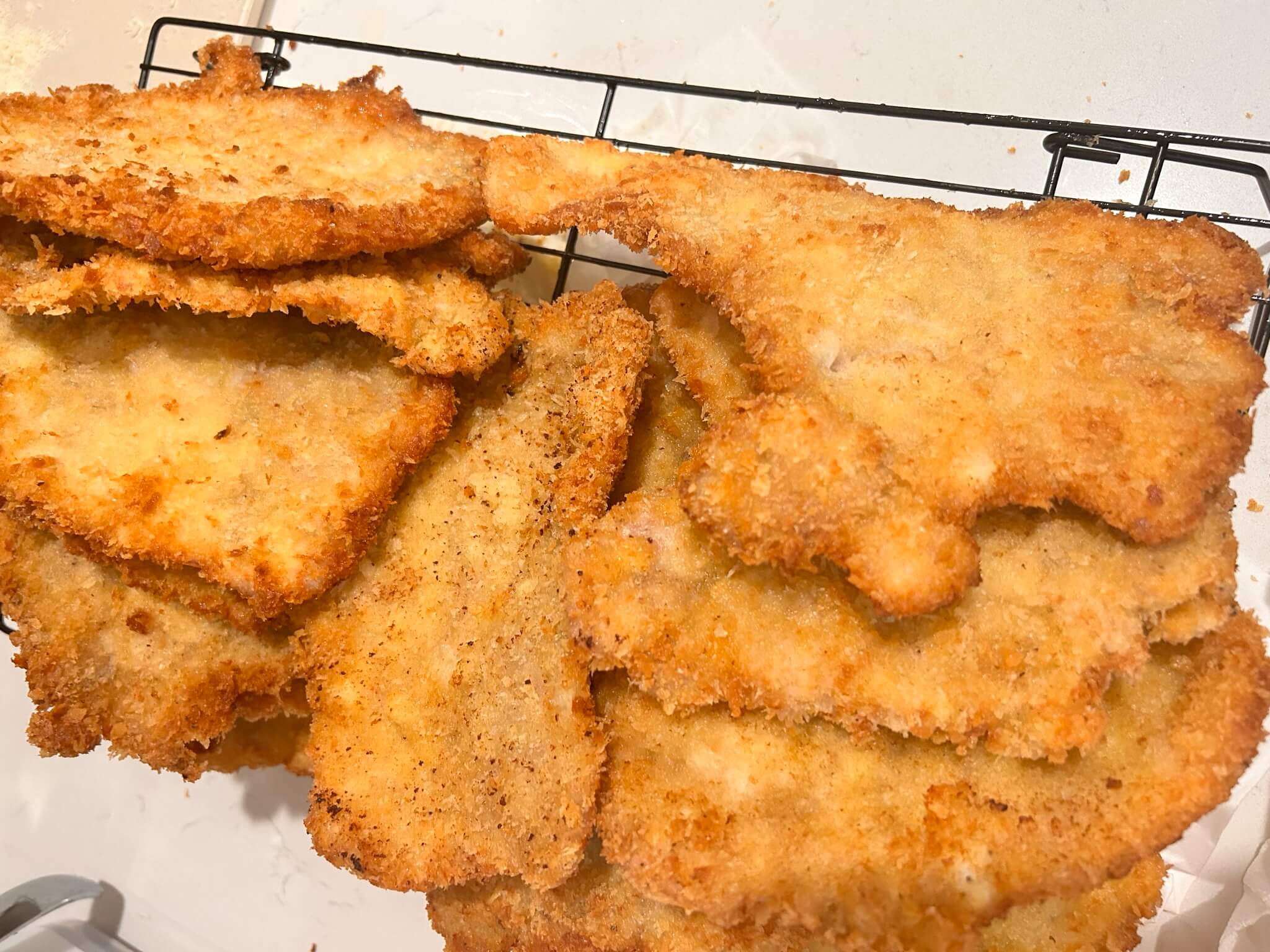 5. 빵까루까지 묻힌 돈까스는 차곡차곡 쟁반에 모아줍니다.
