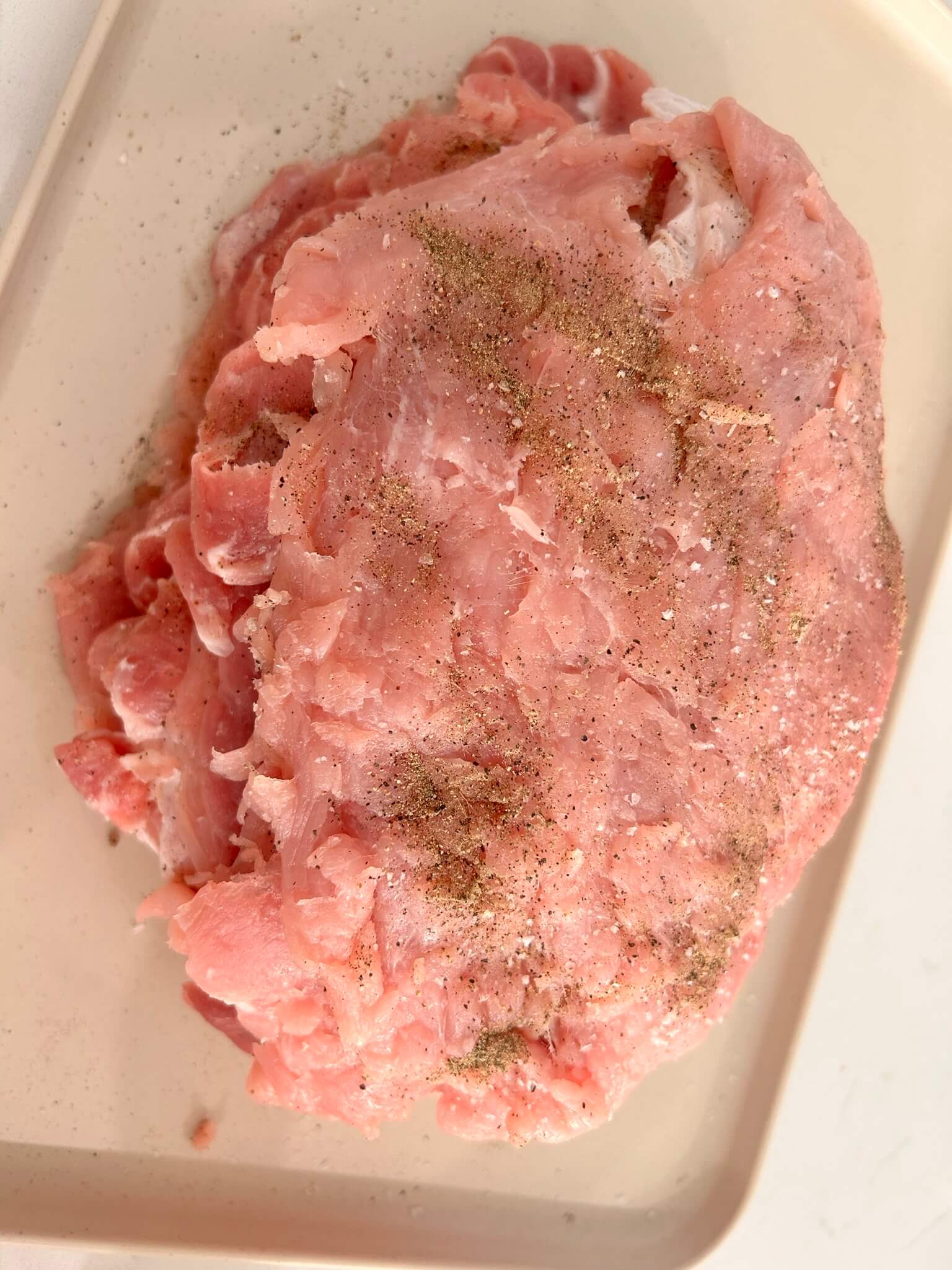 1. 등심을 고기다짐기로 얇아질 때까지 (취향에 맞는 두께까지) 다져줍니다.
