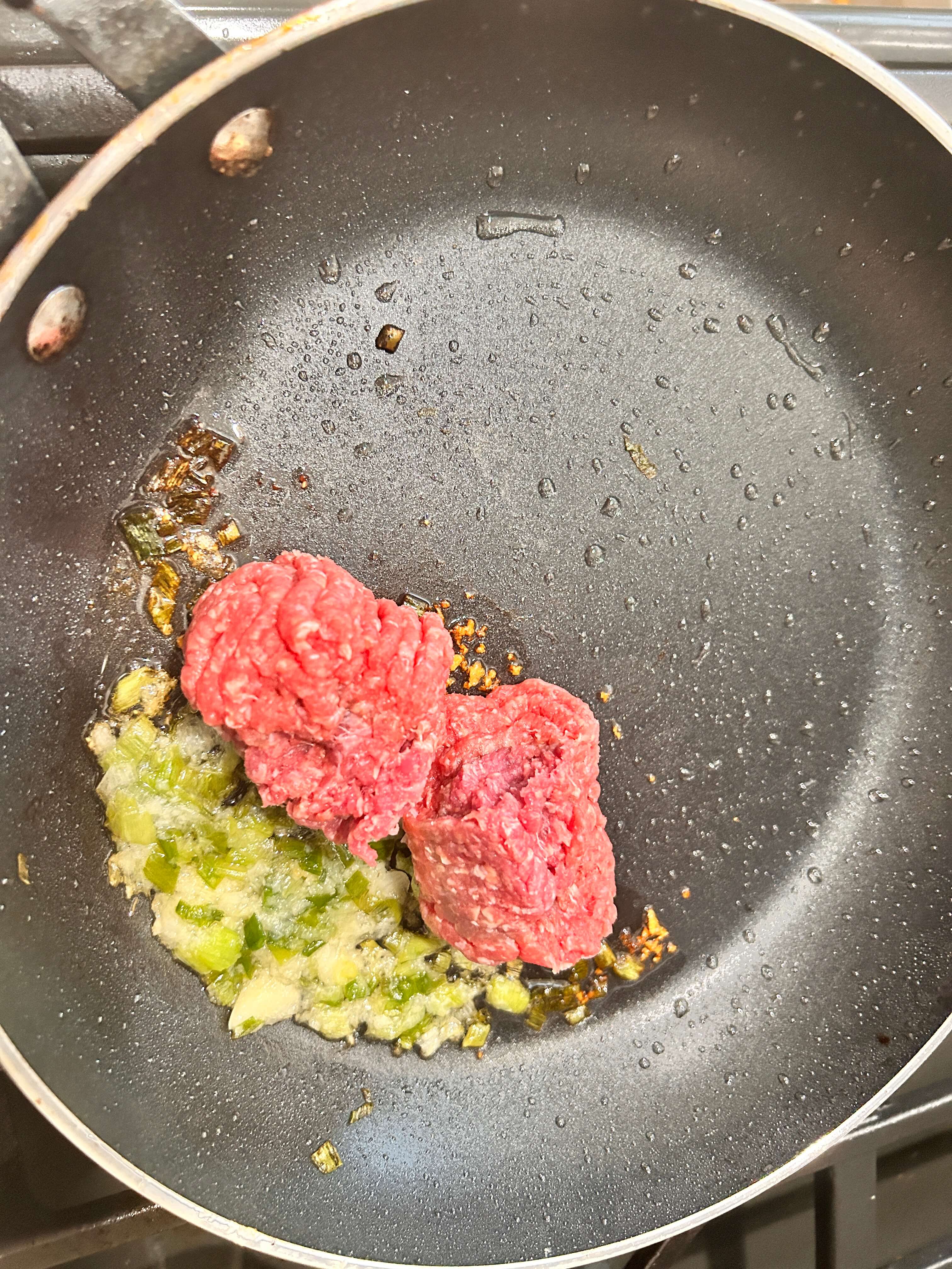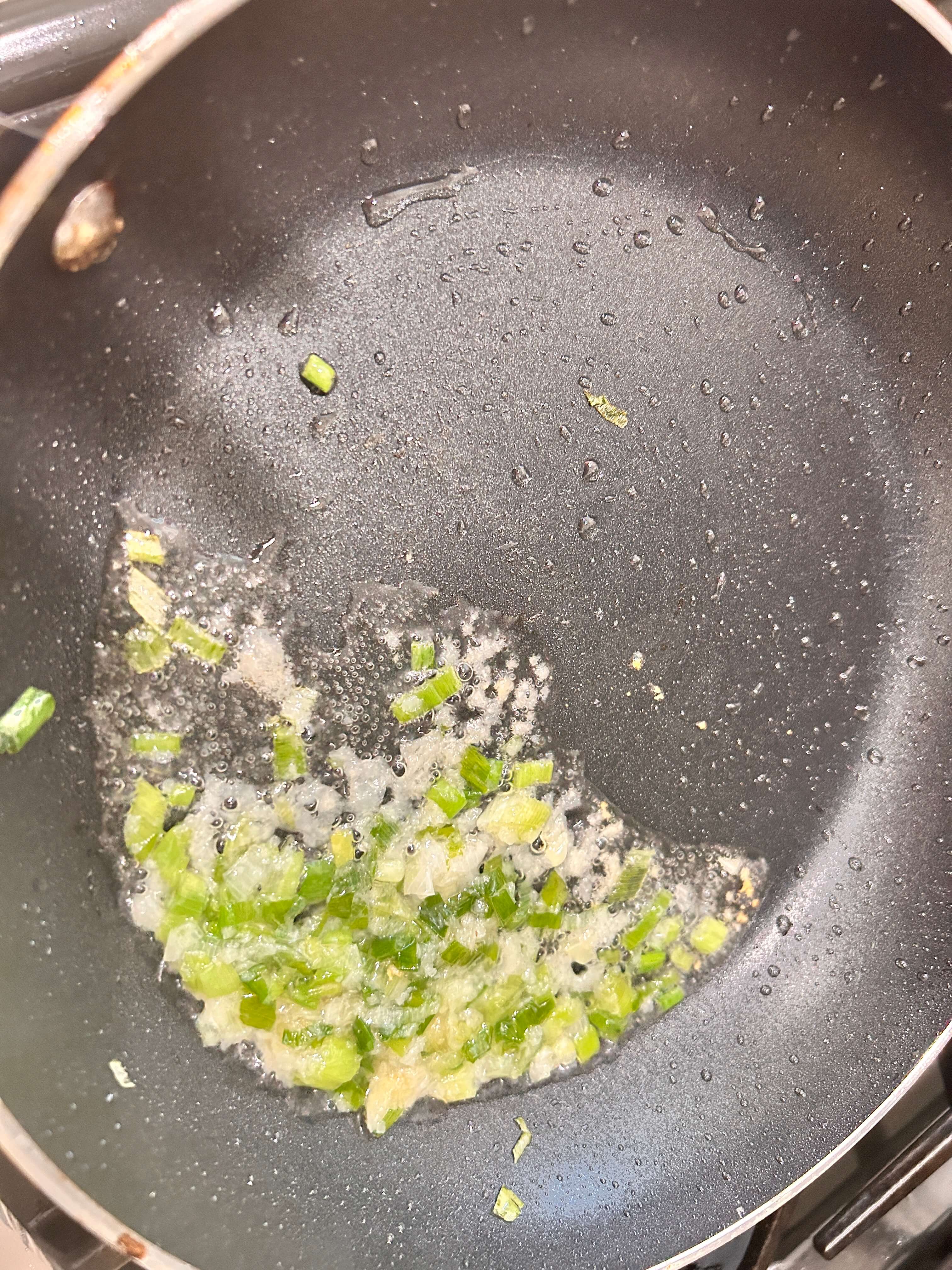 6. 프라이팬에 기름을 두르고 다진 마늘, 파를 넣어 기름을 내줍니다.