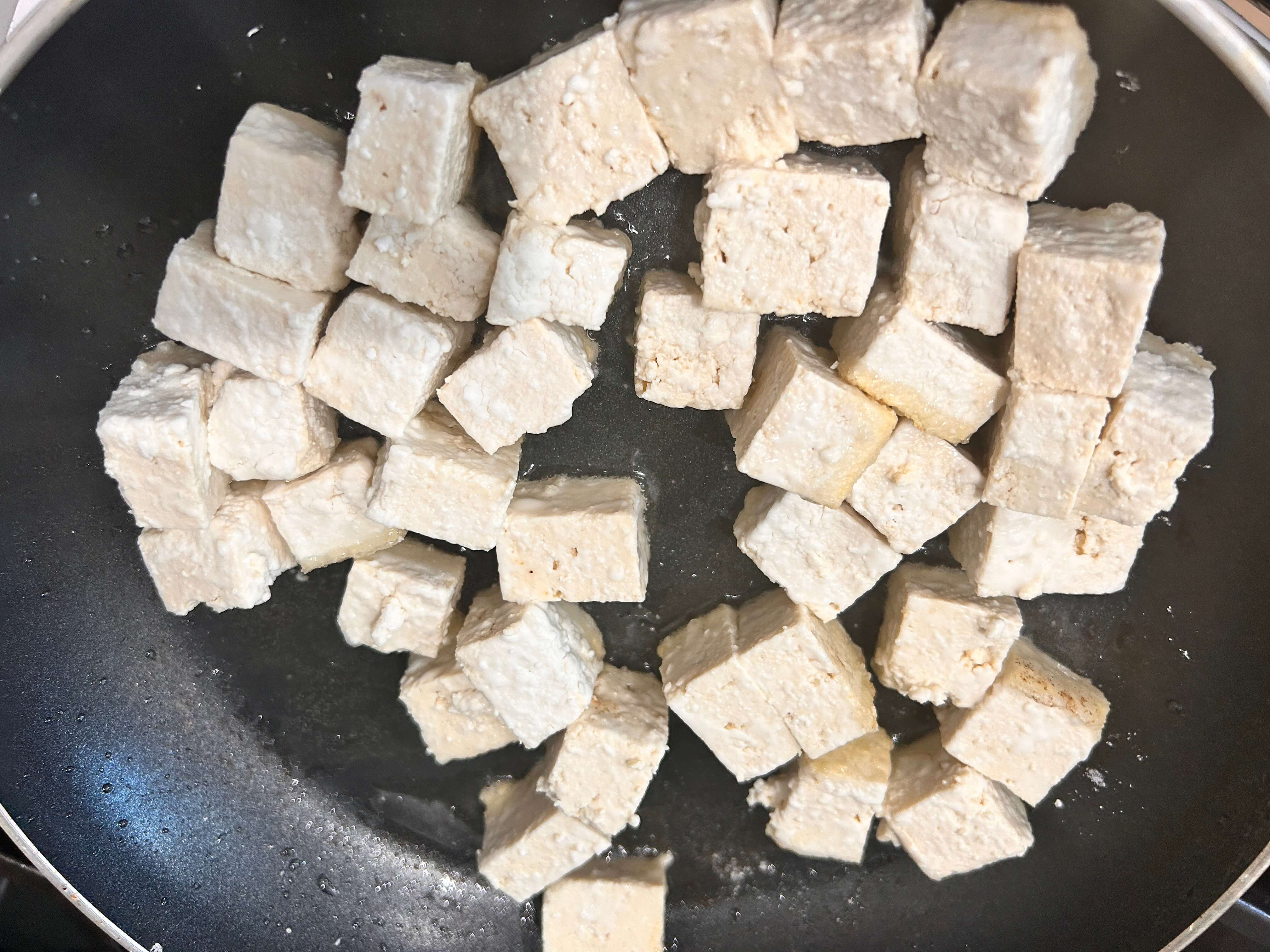 4. 프라이팬에 기름을 두른 뒤 전분가루 묻은 두부를 노릇노릇하게 익혀줍니다.