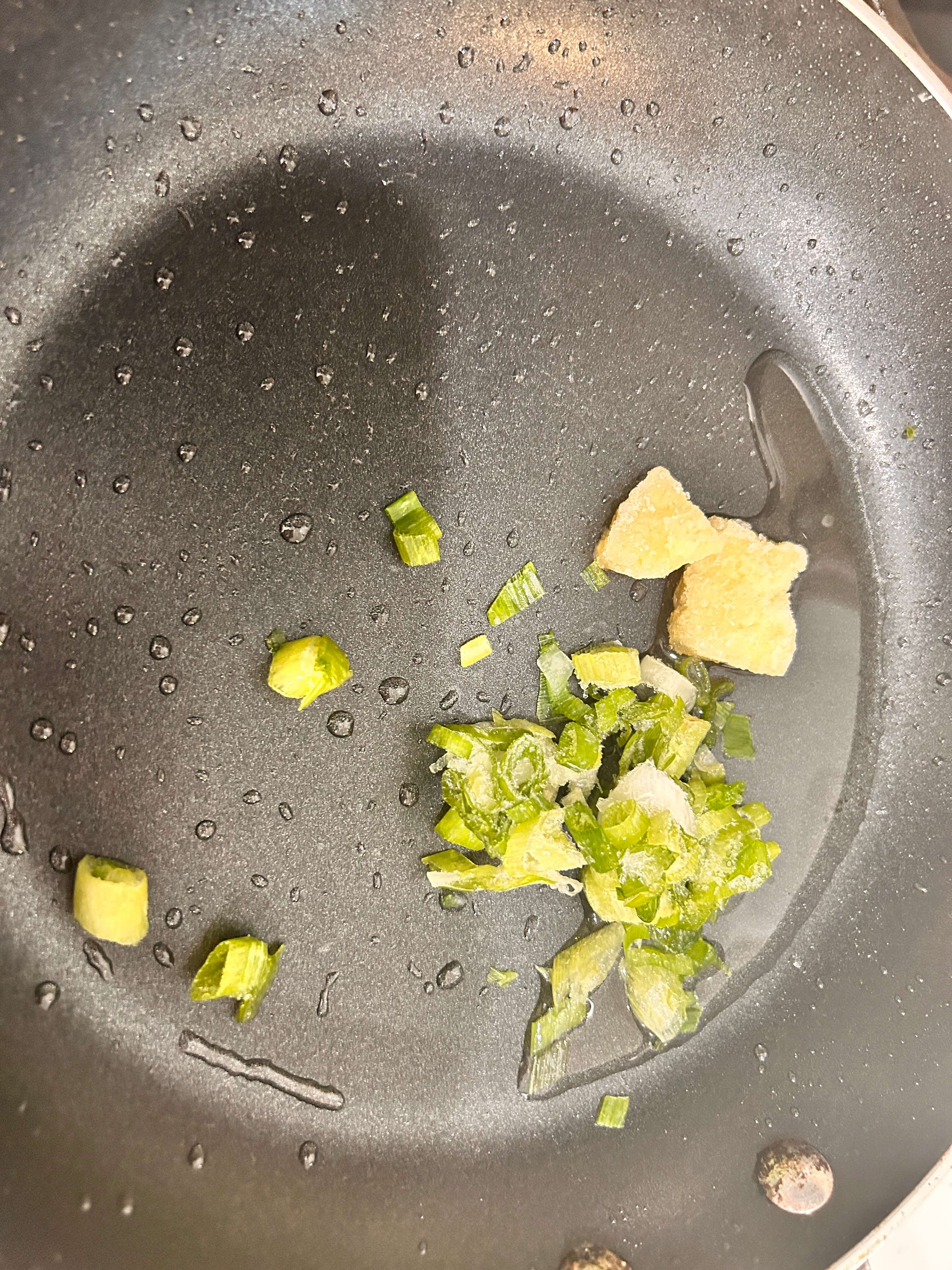 6. 프라이팬에 기름을 두르고 다진 마늘, 파를 넣어 기름을 내줍니다.