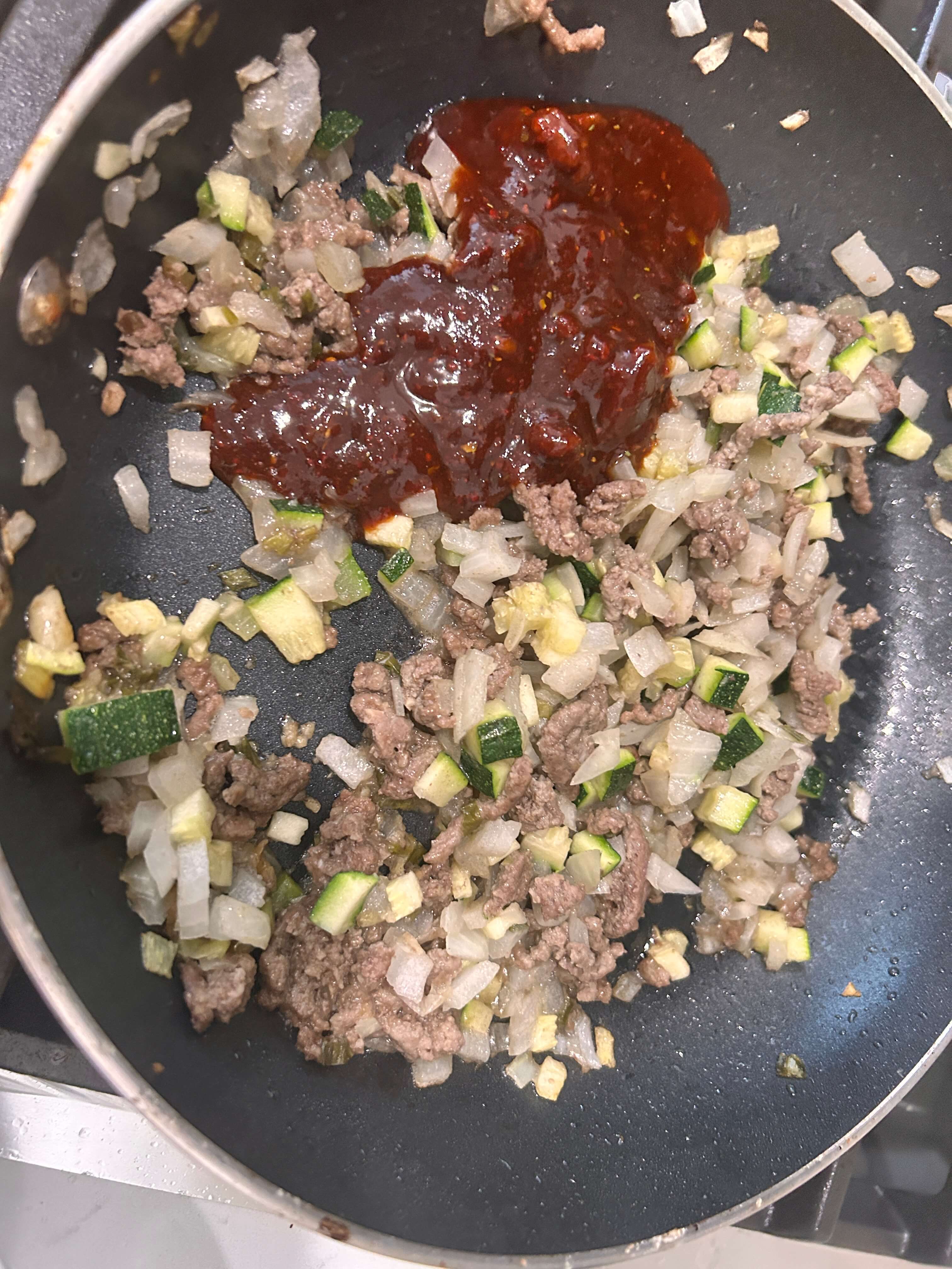 7. 다짐육을 넣어 노릇하게 볶아줍니다.