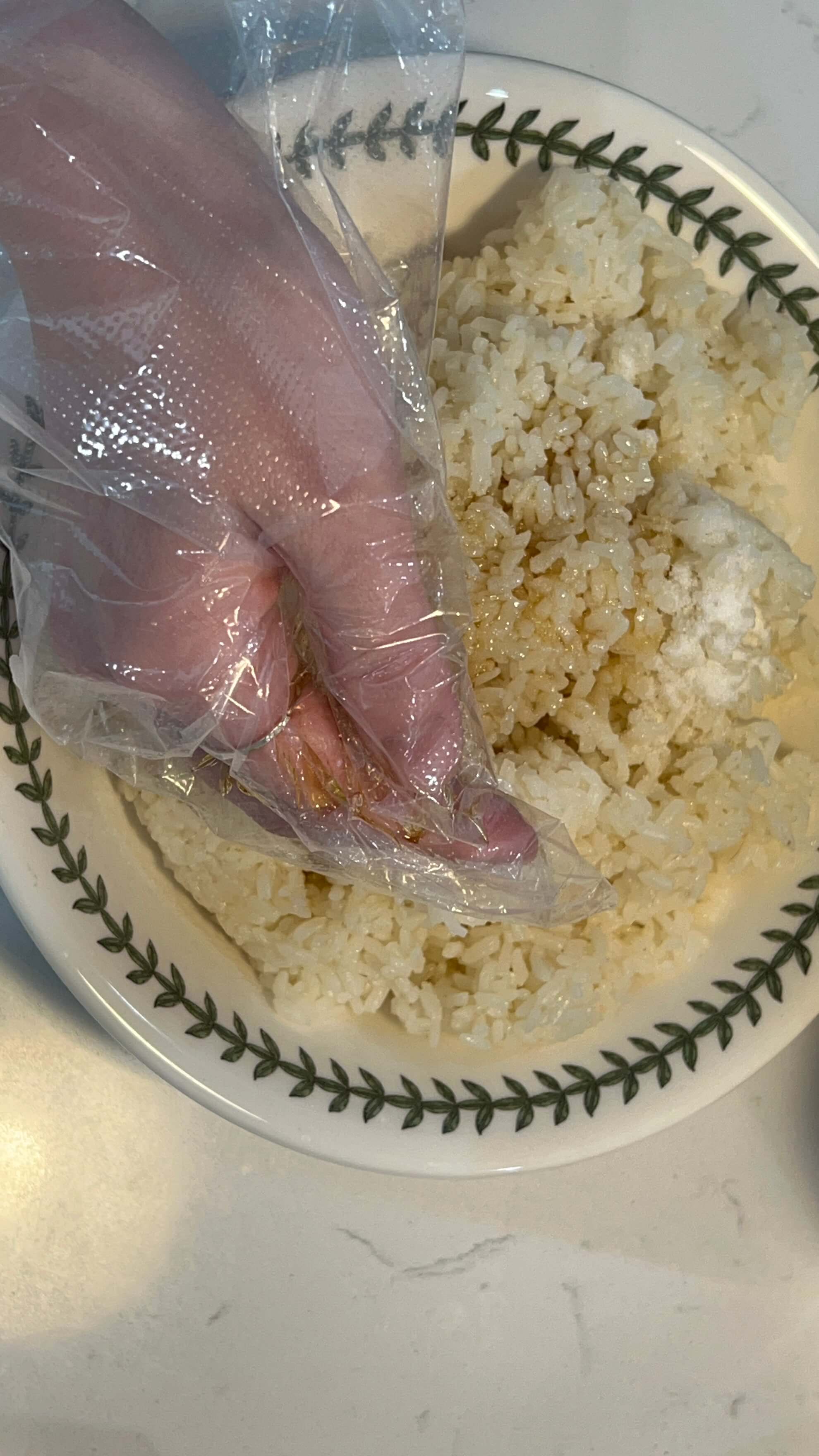 1. 밥에 소금 간을 넉넉히 해주시고 참기름을 넣고 잘 비벼줍니다.