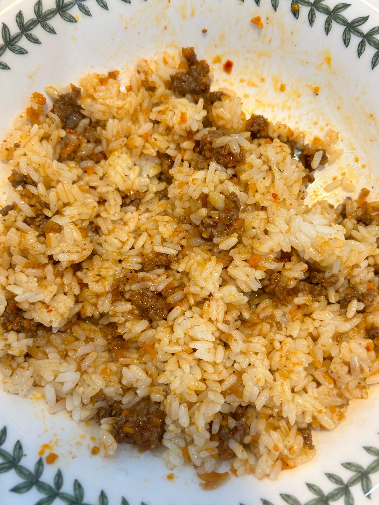 1. 적당한 밥에 고추장 만능 고기 양념장을 넣어 잘 비벼줍니다.