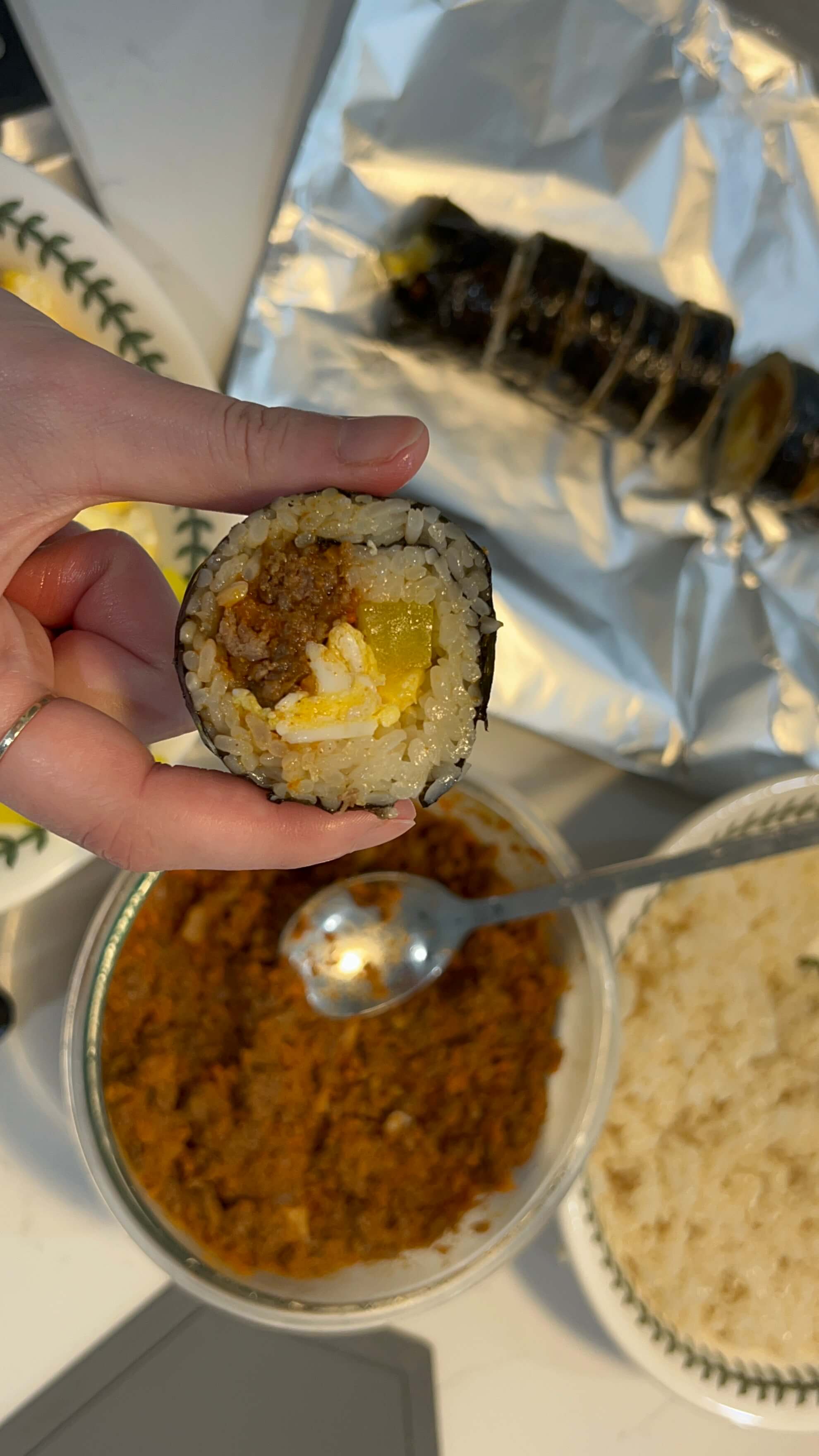 저번에 한 솥? 한 그릇정도로 만들어둔 고추장 만능 고기 양념장으로 후다닥 김밥을 만들었습니다.
