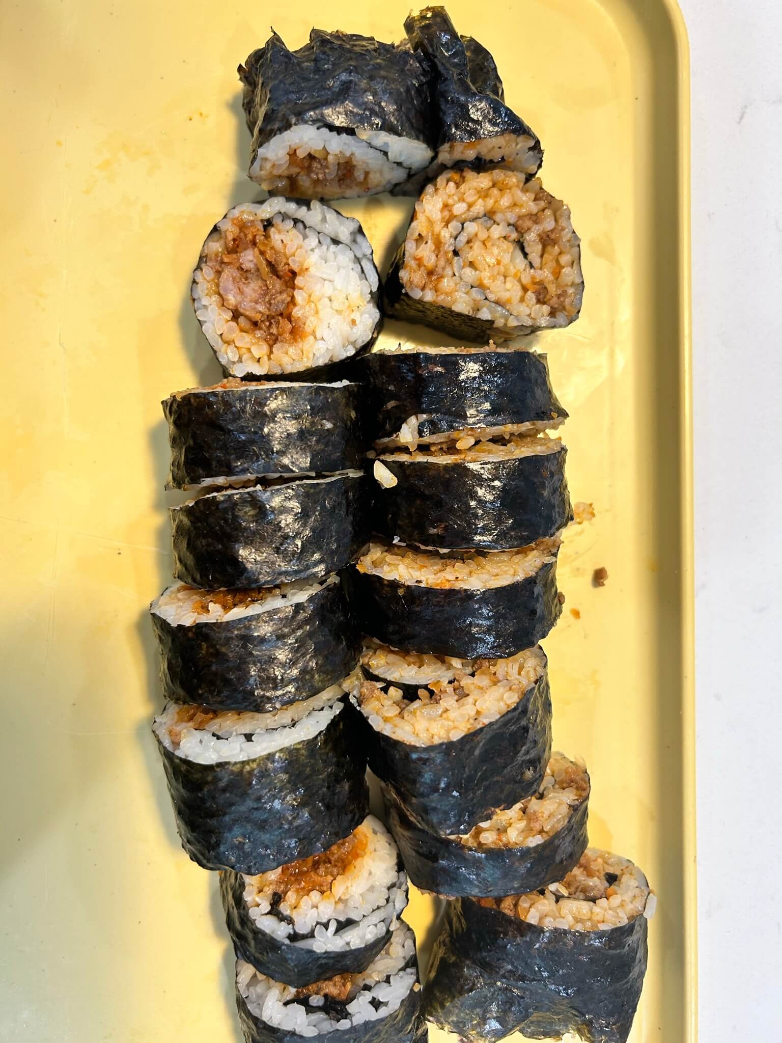 사진에 보시면 하얀 밥에 양념장이 들어있는 김밥도 있는데요, 양이 부족하길래 한 줄 더 만들었던 건데 귀찮다 보니 그냥 밥에 양념장 넣어서 돌돌 말아주었습니다.