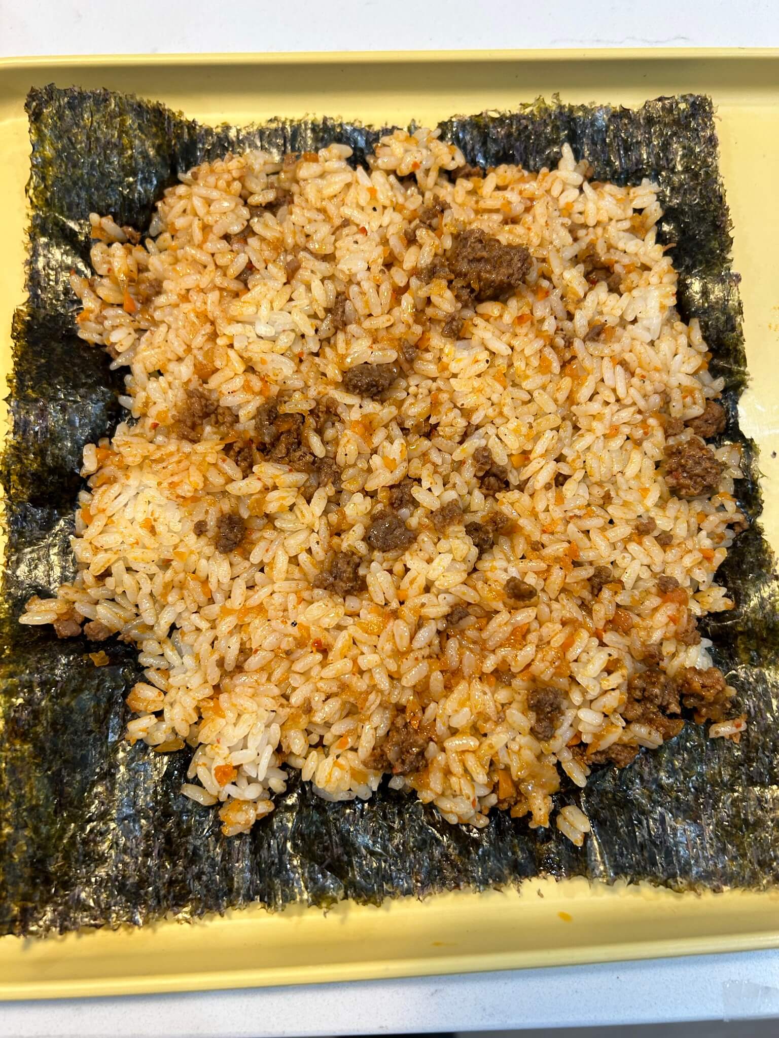 2. 김밥김에 비벼놓은 밥을 골고루 잘 펴줍니다.