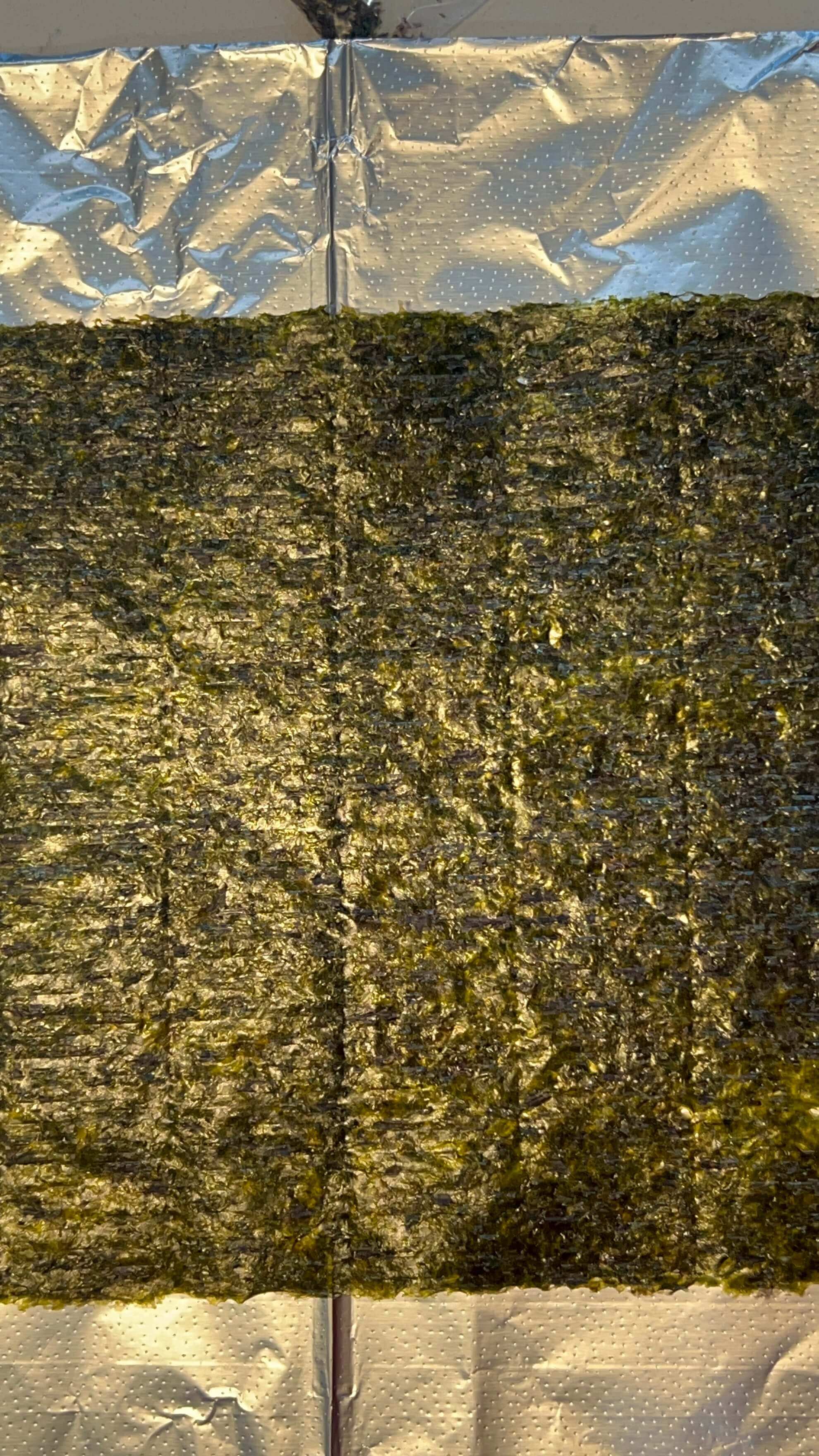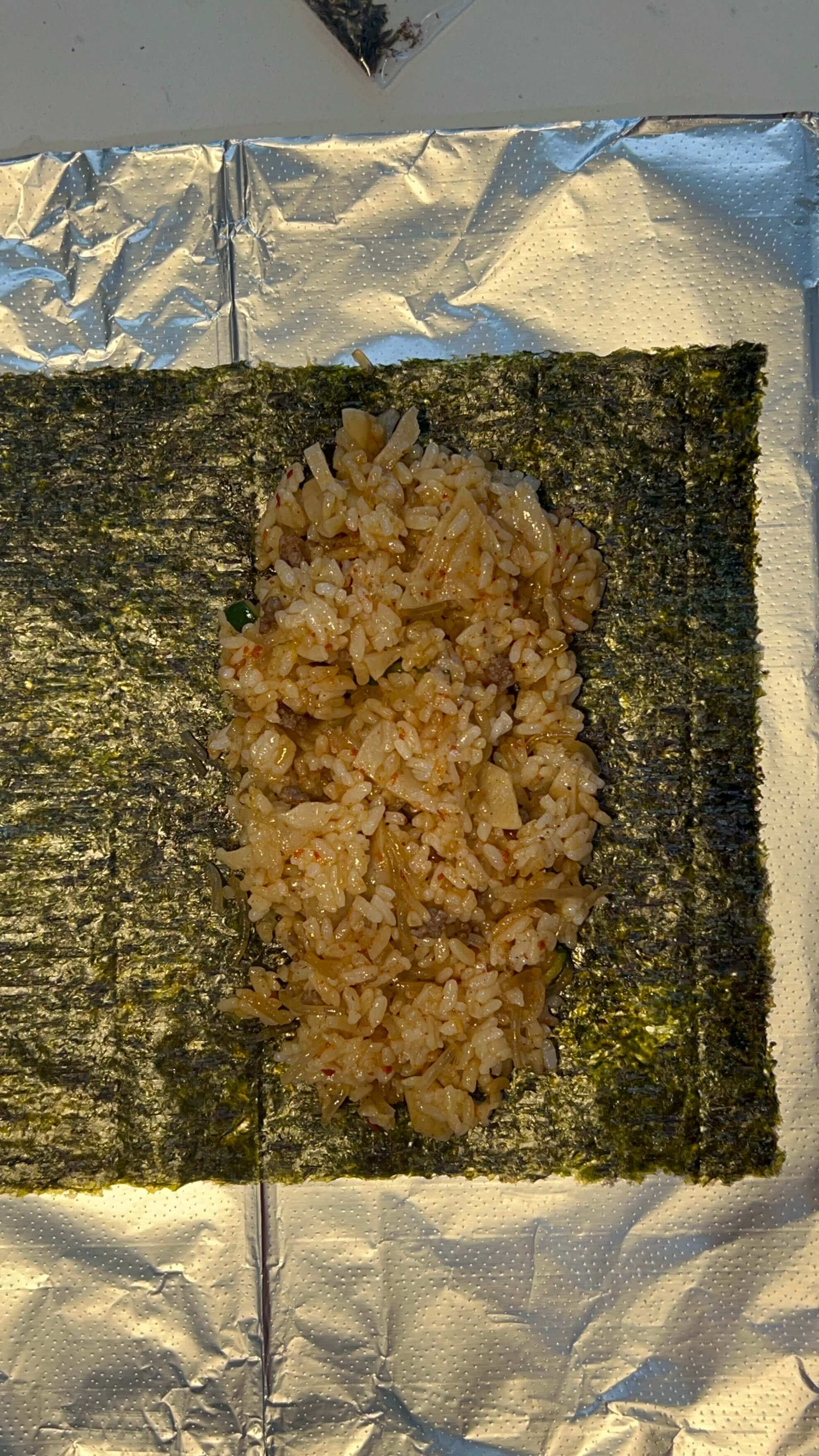 4. 김밥김을 준비하시고 양념된 밥을 잘 펴 줍니다.