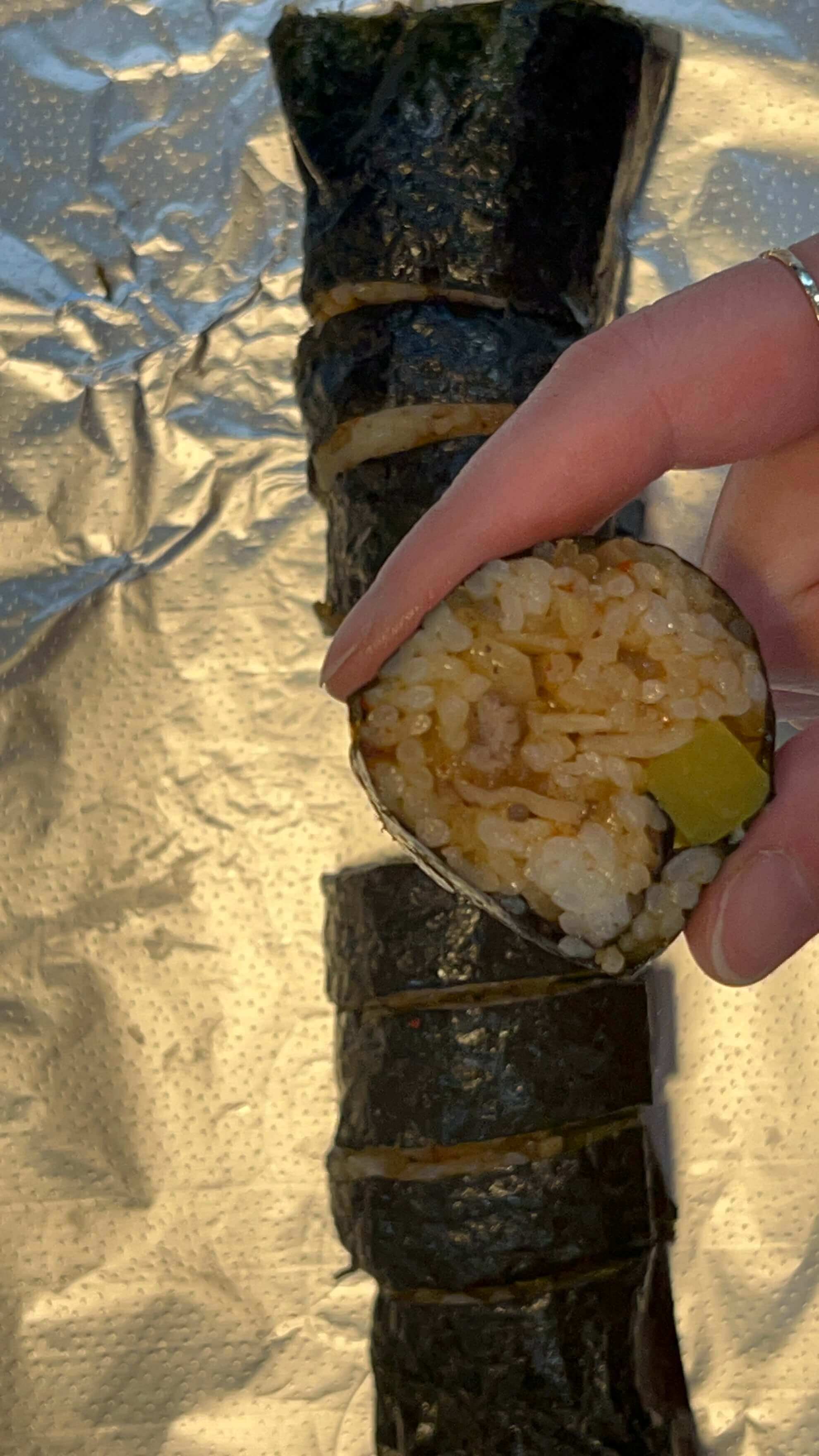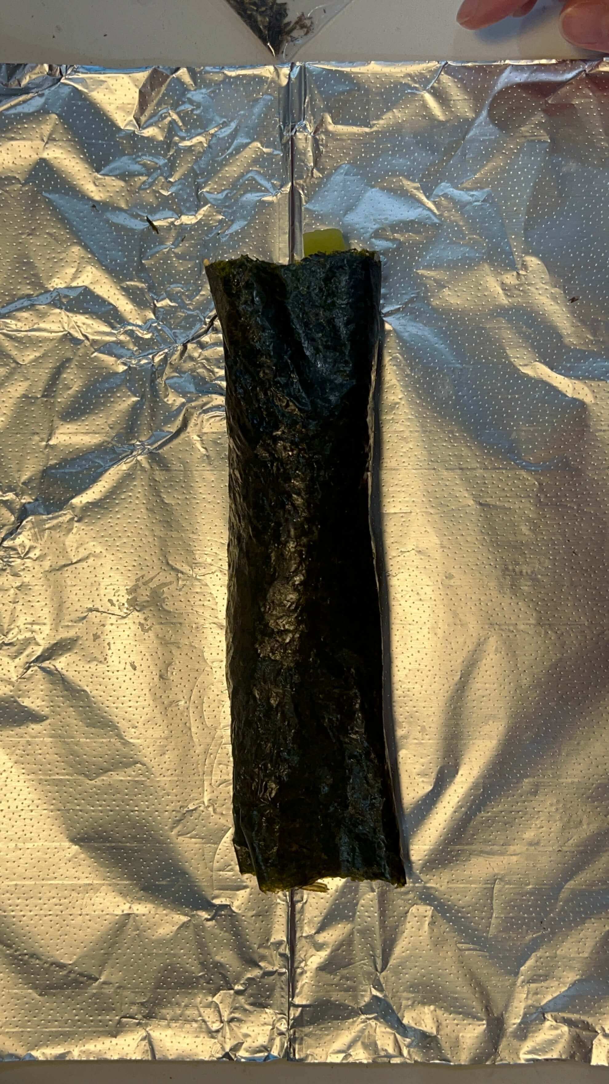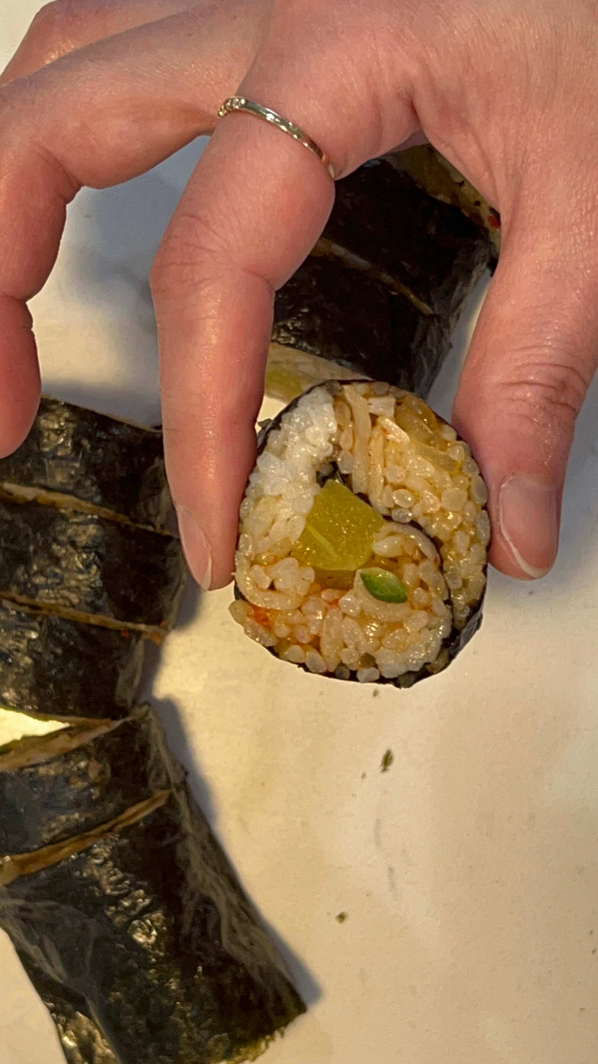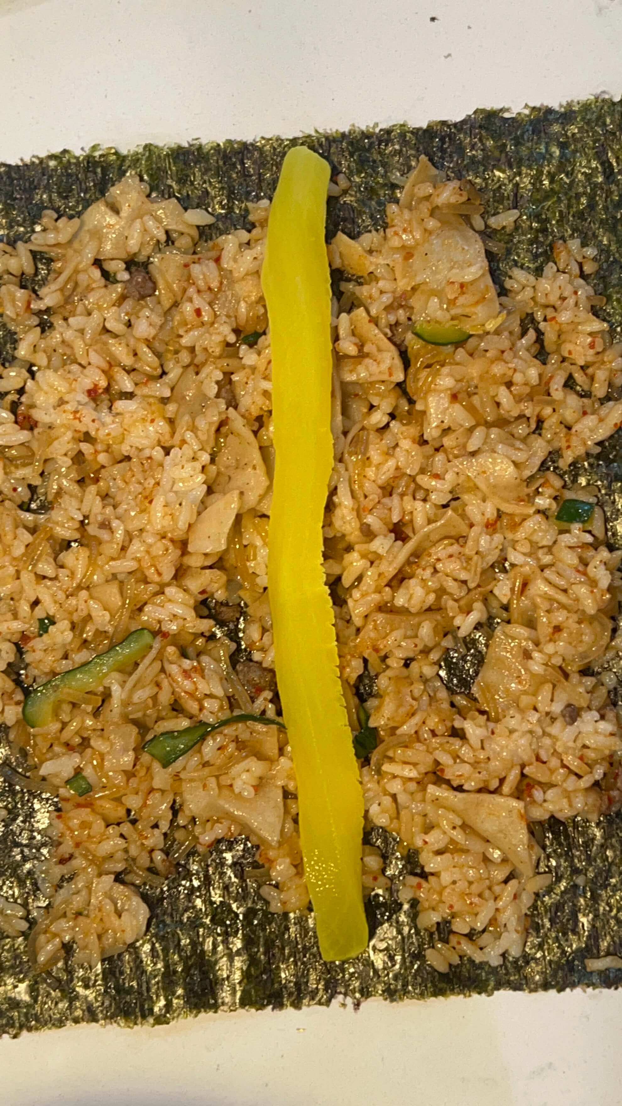 5. 김밥 단무지를 하나 넣고 말아줍니다.
