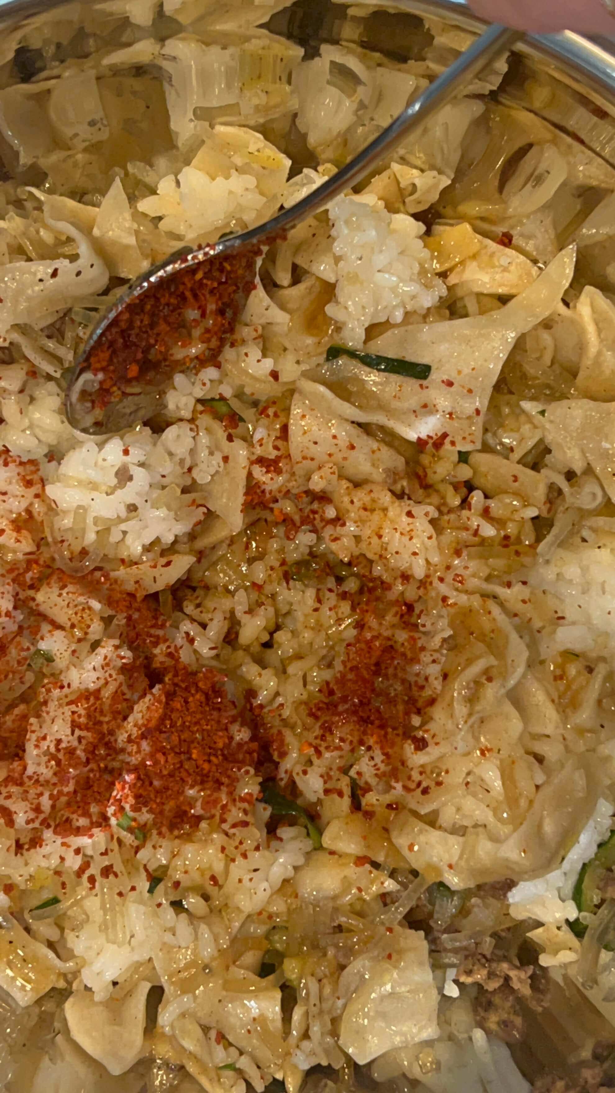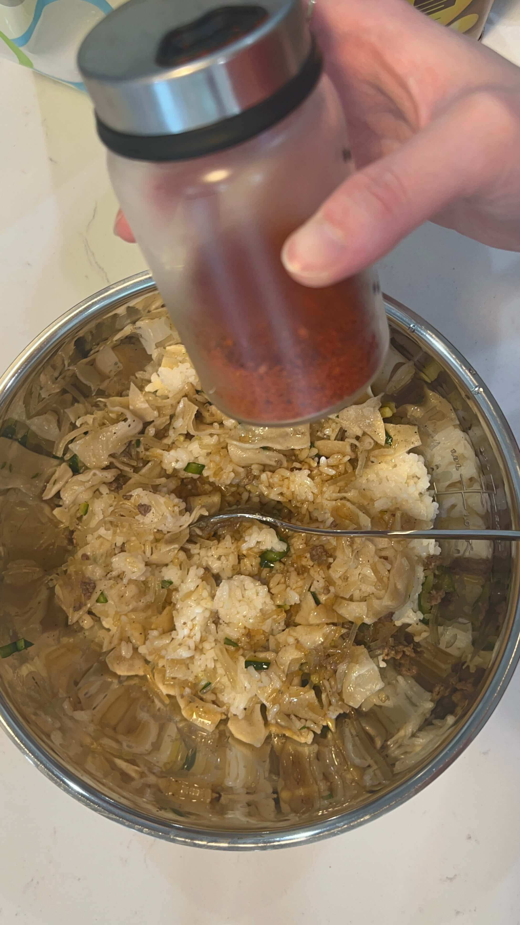 3. 잘 비빈 밥에 고춧가루를 솔솔 넣어 다시 비벼줍니다.