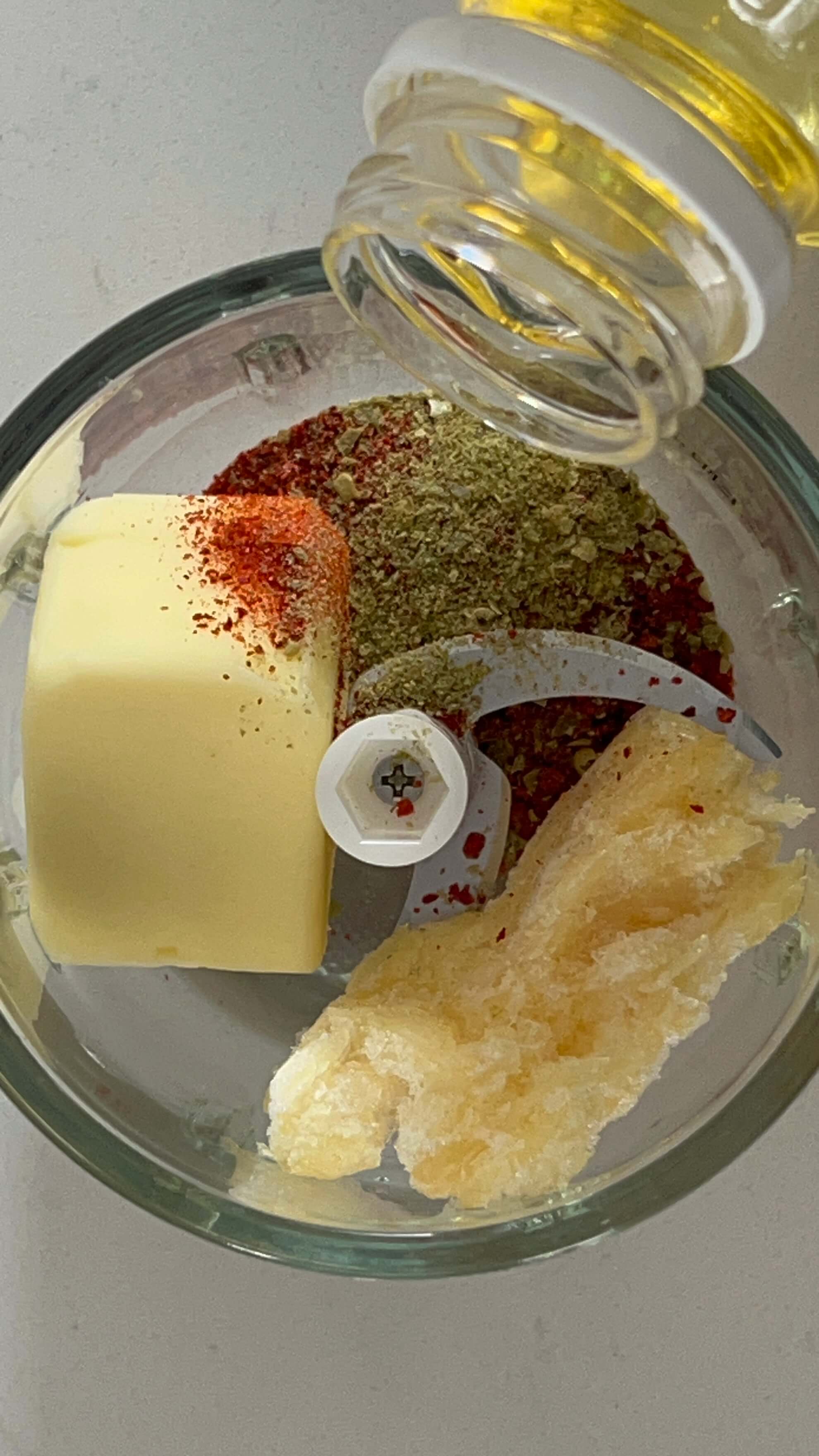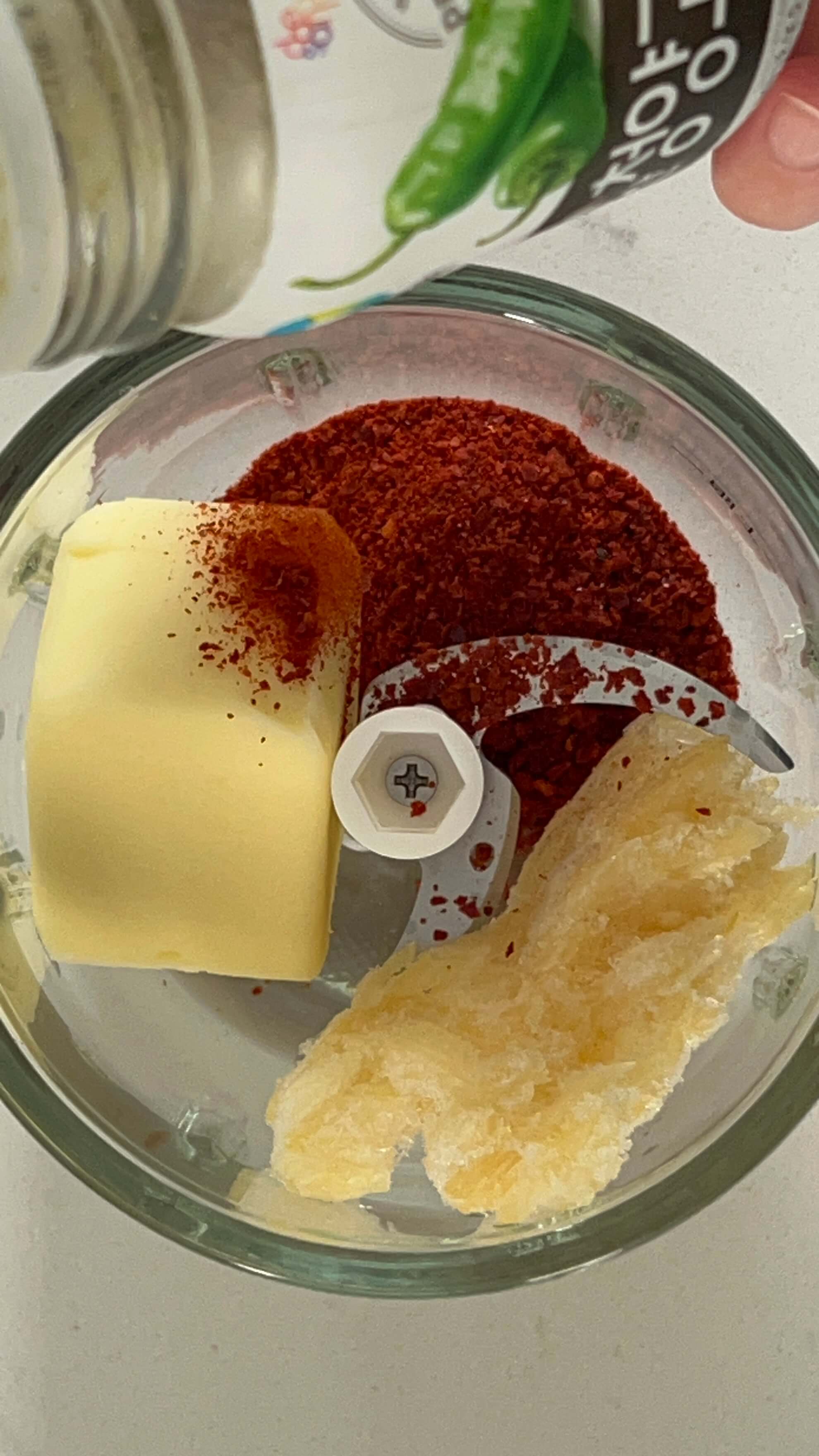 1. 작은 믹스기에 버터, 마늘, 고춧가루, 청양고추, 오일을 넣고 갈아줍니다.