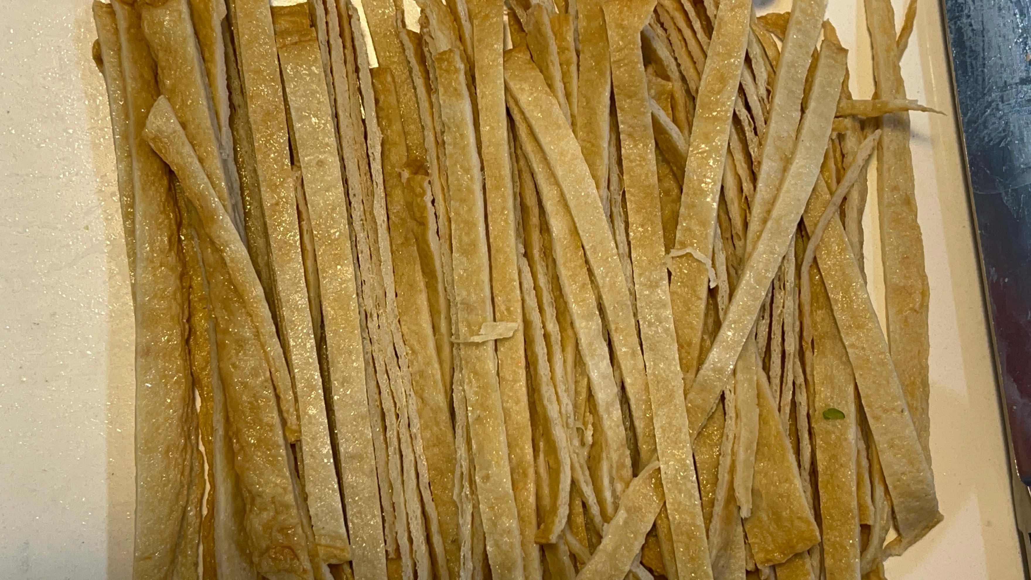 1. 사각어묵을 이렇게 길고 얇게 썰어서 준비해 줍니다.
