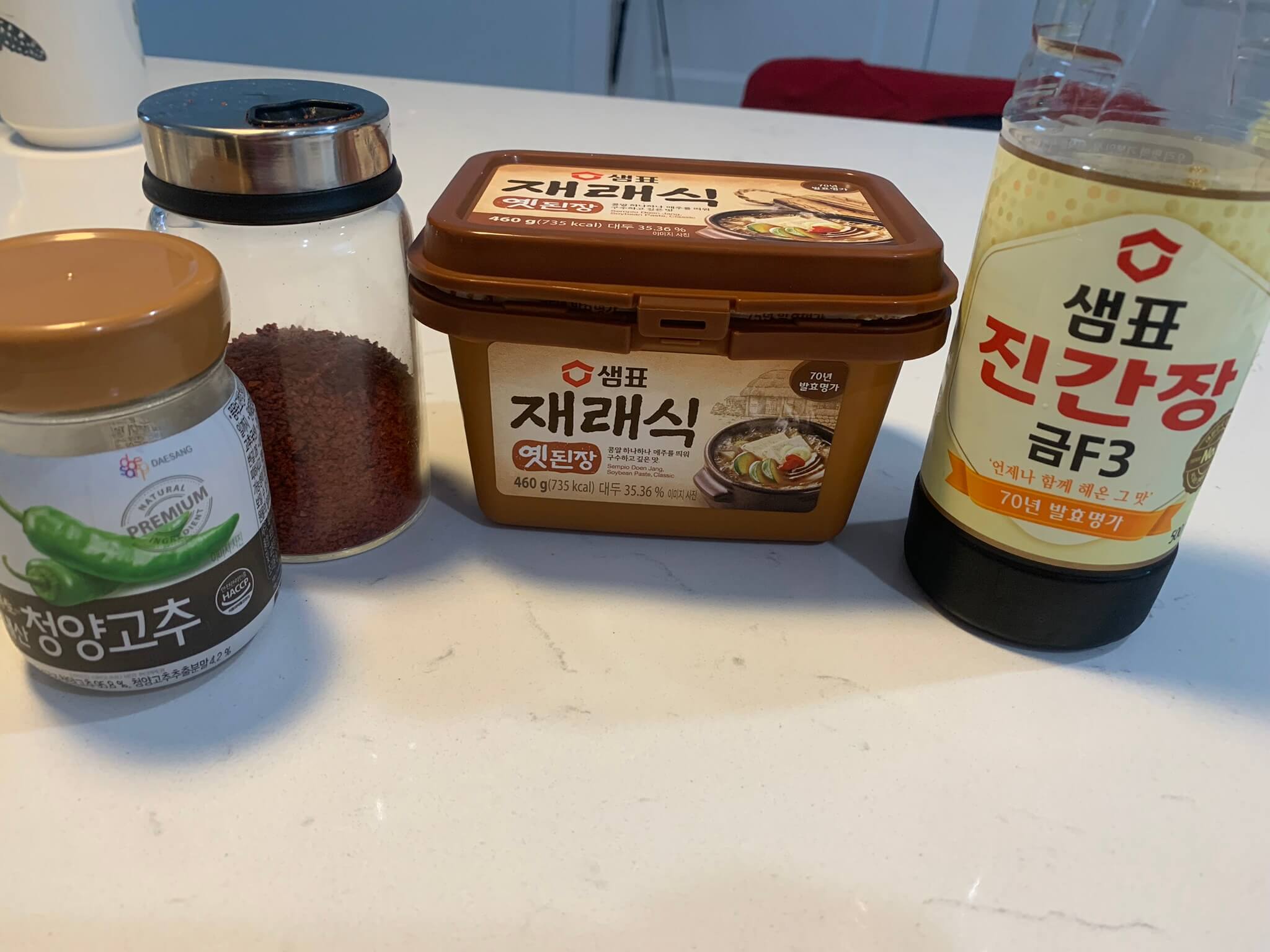 1. 양념재료는 이렇게 된장, 고춧가루, 간장, 청양고춧가루를 준비합니다.