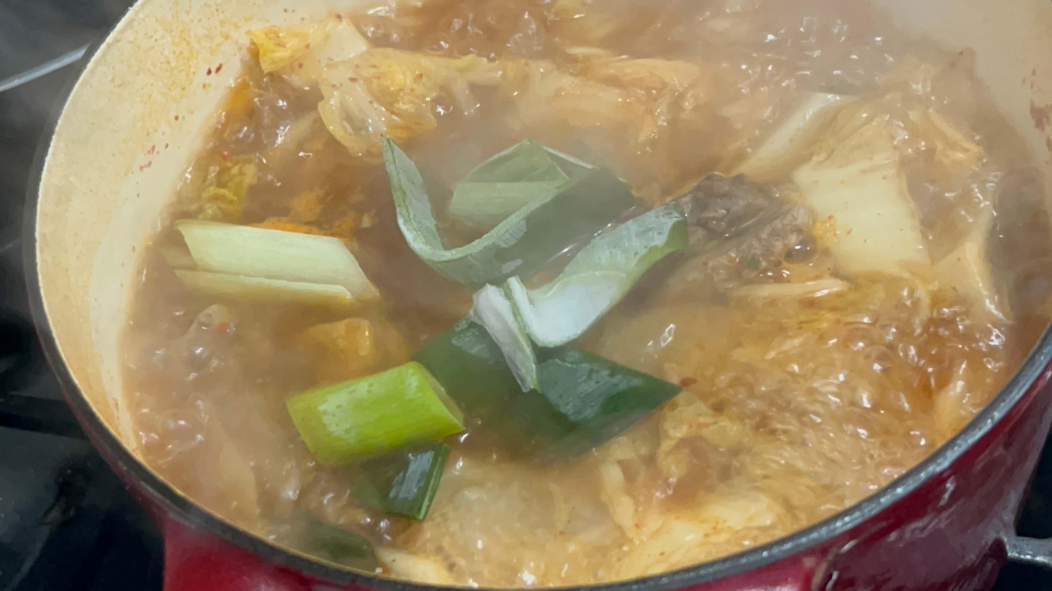 9. 무와 배추가 숨이 죽어 푹 끓여질 때쯤 대파를 넣어줍니다.