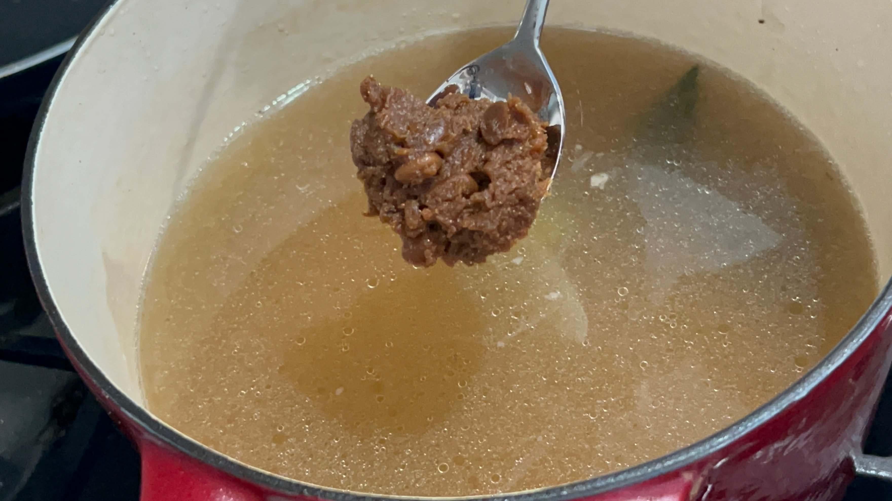 2. 진한 갈비탕 국물에 된장 한 숟가락을 넣어 잘 풀어 줍니다.
