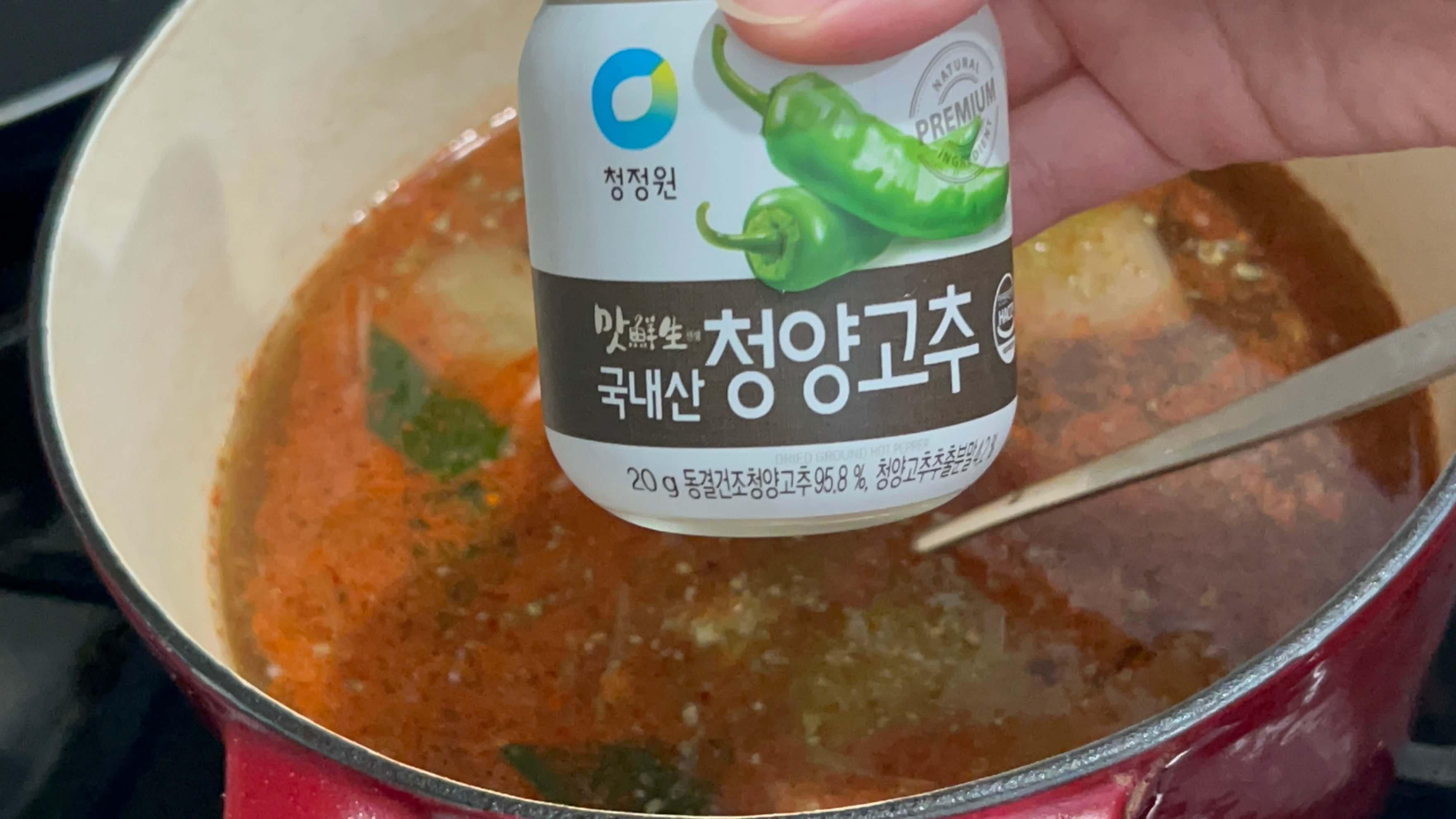 청양고추 생으로 있다면 가루보다는 신선한 청양고추를 넣어주시는 게 국물맛도 더 칼칼하고 맛있을 거라 생각됩니다.