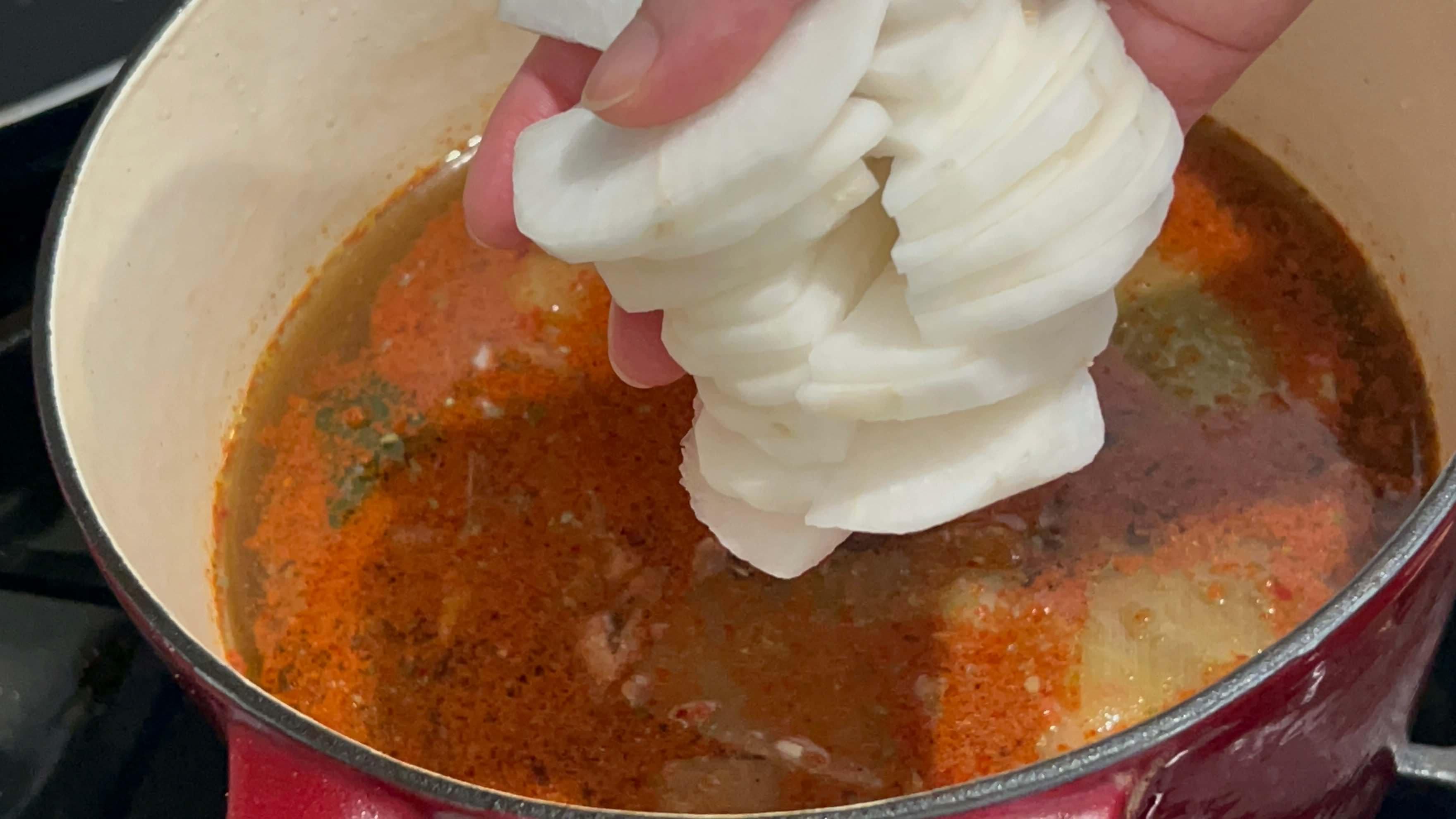 6. 국물의 시원함을 위해 무를 썰어서 넣어줍니다.