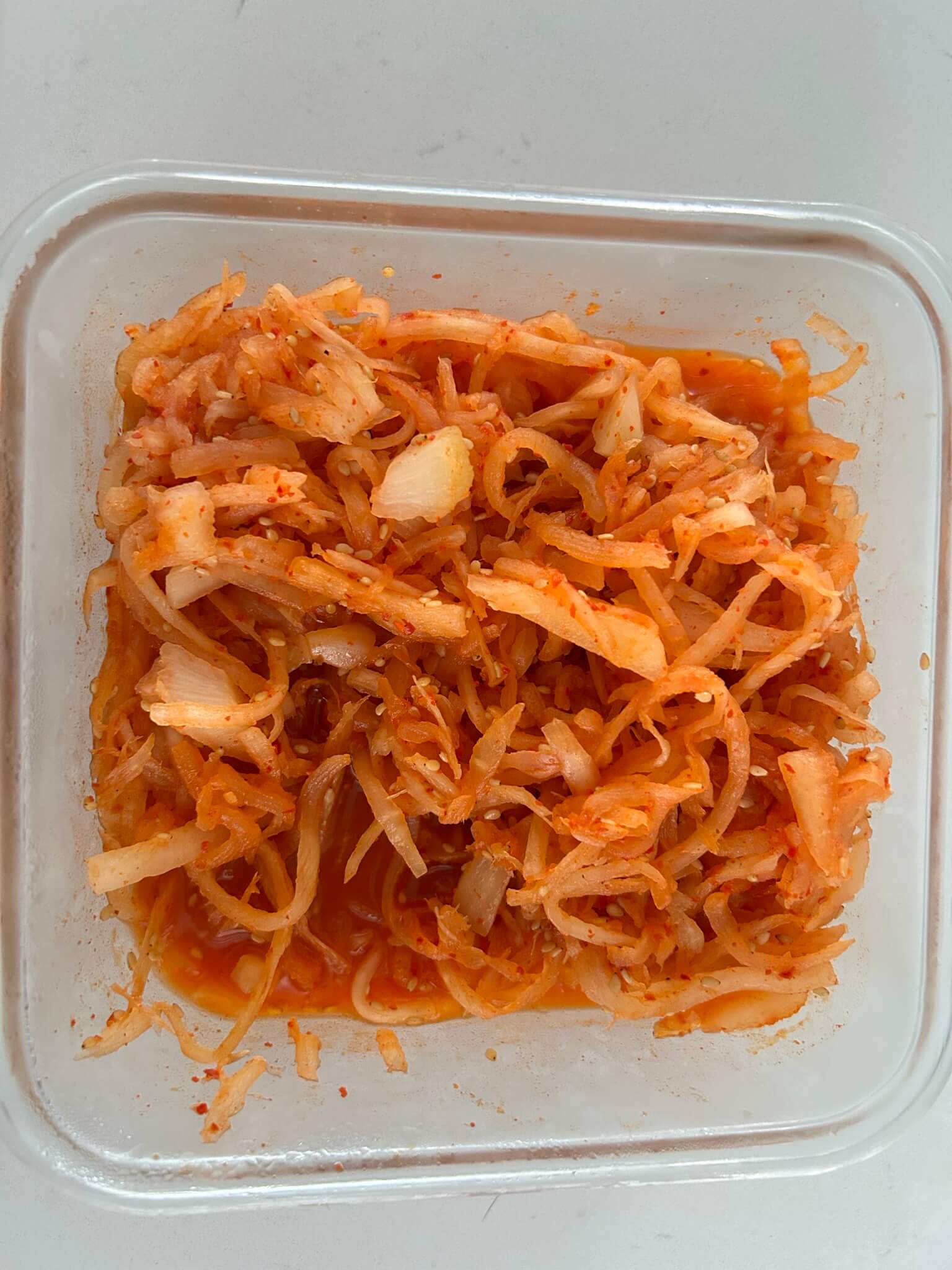 6. 완성된 무생채는 반찬통에 담아 냉장보관합니다.